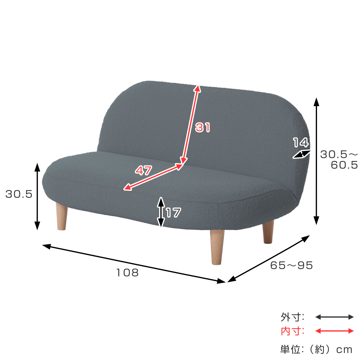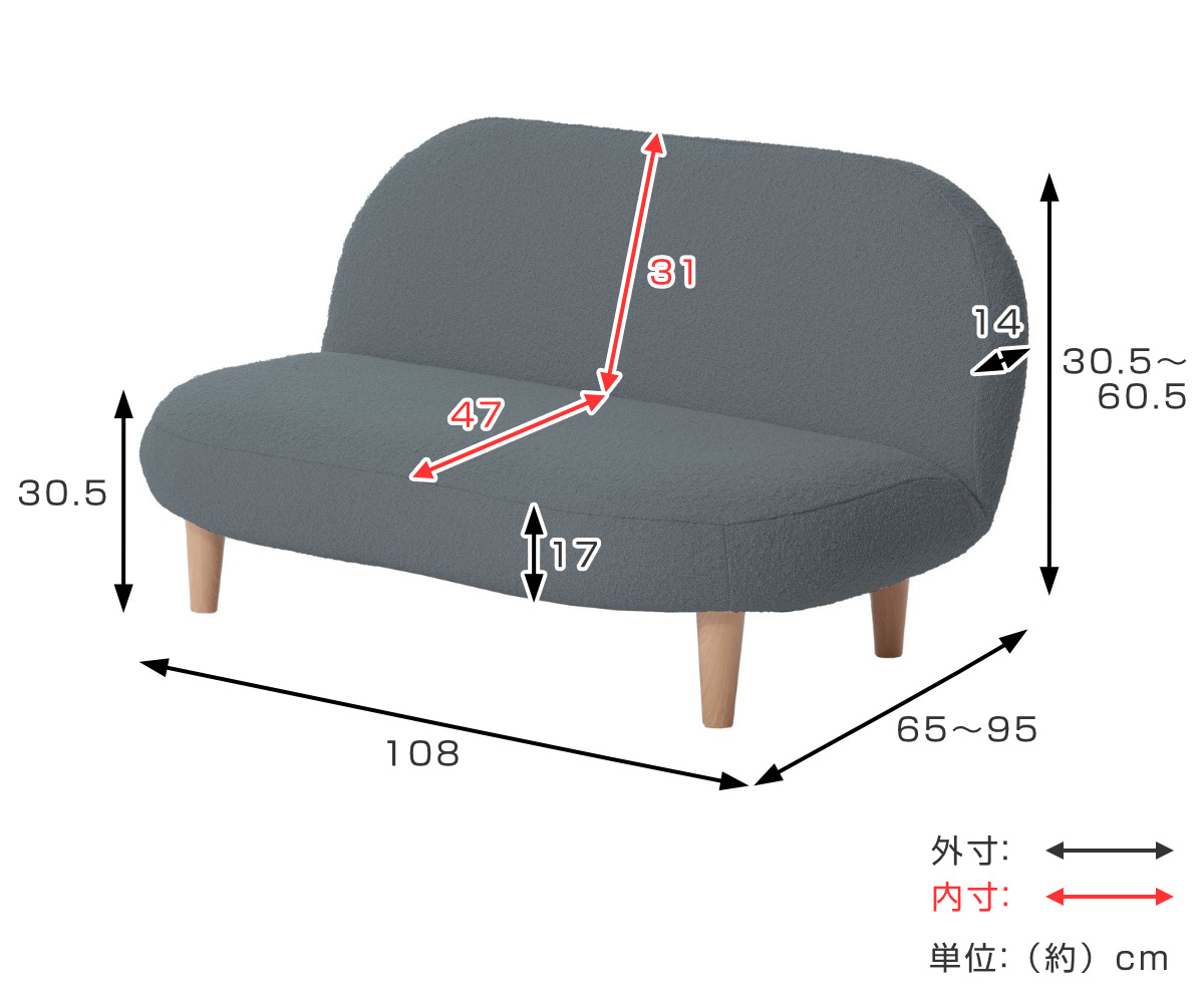| サイズ | 座面高:約 30.5(cm) 約 幅108×奥行65~95×高さ30.5~60.5(cm) |