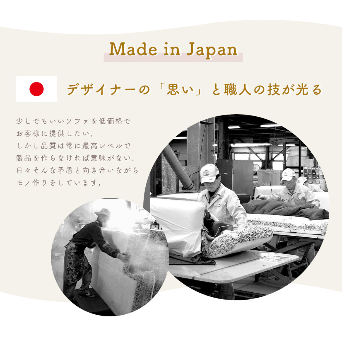 デザイナーの「思い」と職人の「技」が光る、こだわりのソファです。日本製の安心と確かな品質をお楽しみください。