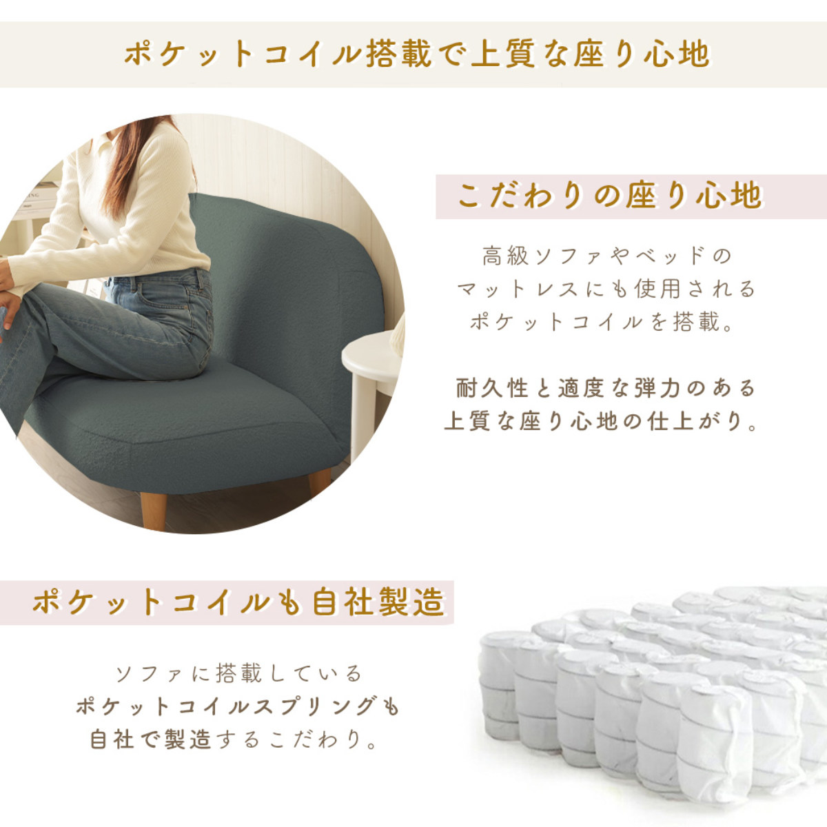 こだわりの自社製造のポケットコイルスプリングを内蔵しているため、耐久性と適度な弾力のある上質な座り心地になっています。