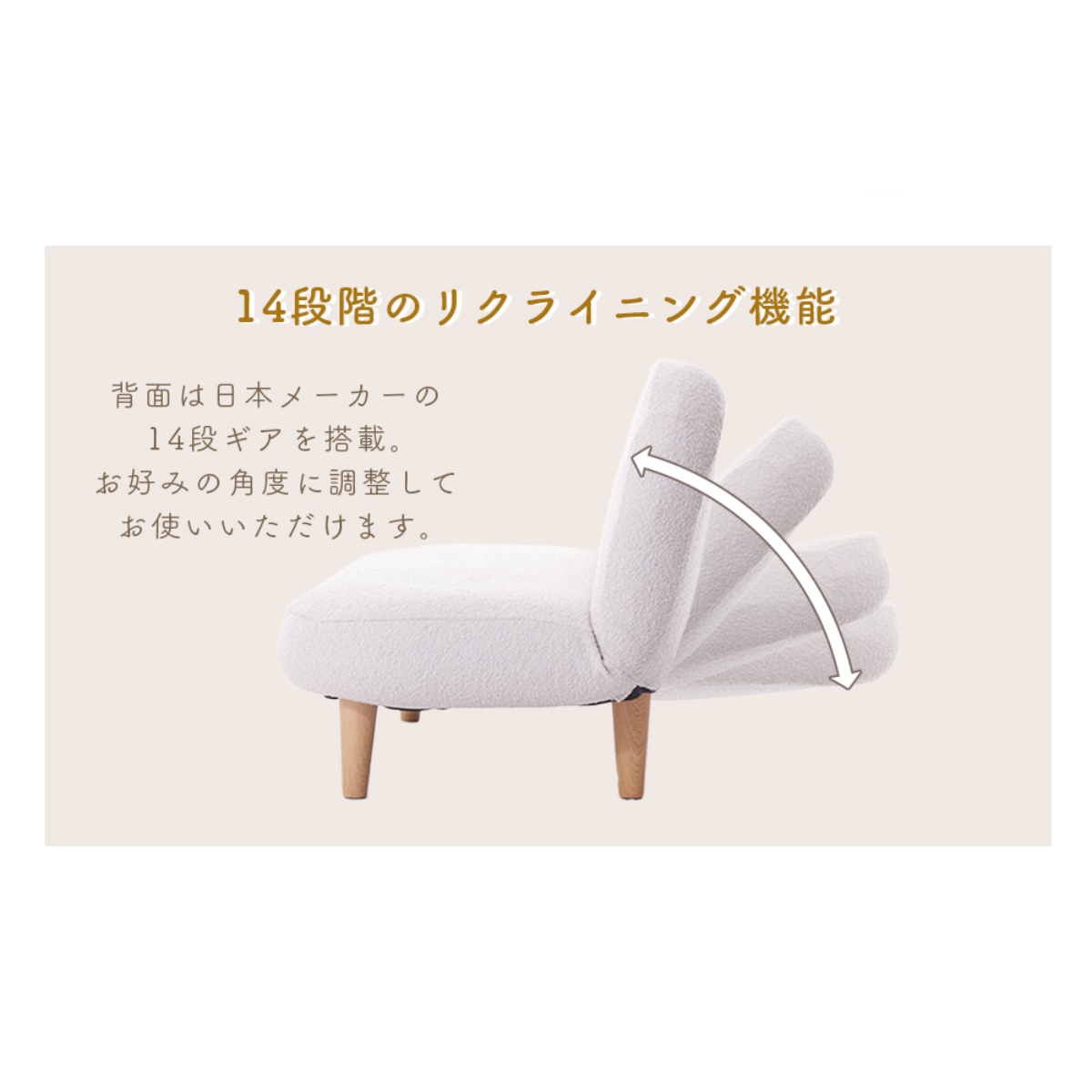ソファの背面にはスムーズに角度を変えられる国内メーカー14段階ギアを搭載しています。お好みの角度で自分だけのリラックスタイムをお楽しみいただけます。