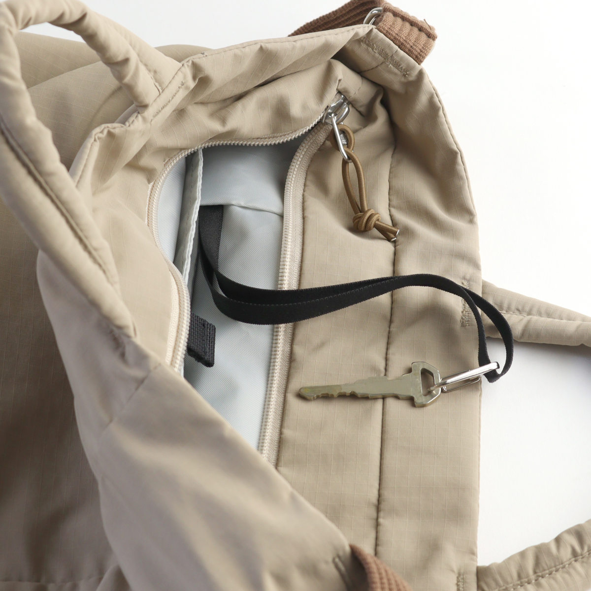 メイン収納内には、キークリップが付いています。鍵やパスケースなどを掛けておけば、バッグの中で迷子にならずさっと取り出せます。