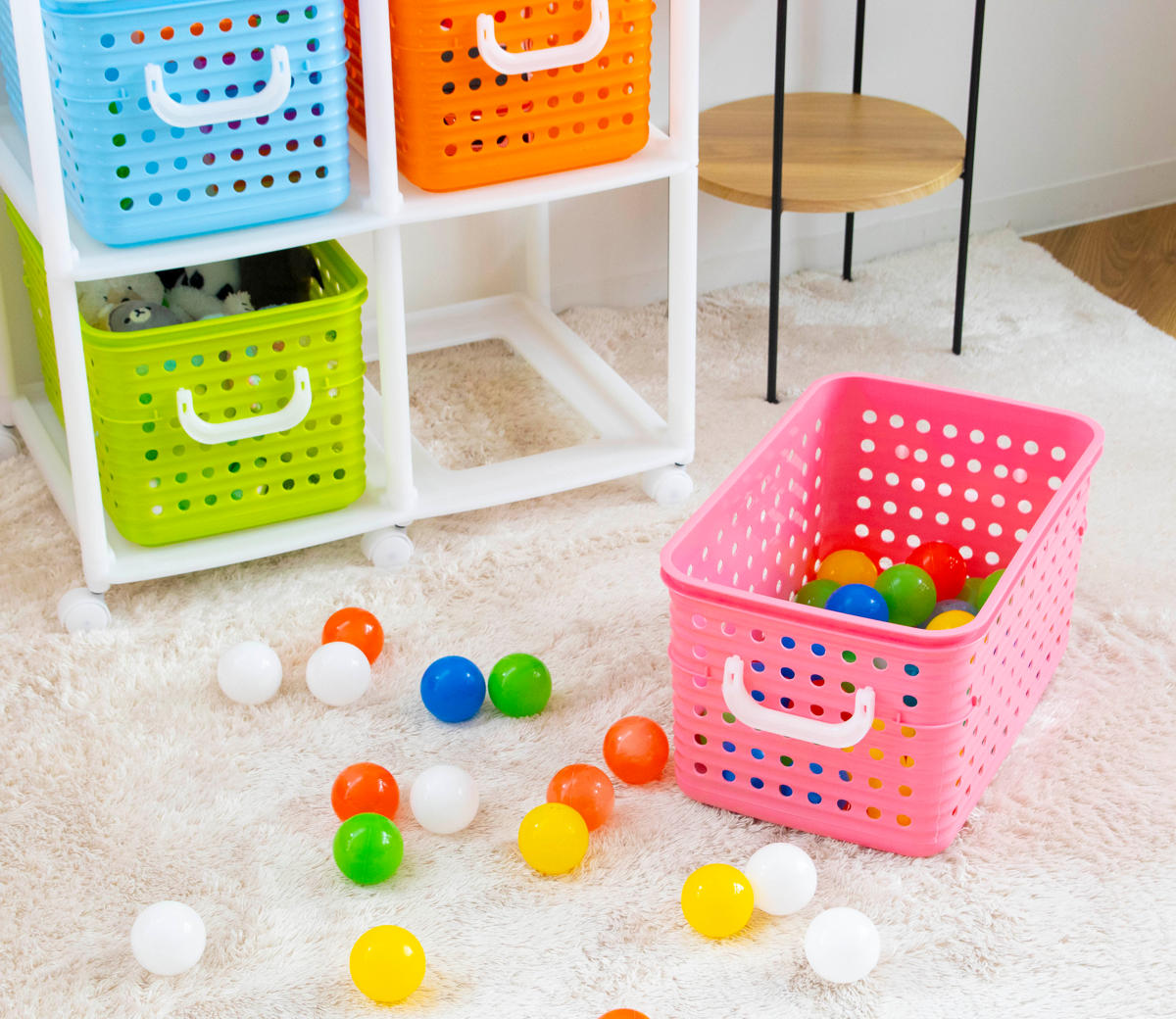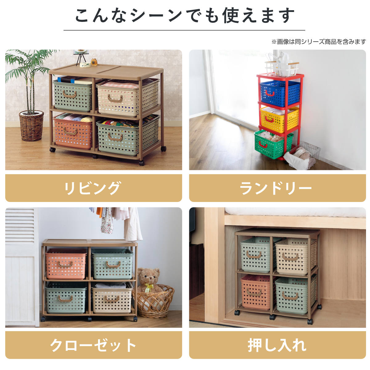 また、畳んだ家族の洗濯物をバスケットの色別に振り分け、各自で片付けてもらう用のケースとして使うなど、アイディア次第で収納以外にも幅広い用途でお使いいただけます。