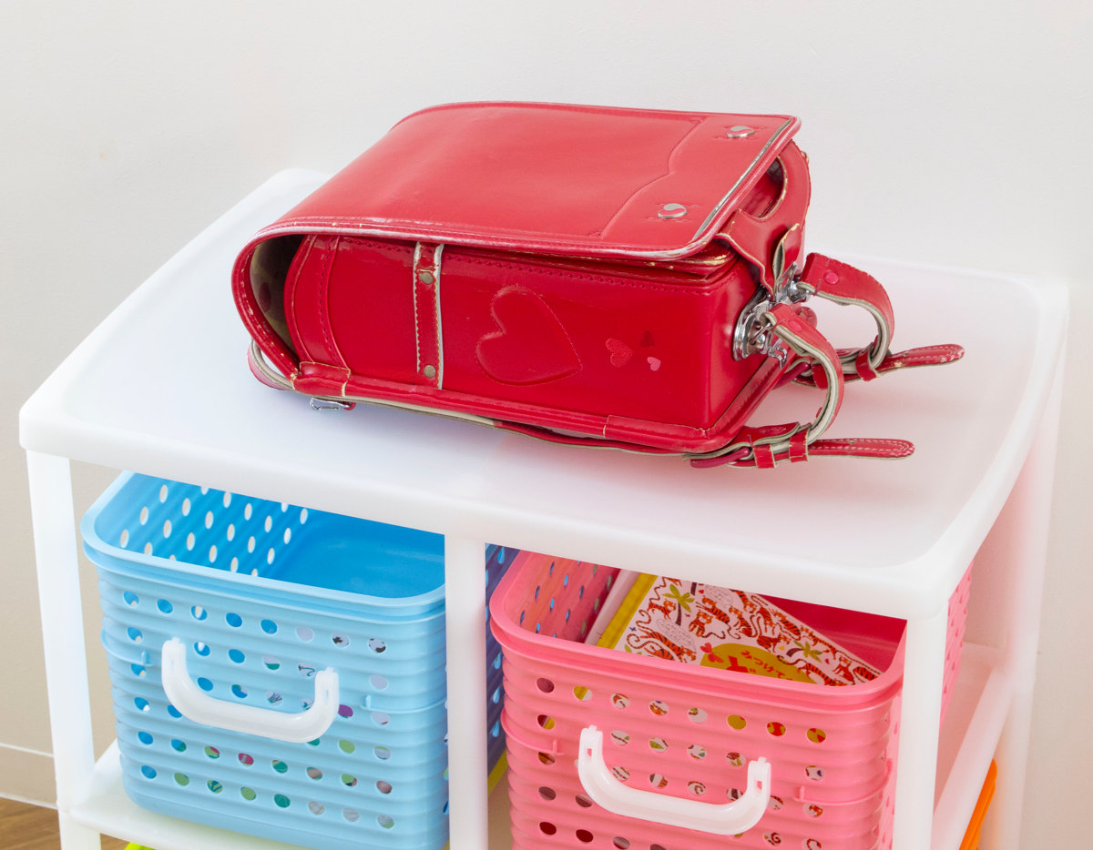 バスケットに入らない大きなサイズのおもちゃは、天板置くことで飾りながら収納できます。ランドセルも載せられるサイズの天板なので、幼少期から児童期まで長くお使いいただけます。