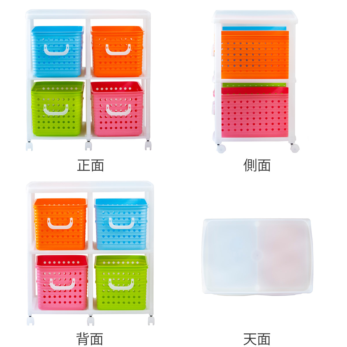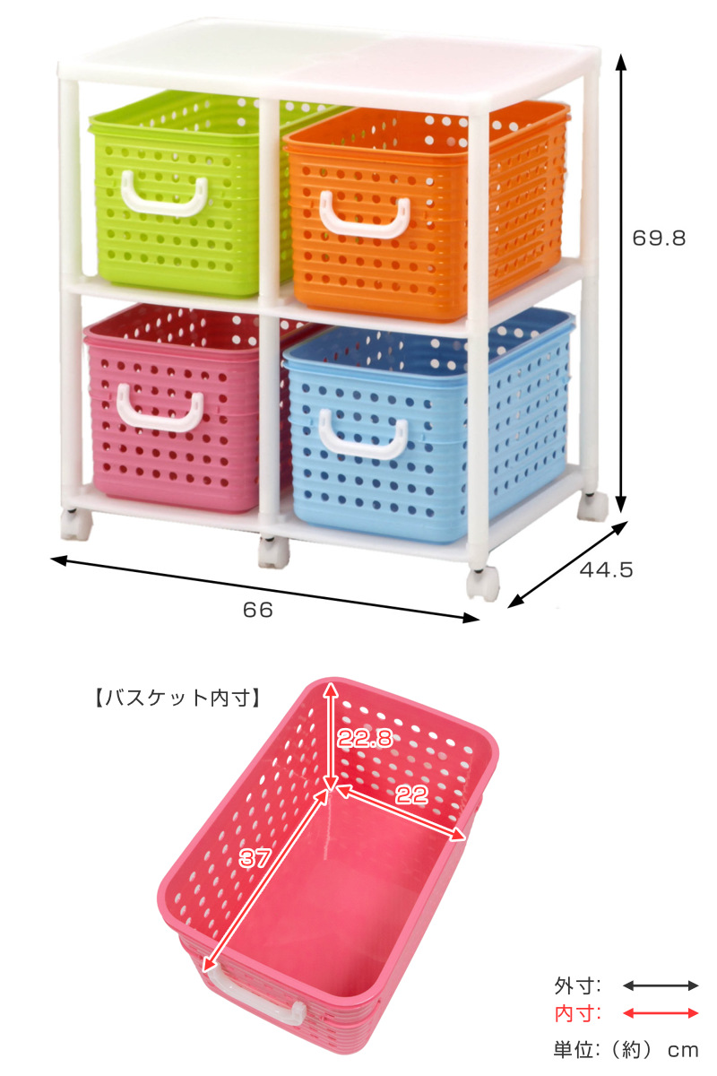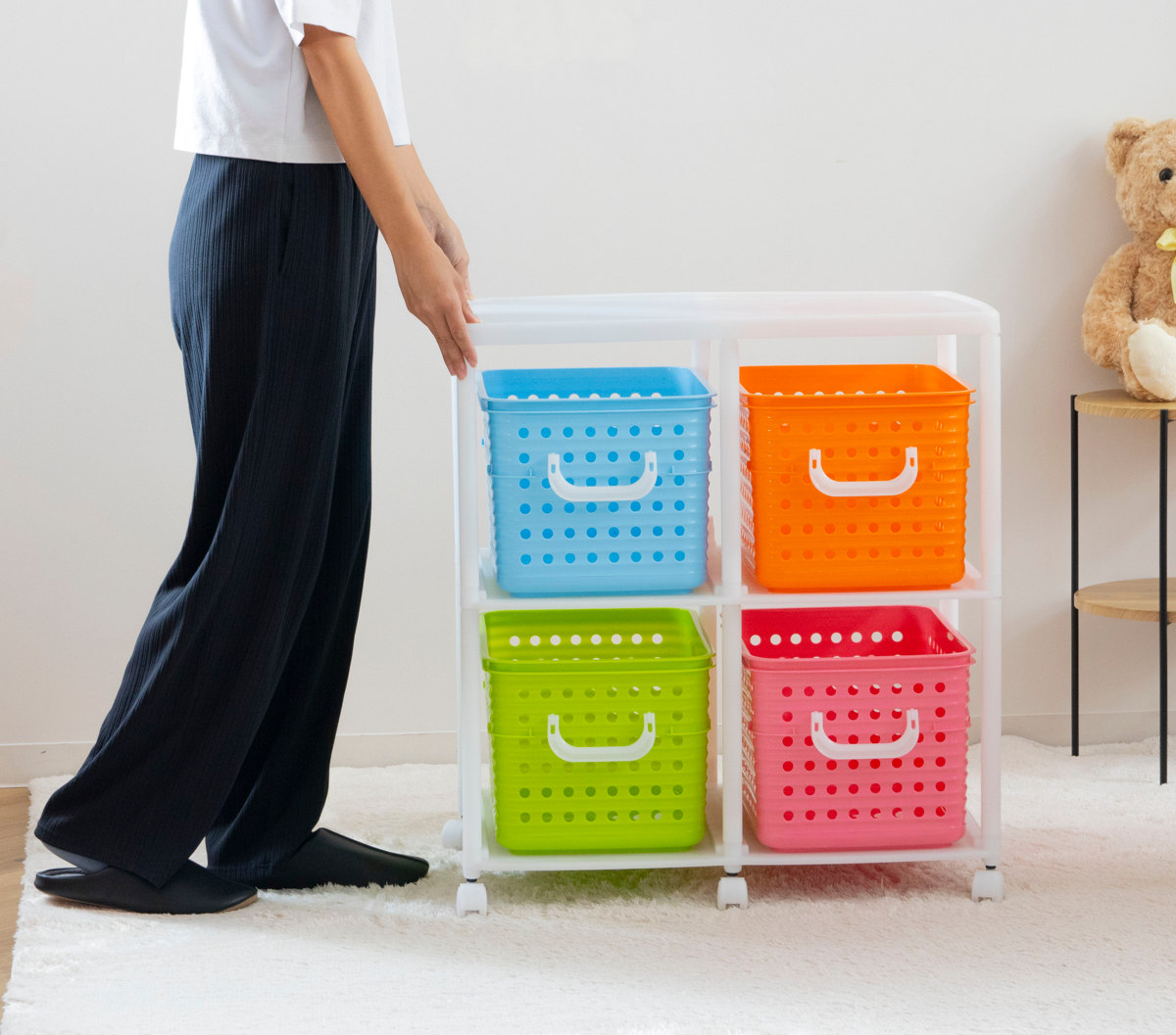 4つのカラフルなバスケットが入った2段のバスケットラックは、お子様のお片付け習慣をサポートします。色で分けて収納するものを決められるので、小さなお子様でも覚えやすく、ゲーム感覚で楽しくお片付けの習慣が身に付きます。フタのないシンプルな形状のバスケットで、お子様が自分でおもちゃを片付けやすくなっています。