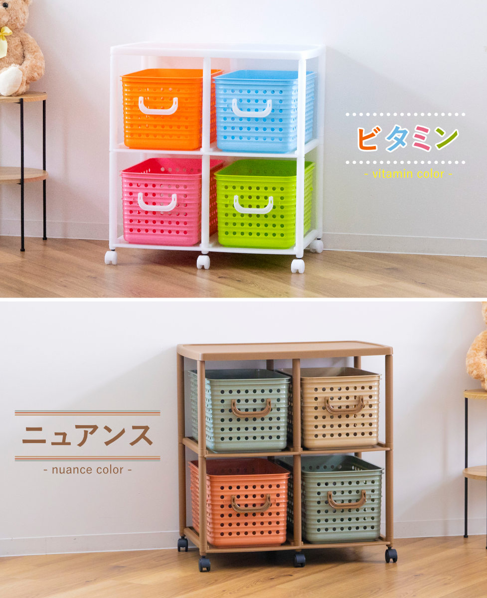 バスケットラックは、明るいカラフルな色合いで子供部屋にもピッタリな「ビタミン」と、くすみカラーで落ち着いた「ニュアンス」の2カラー展開しています。お部屋の雰囲気や、お好みに合わせてお好きなカラーをお選びいただけます。