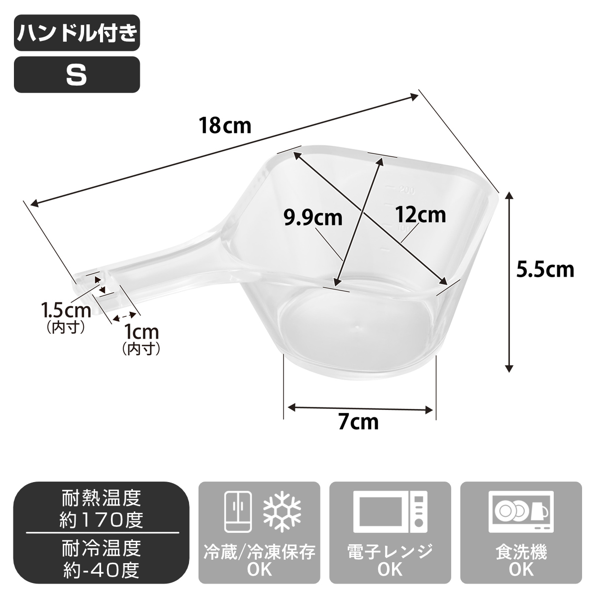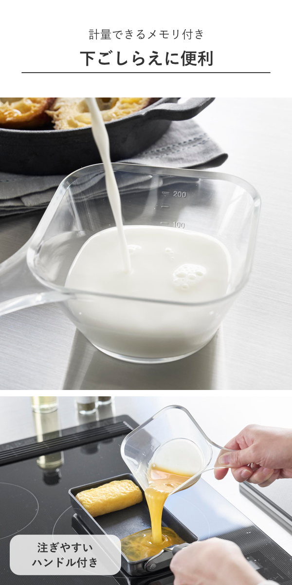 軽くて扱いやすく、メモリ付きで計量ができるハンドル付きのボウルSサイズです。片手で持ちやすく注ぎやすい形状で水切れがよく、自家製ドレッシング作りや出汁作りなどにも便利です。