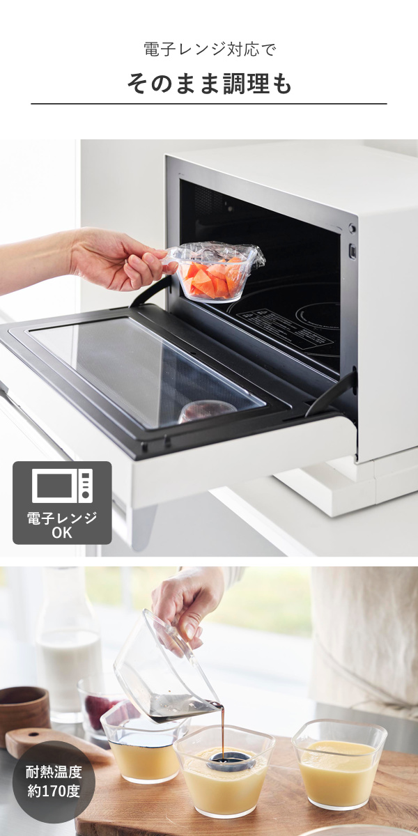 電子レンジ対応なので、計量や下ごしらえのあとそのまま調理ができます。お菓子作りの際にも便利です。