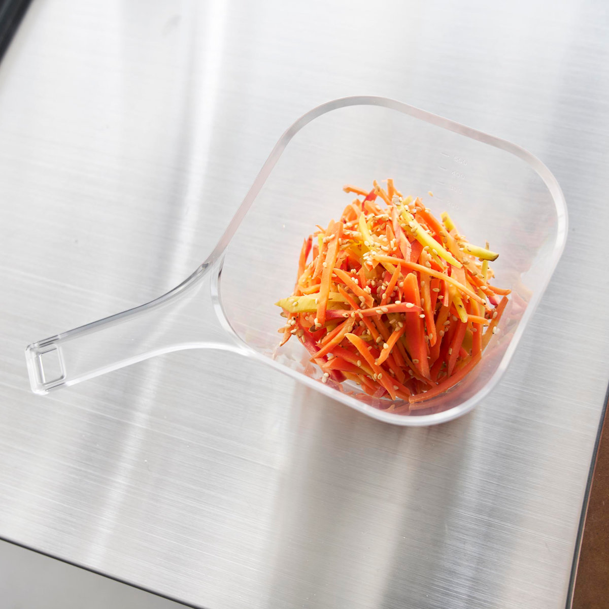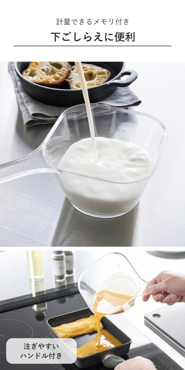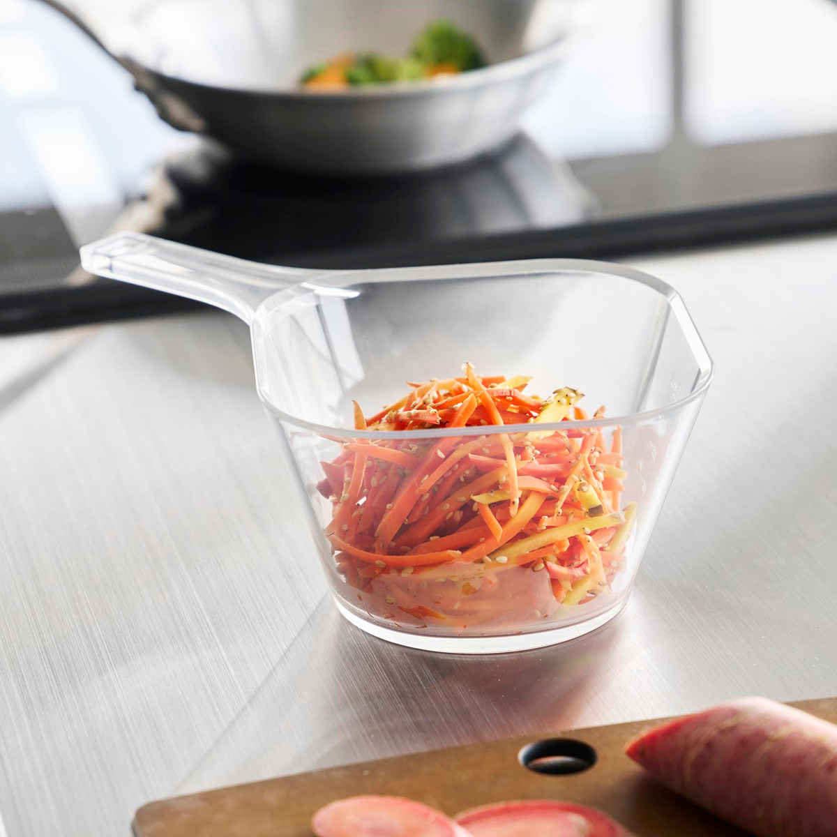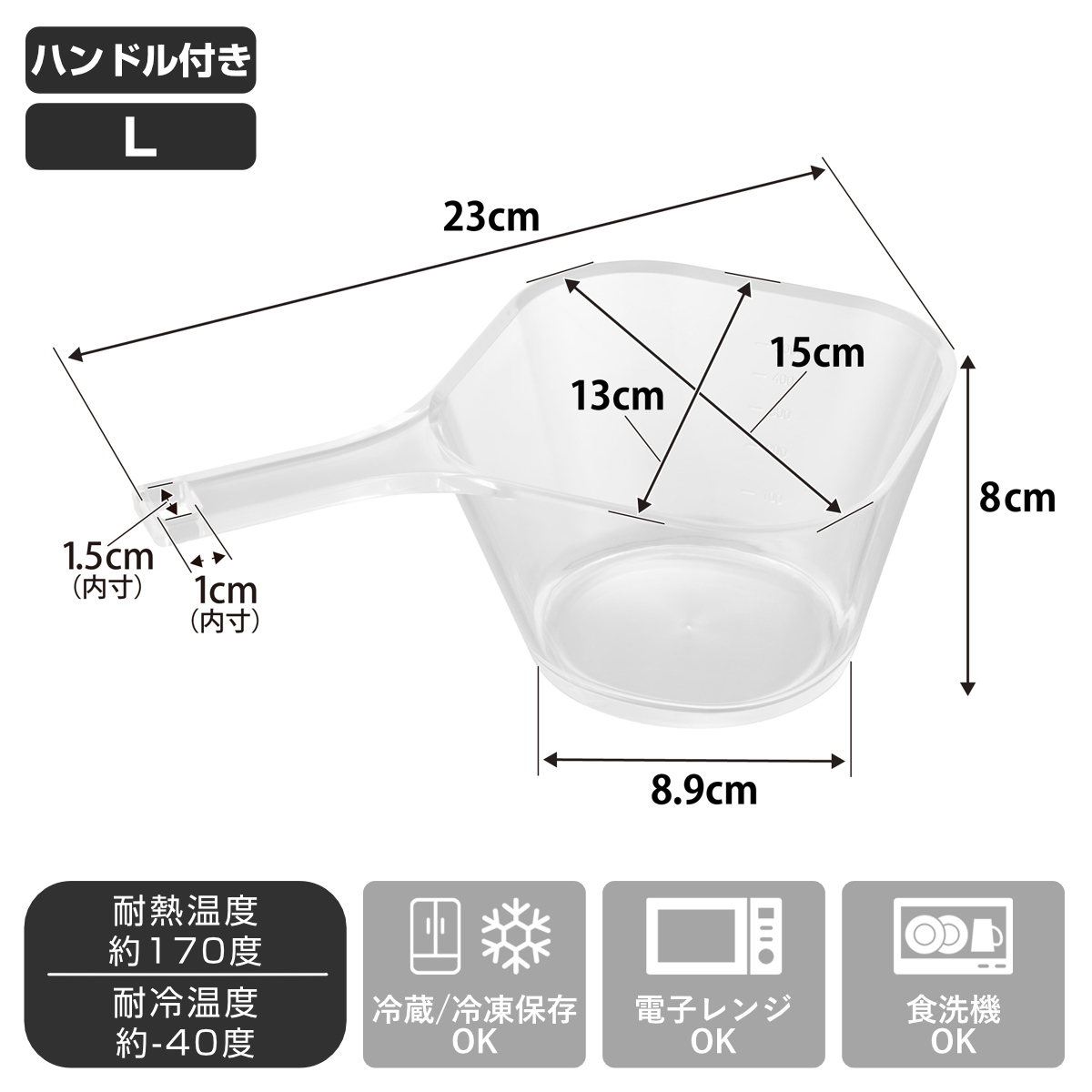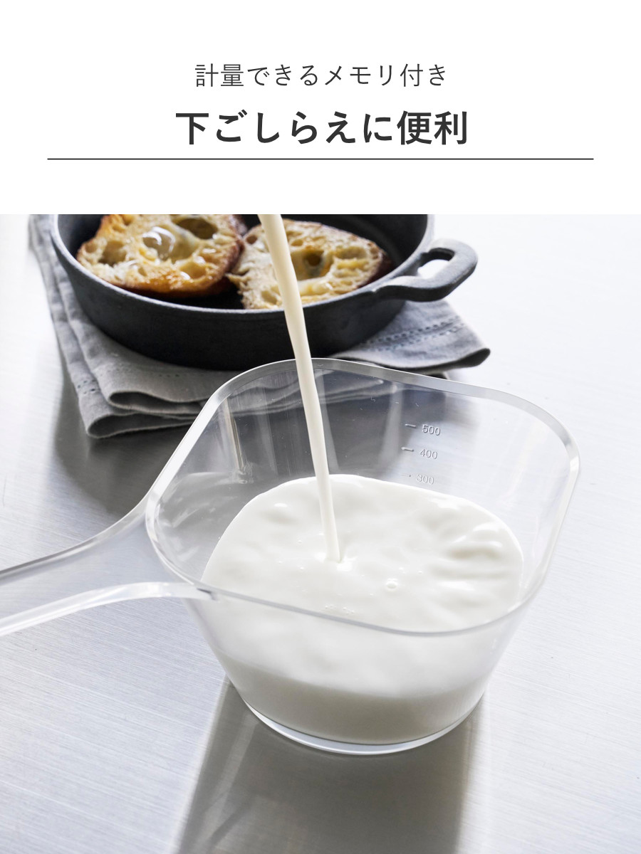 軽くて扱いやすく、メモリ付きで計量ができるハンドル付きのボウルLサイズです。片手で持ちやすく注ぎやすい形状で水切れがよく、自家製ドレッシング作りや出汁作りなどにも便利です。