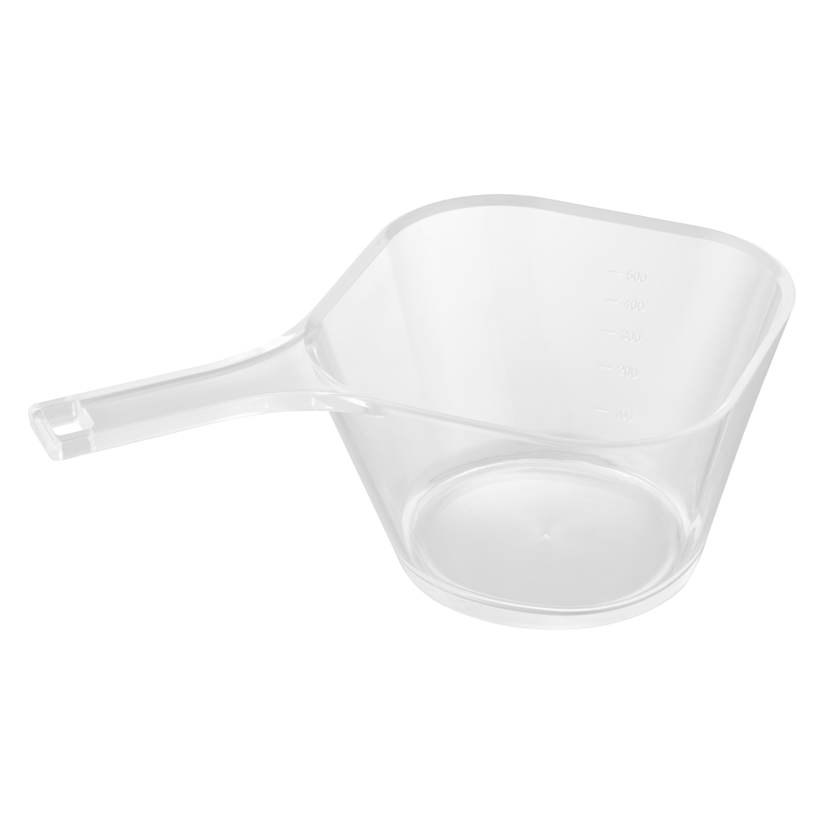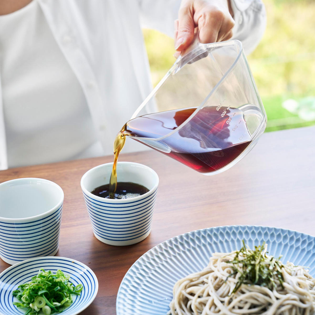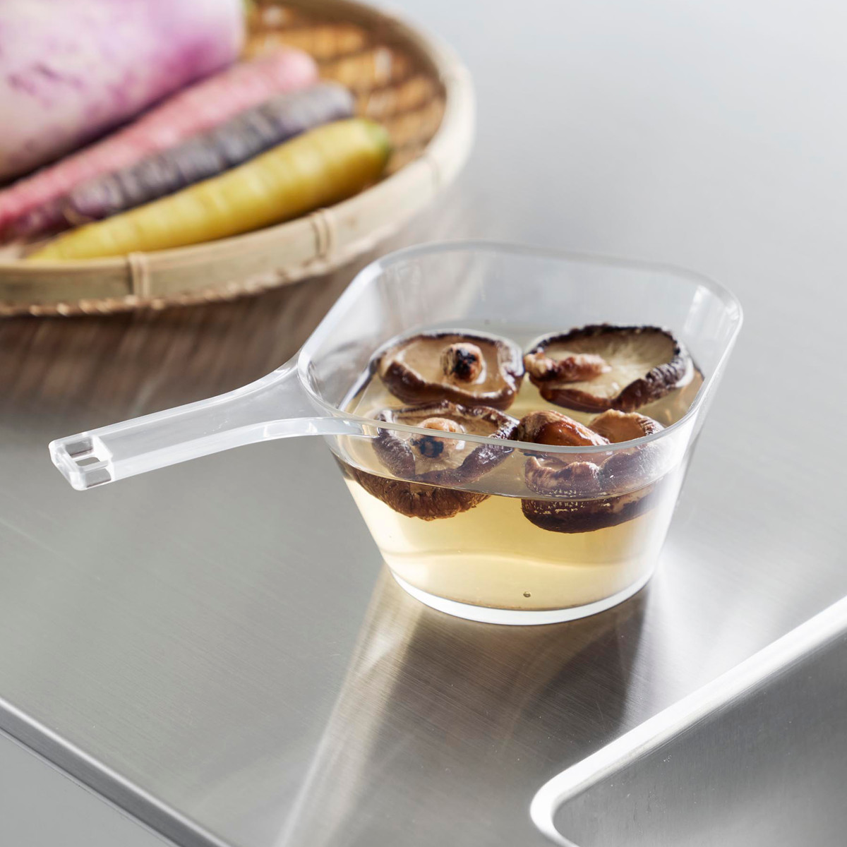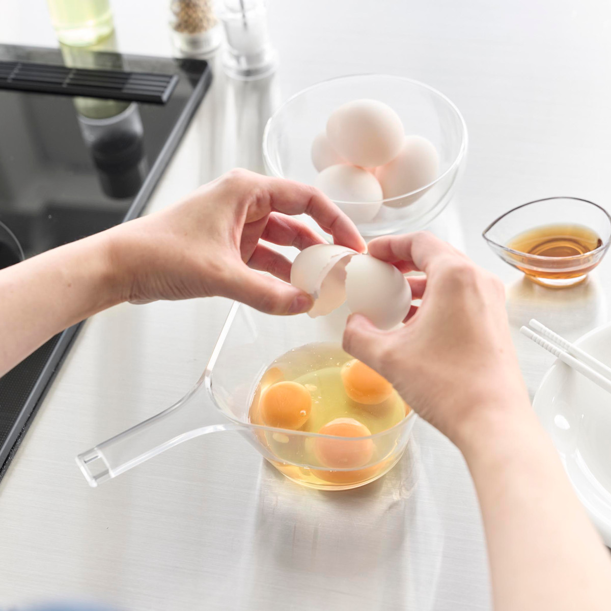 軽くて扱いやすく、メモリ付きで計量ができるハンドル付きのボウルLサイズです。片手で持ちやすく注ぎやすい形状で水切れがよく、自家製ドレッシング作りや出汁作りなどにも便利です。
