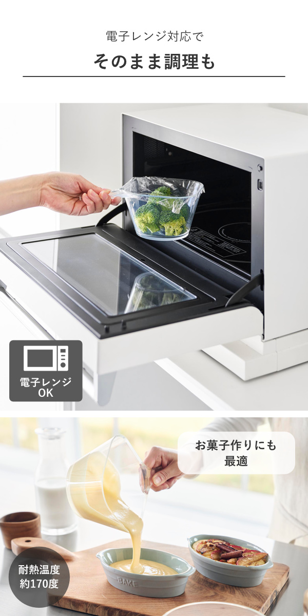 電子レンジ対応なので、計量や下ごしらえのあとそのまま調理ができます。お菓子作りの際にも便利です。