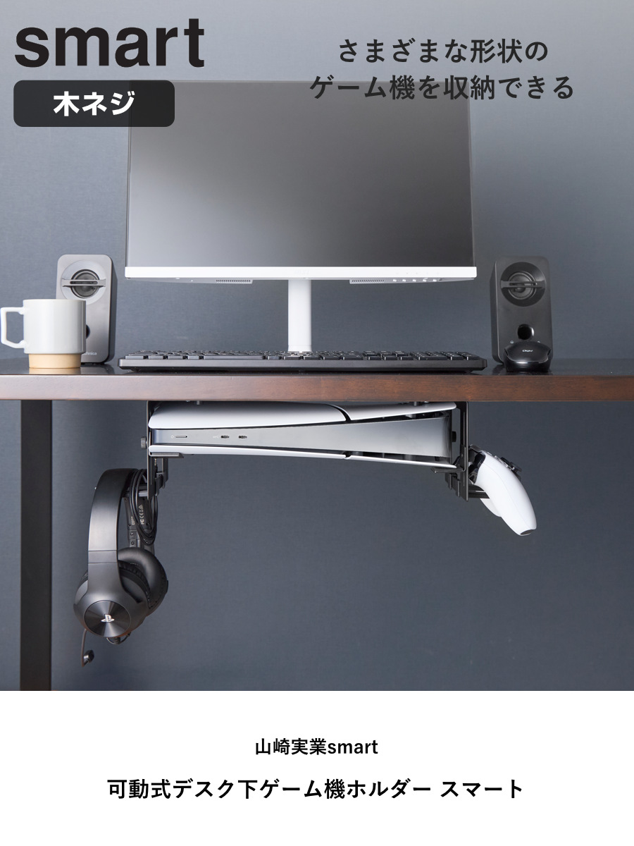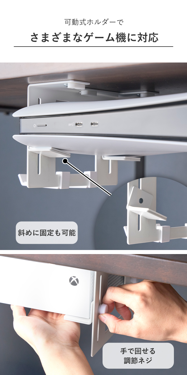 デスクやテーブル、キッチンカウンター下に木ネジを使って取り付けるゲーム機ホルダーです。場所をとるゲーム機をデスク下に収納できます。浮かせられるのでほこりが溜まりにくく床のお掃除もラクラクです。
