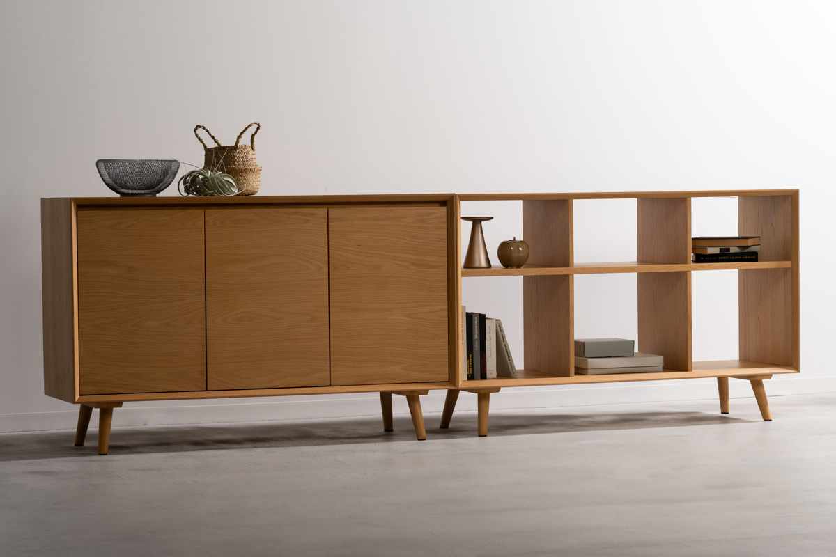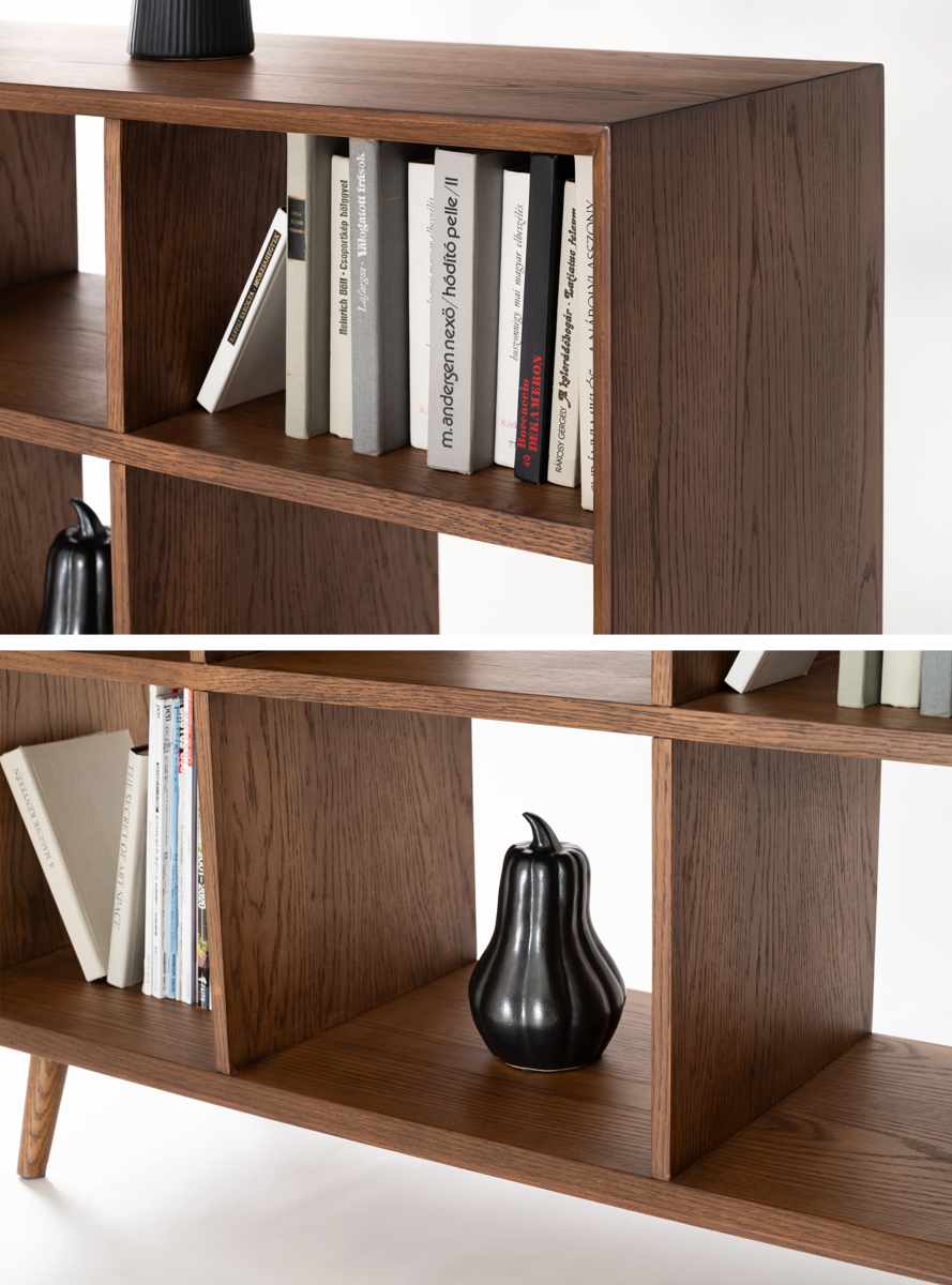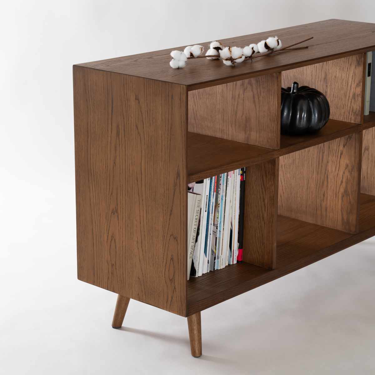 天然木の風合いを活かした、北欧テイスト漂うシェルフです。背板のない抜け感のあるつくりは、お部屋に開放感をもたらし、間仕切りとしても活躍します。上下段で高さを変えたアンバランスな構成も、遊び心あふれるアクセントに。インテリアに映える一台です。