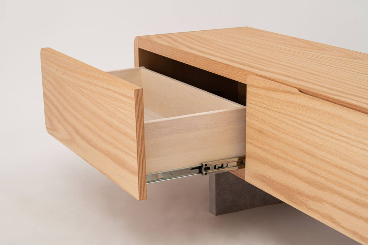 引き出しの前板は木目が繋がるようにデザインされたローボードです。丸みのある天然木の優しさと、脚部の石目調の力強さが組み合わさった、異素材の調和を感じる仕上がり。石目調×木目の美しい組み合わせで、和モダンな空間作りをお楽しみください。