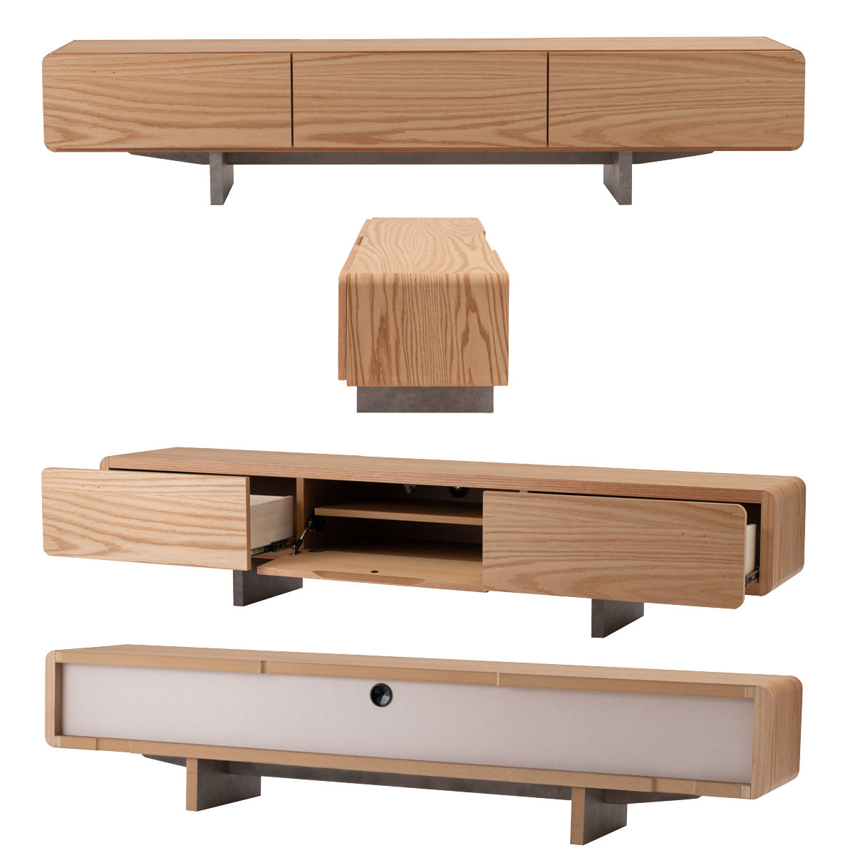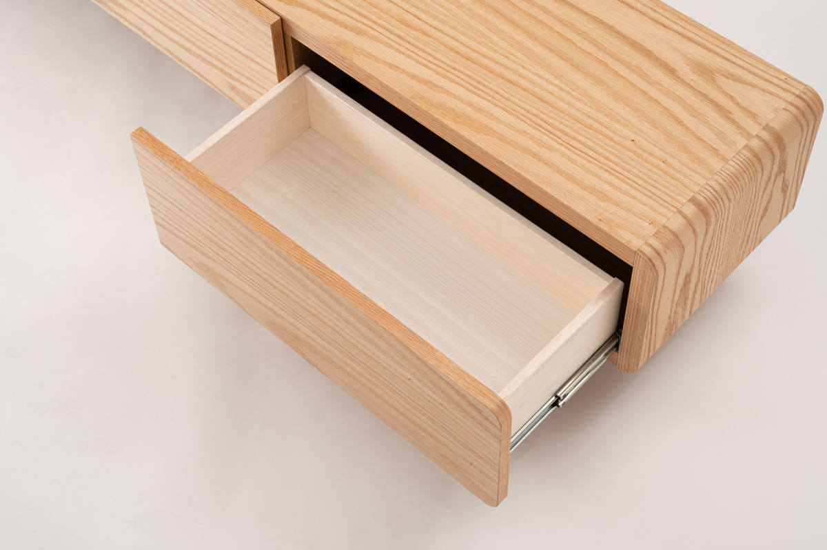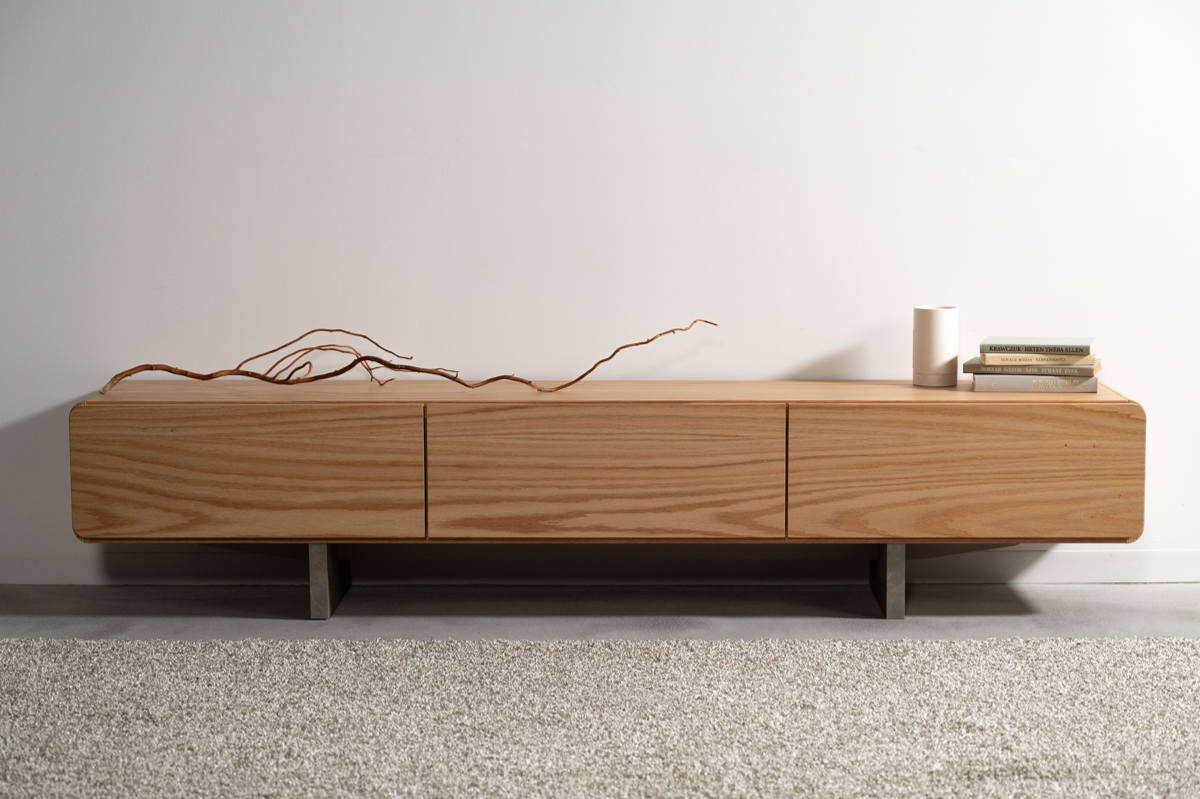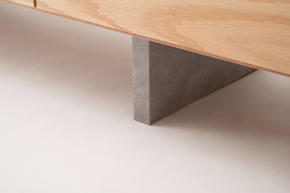 丸みのある天然木と、石目調の力強さが調和したローボード