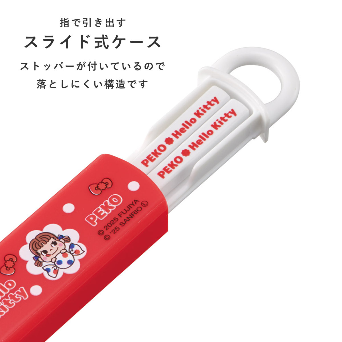 ケースは指で引き出すスライド式で、衝撃に強く丈夫な構造です。本体から抜け落ちを防ぐストッパー付きです。
