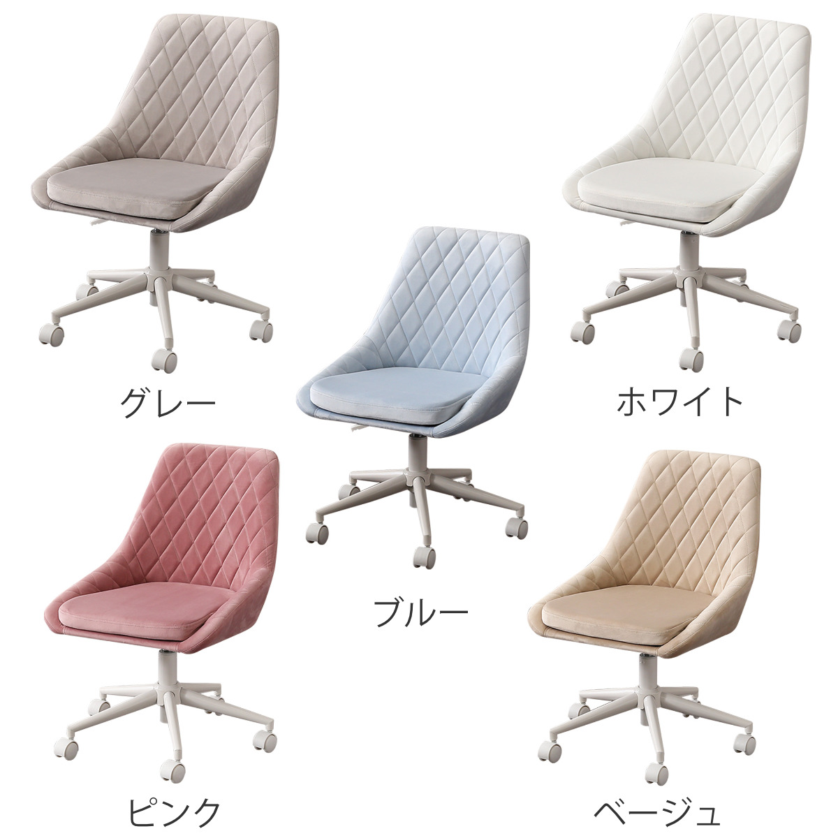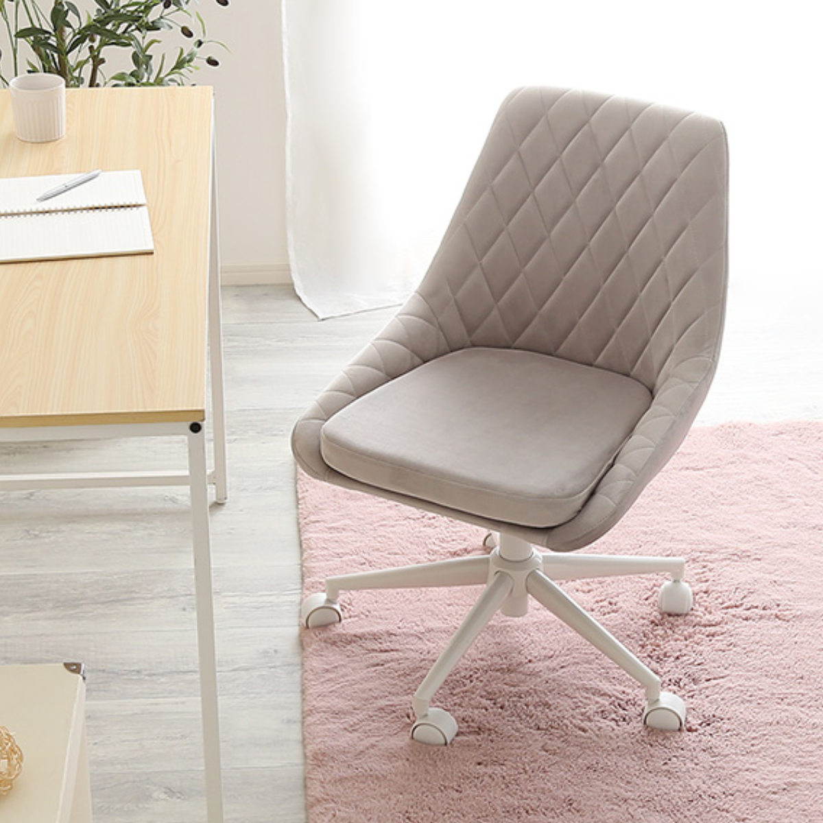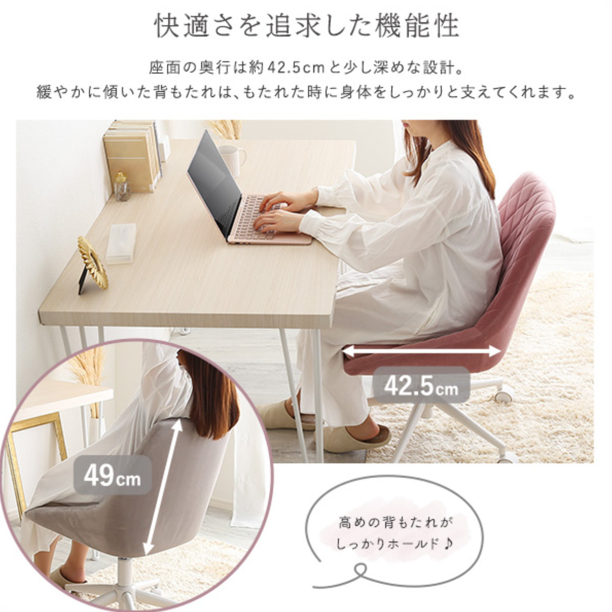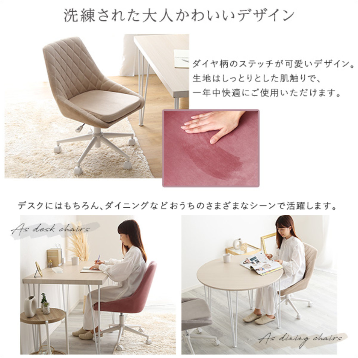 ダイヤ柄のステッチが可愛いデスクチェアです。見た目の華やかさだけでなく、肌触りの良いスエード調の生地と、長時間座っていても疲れにくいふかふかな座面も大きな魅力。デザイン性と快適さを兼ね備えた椅子が暮らしに彩りをプラスします。