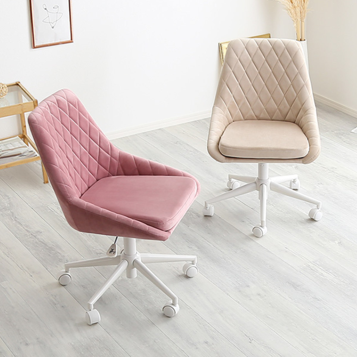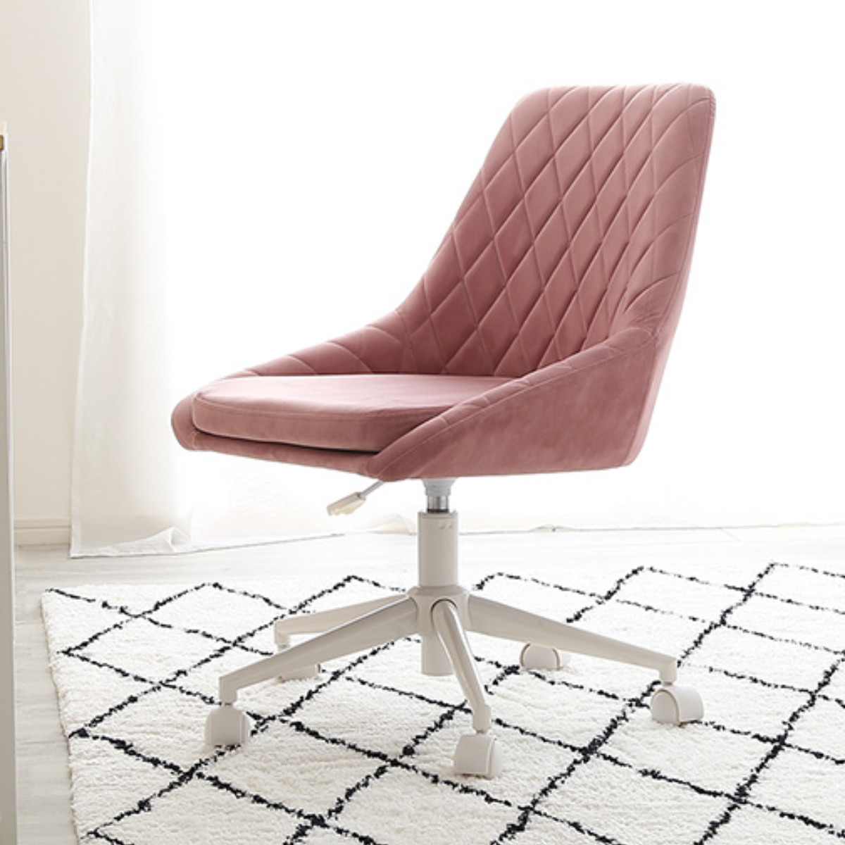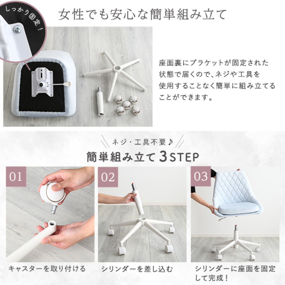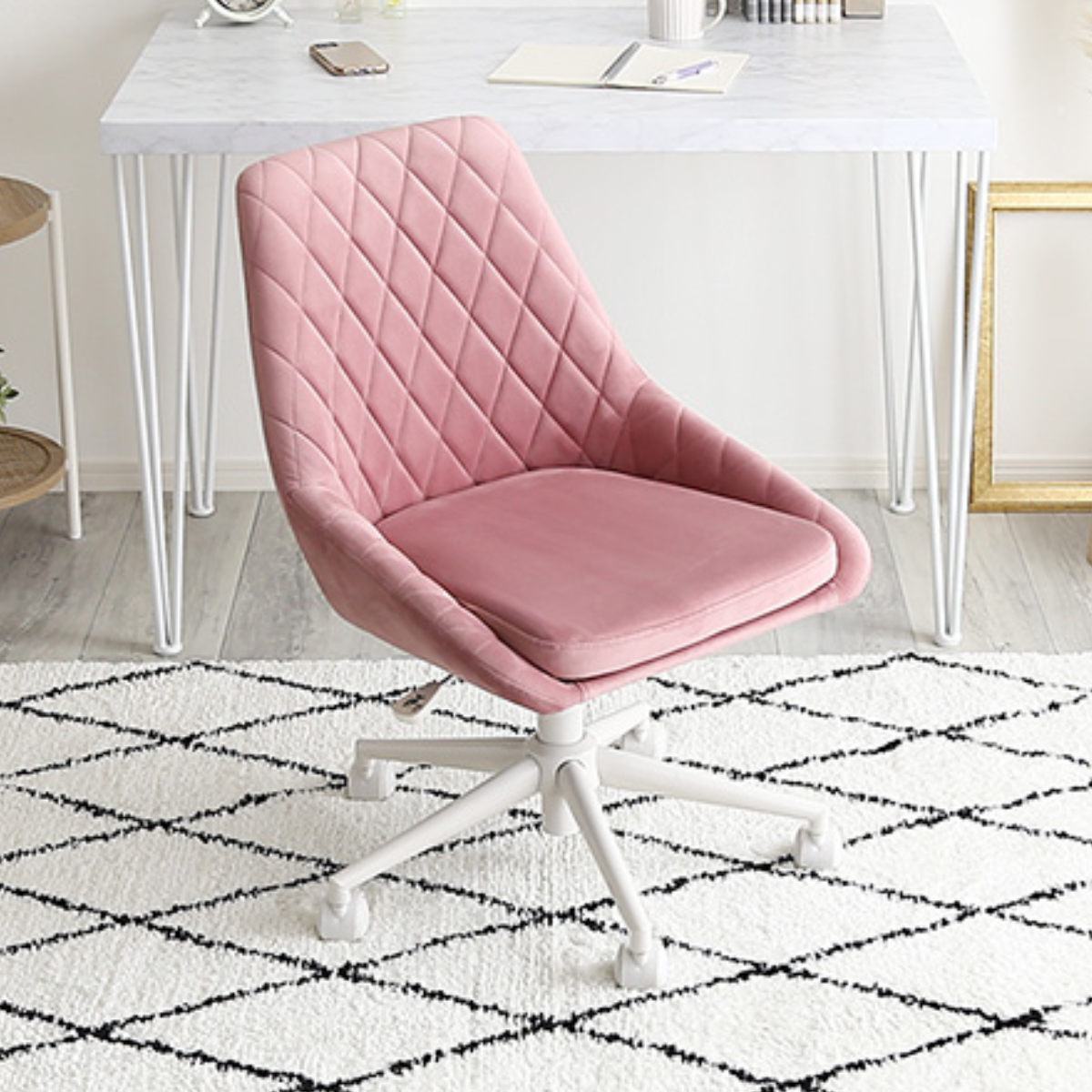 ダイヤ柄のステッチが可愛いデスクチェアです。見た目の華やかさだけでなく、肌触りの良いスエード調の生地と、長時間座っていても疲れにくいふかふかな座面も大きな魅力。デザイン性と快適さを兼ね備えた椅子が暮らしに彩りをプラスします。