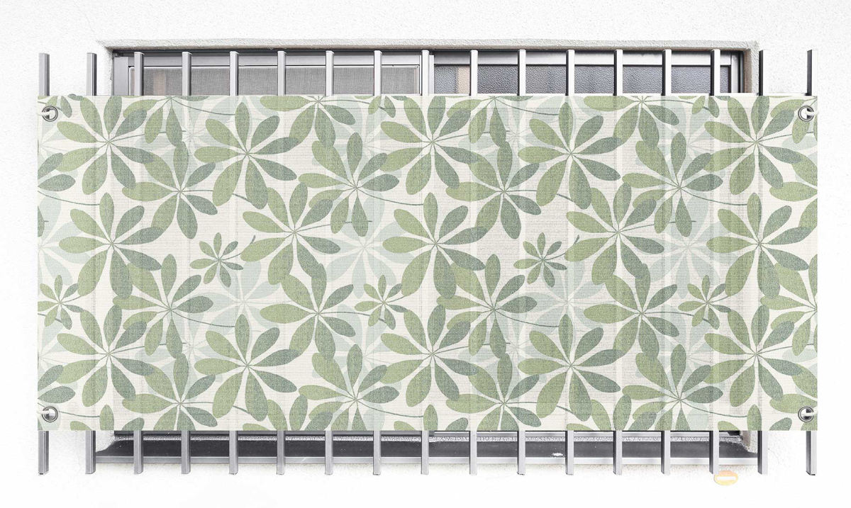 景観を損ねない淡いリーフ柄が、隣家や道路、マンション通路などからの視線を優しくブロックし、プライバシーを守ってくれます。遮光率75%、UVカット率90%とほどよく日差しを抑え、しっかり紫外線から家具や植物を守ります。