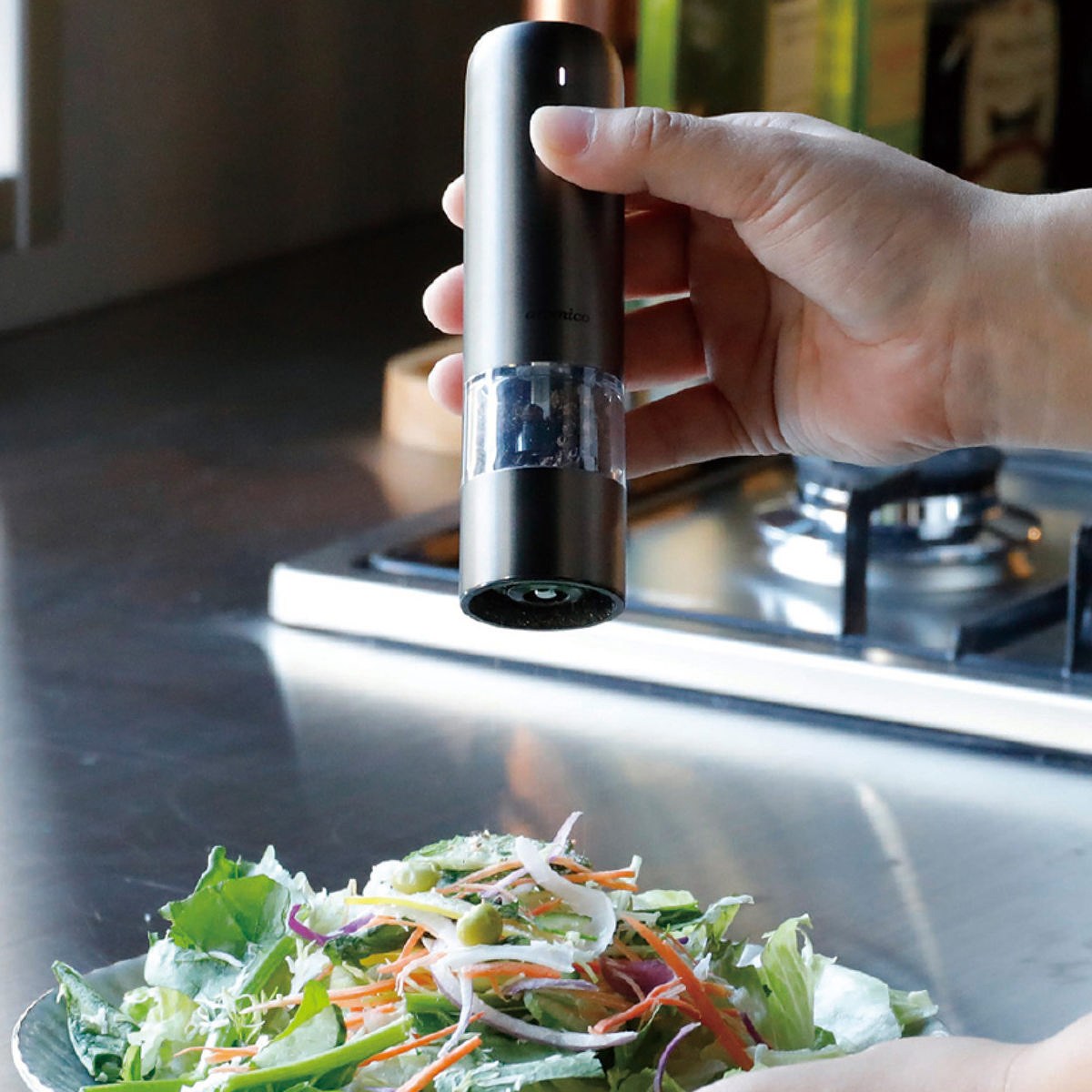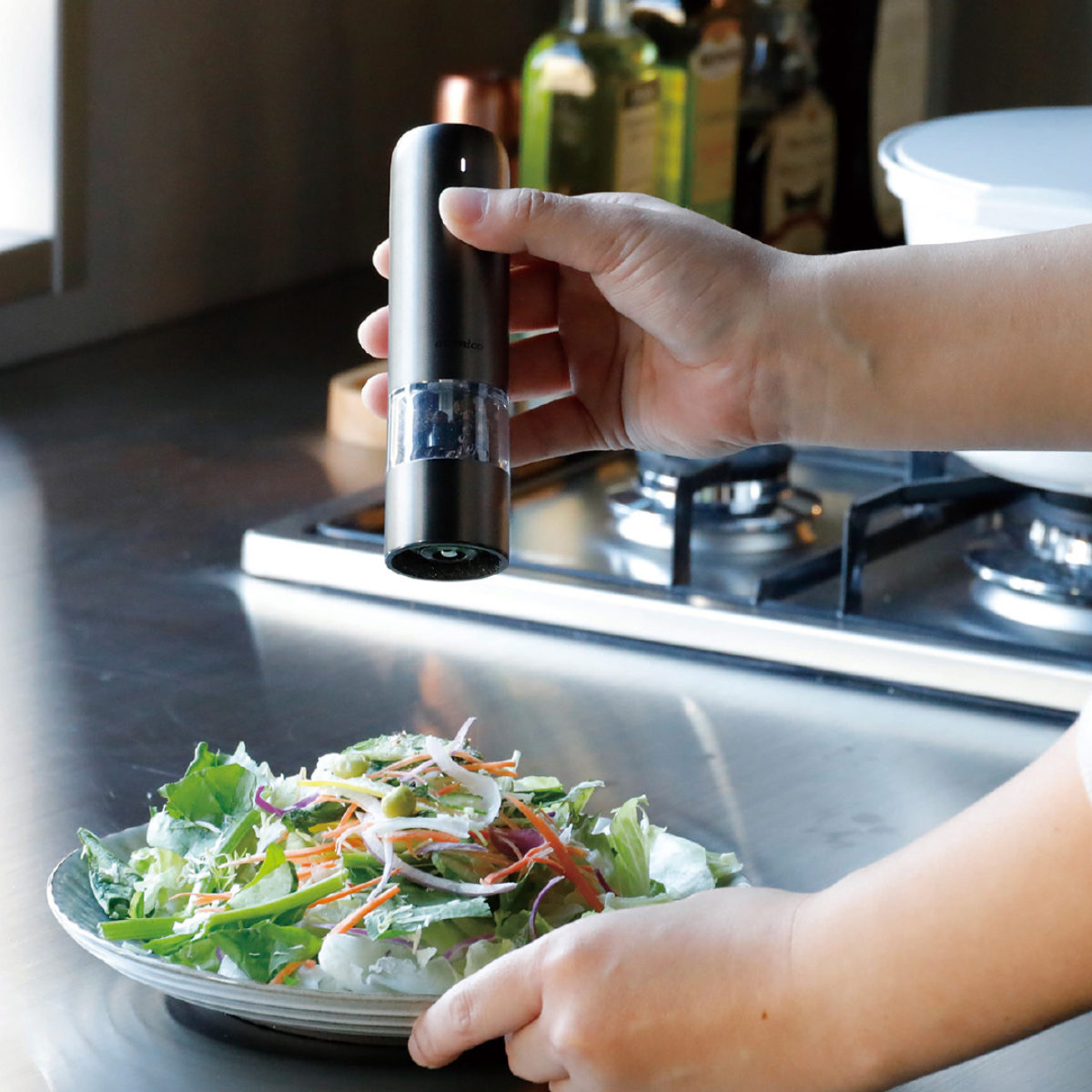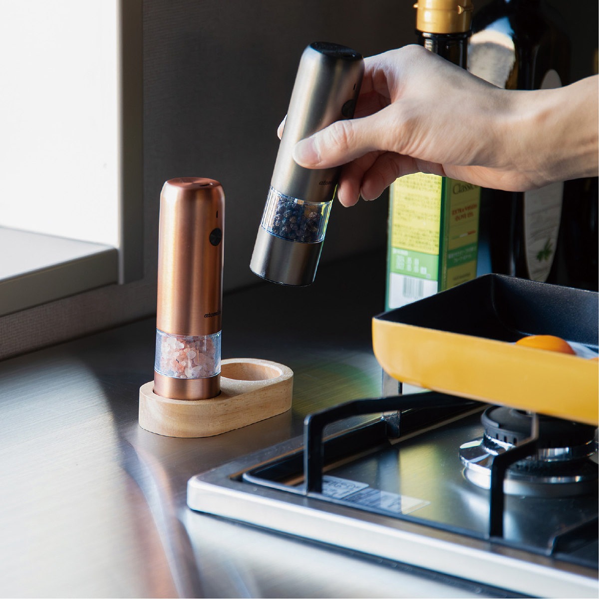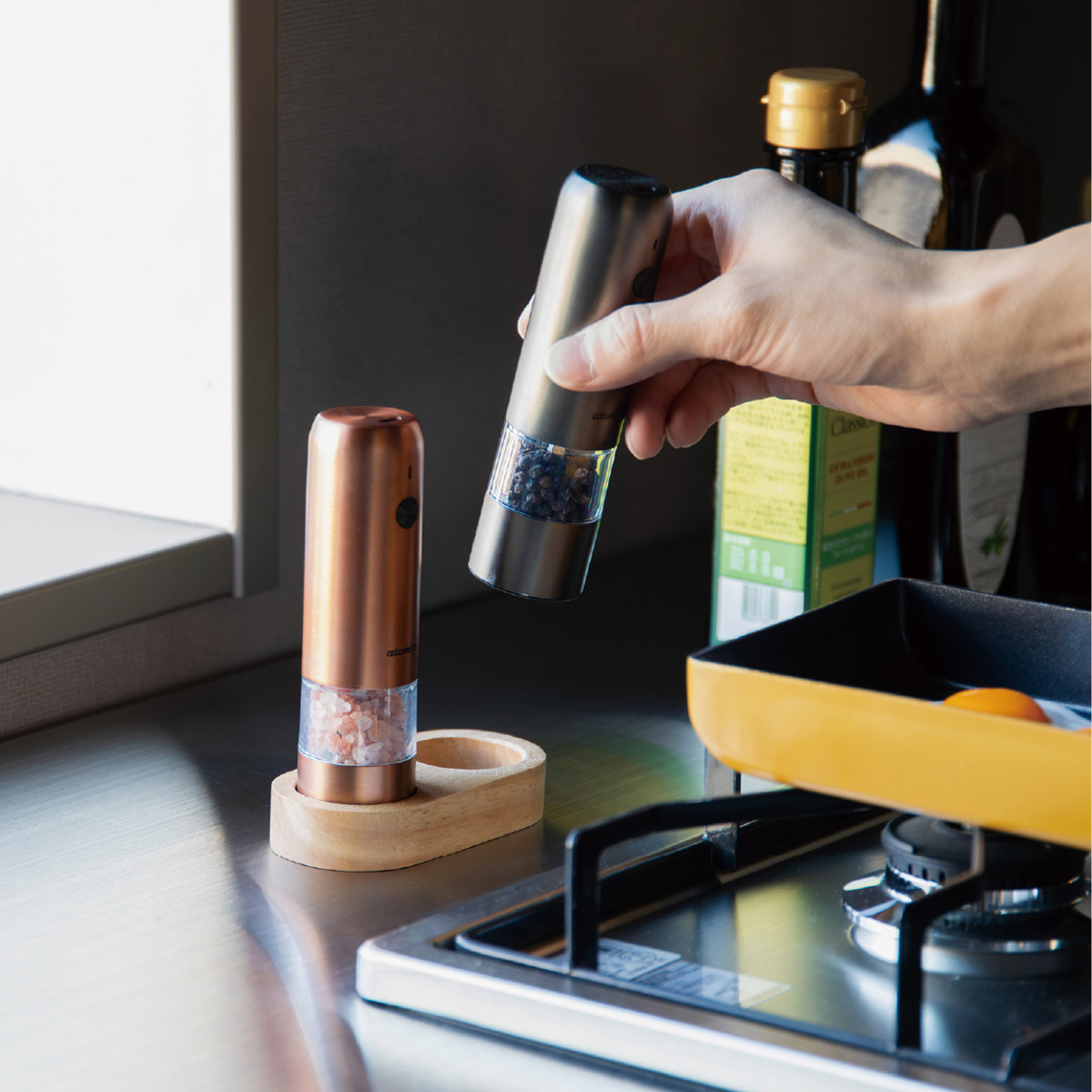 ステンレス製の電動ソルト&ペッパーミルです。スイッチを押すと自動でスパイスが挽かれて出てくるので、調理中も手を止めることなく、片手でサッと味付けができます。