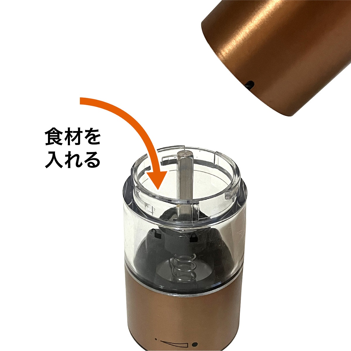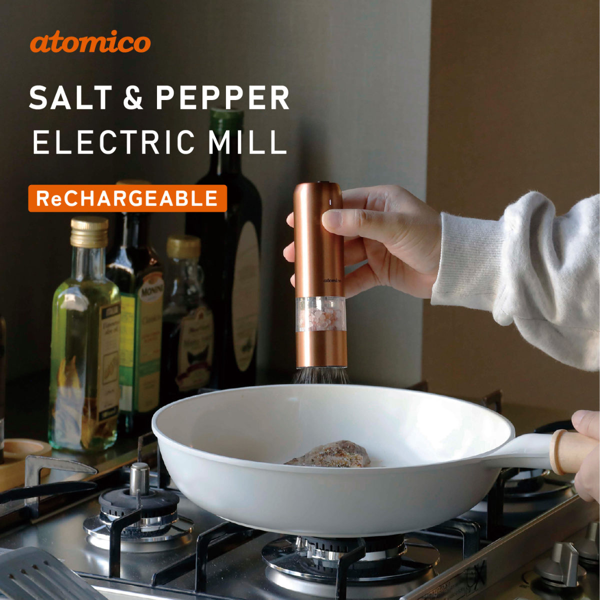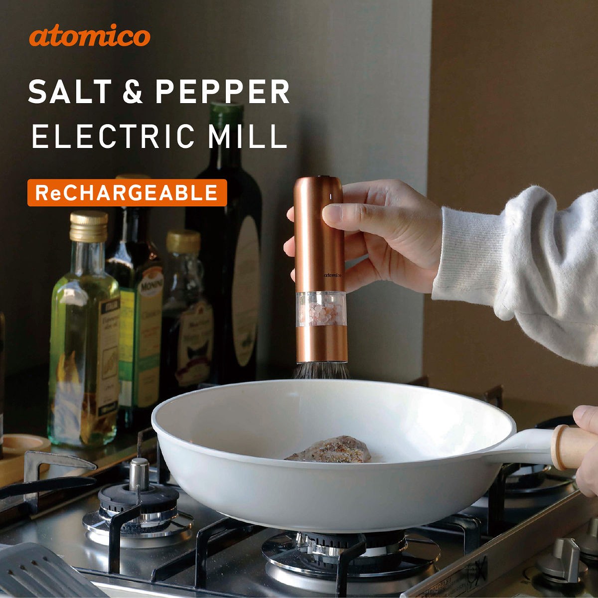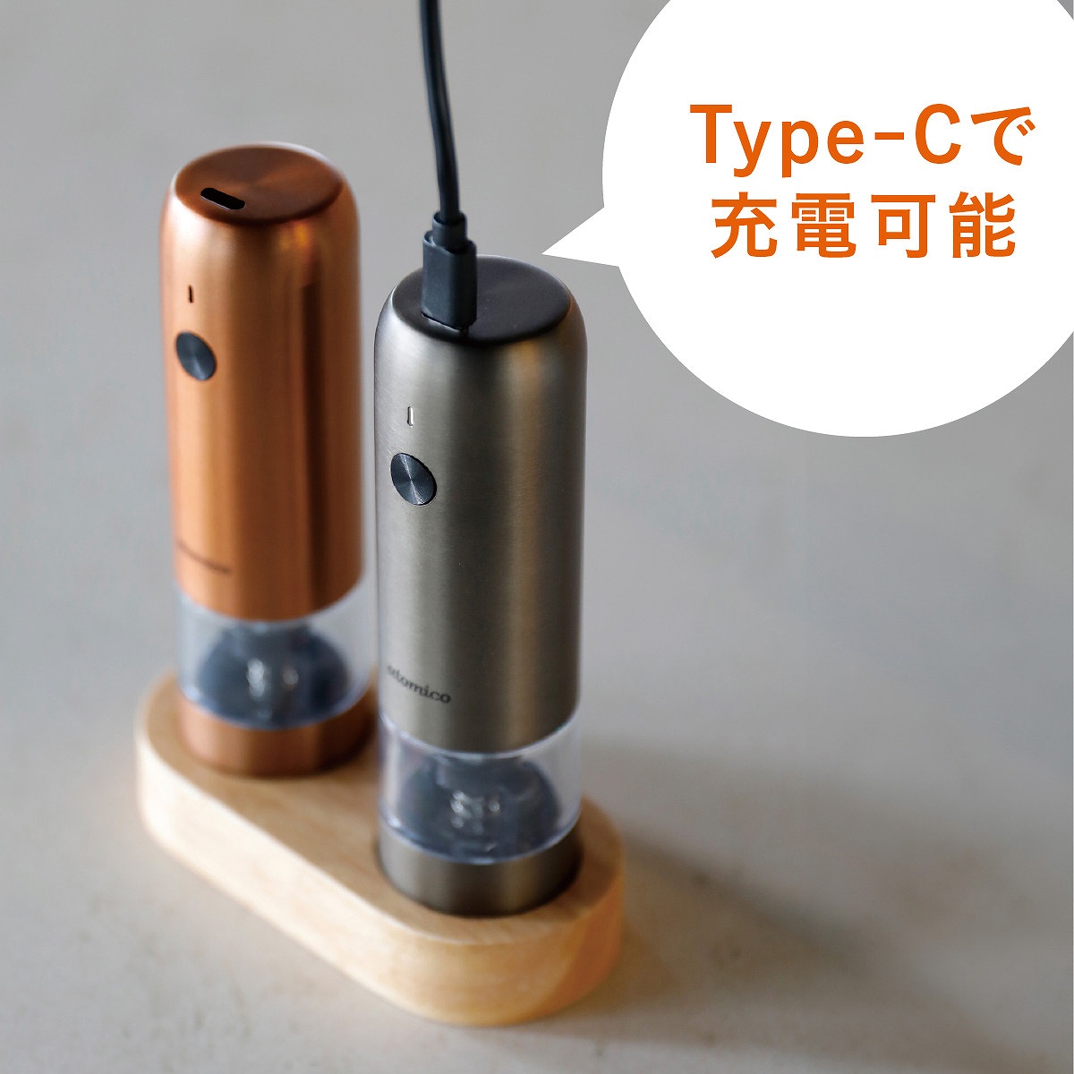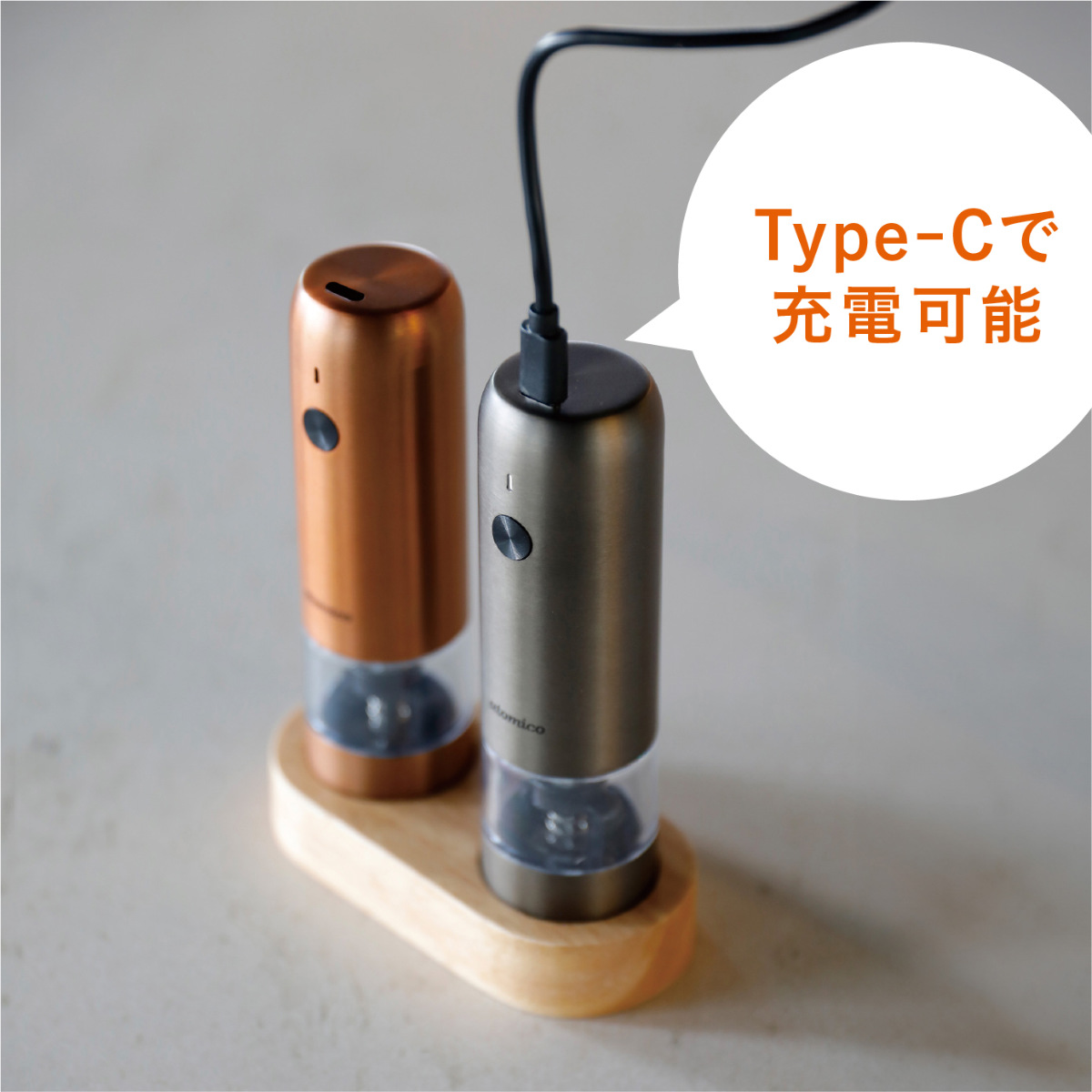 ステンレス製の電動ソルト&ペッパーミルです。スイッチを押すと自動でスパイスが挽かれて出てくるので、調理中も手を止めることなく、片手でサッと味付けができます。