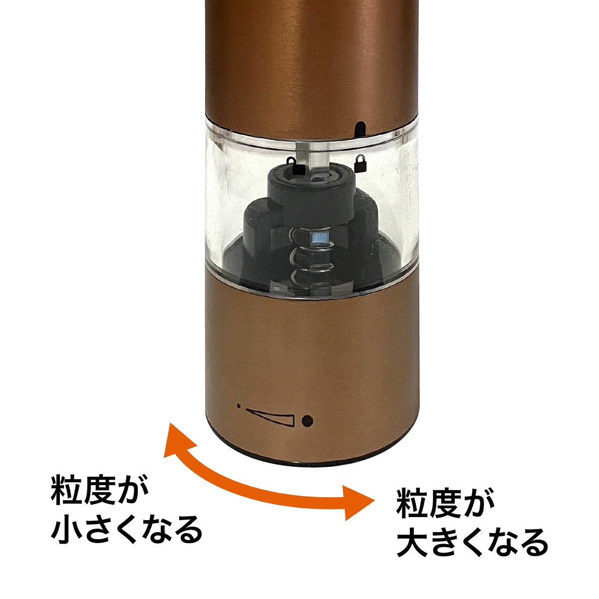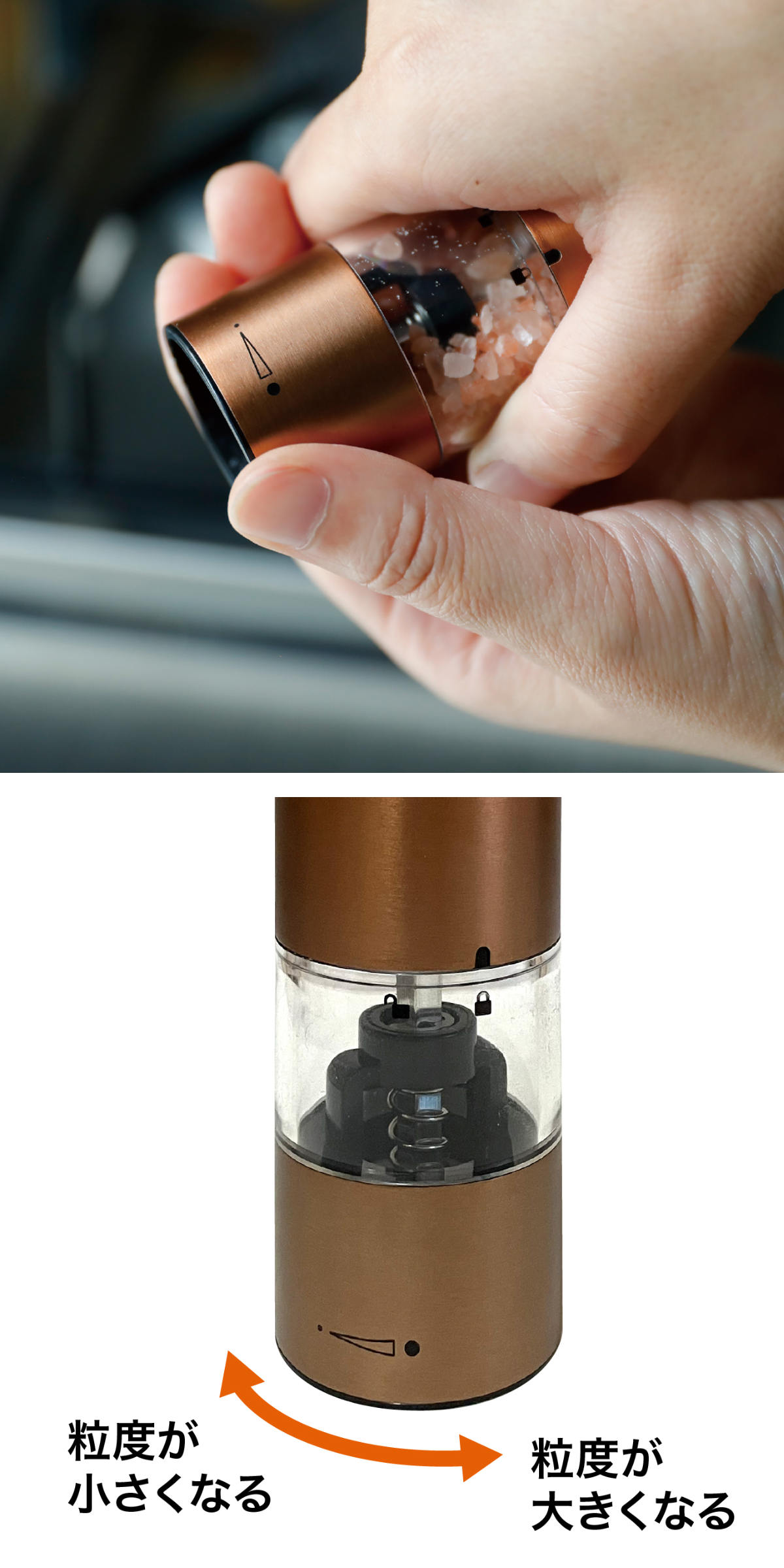 スパイスはお好みの粗さに無段階調節が可能です。キャビンを押さえて、「粒度調節ガイド」の方向に先端をひねるだけの簡単調節です。