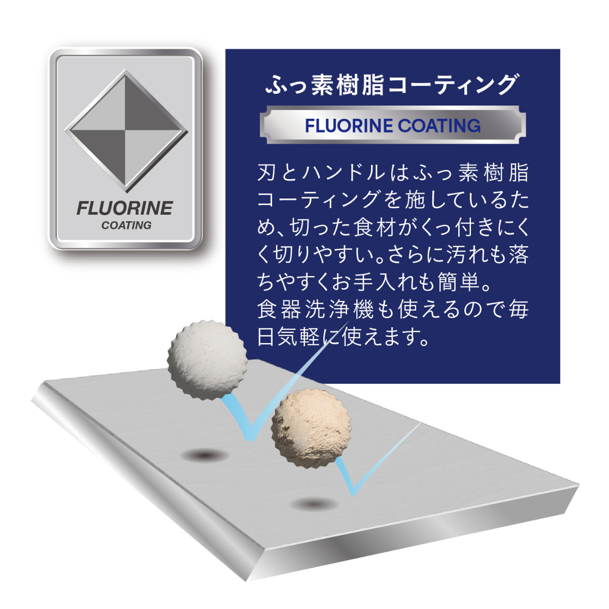 刃にはフッ素コーティングが施されており、切れ心地抜群。また、付着した汚れも軽い力でするんと落とすことができ、扱いやすさ抜群です。