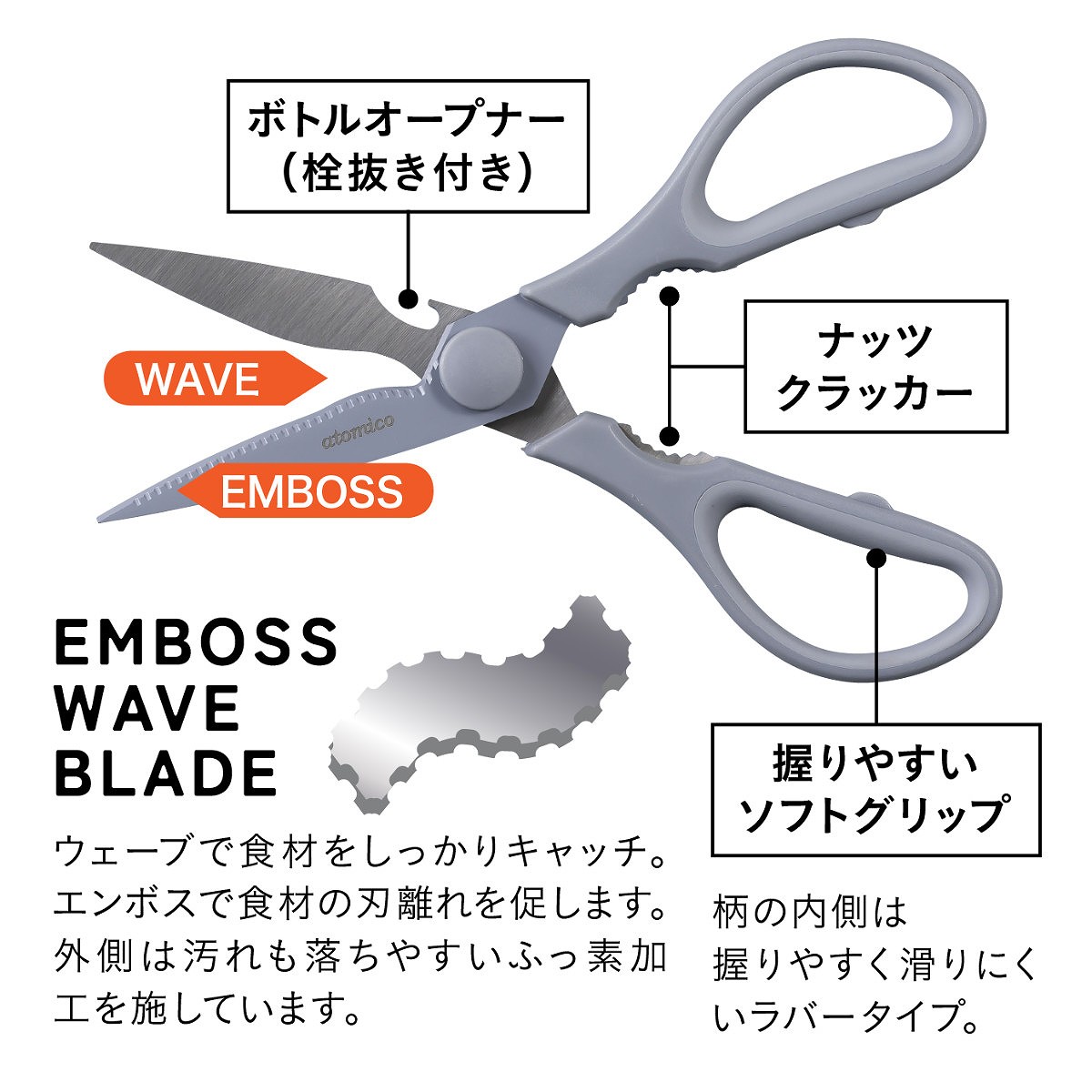 ウェーブ形状の刃が食材をしっかりキャッチして逃さずスパッとカットできます。また、刃表面にはエンボス加工が施されており、切った食材がくっつきにくく、万能葱などもさくさくカットできます。