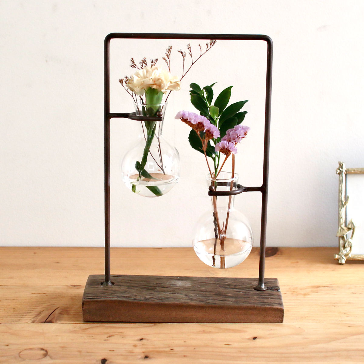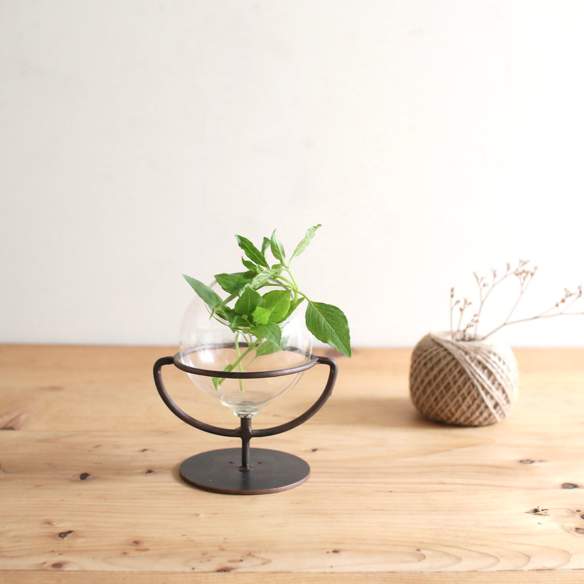 実験器具のようなユニークなデザインが特徴的な、アイアン&ガラスフラワーベースシリーズです。玄関やリビング、デスク周りに置くだけで、毎日の暮らしをちょっと特別に。シリーズで揃えると統一感のある空間になります。