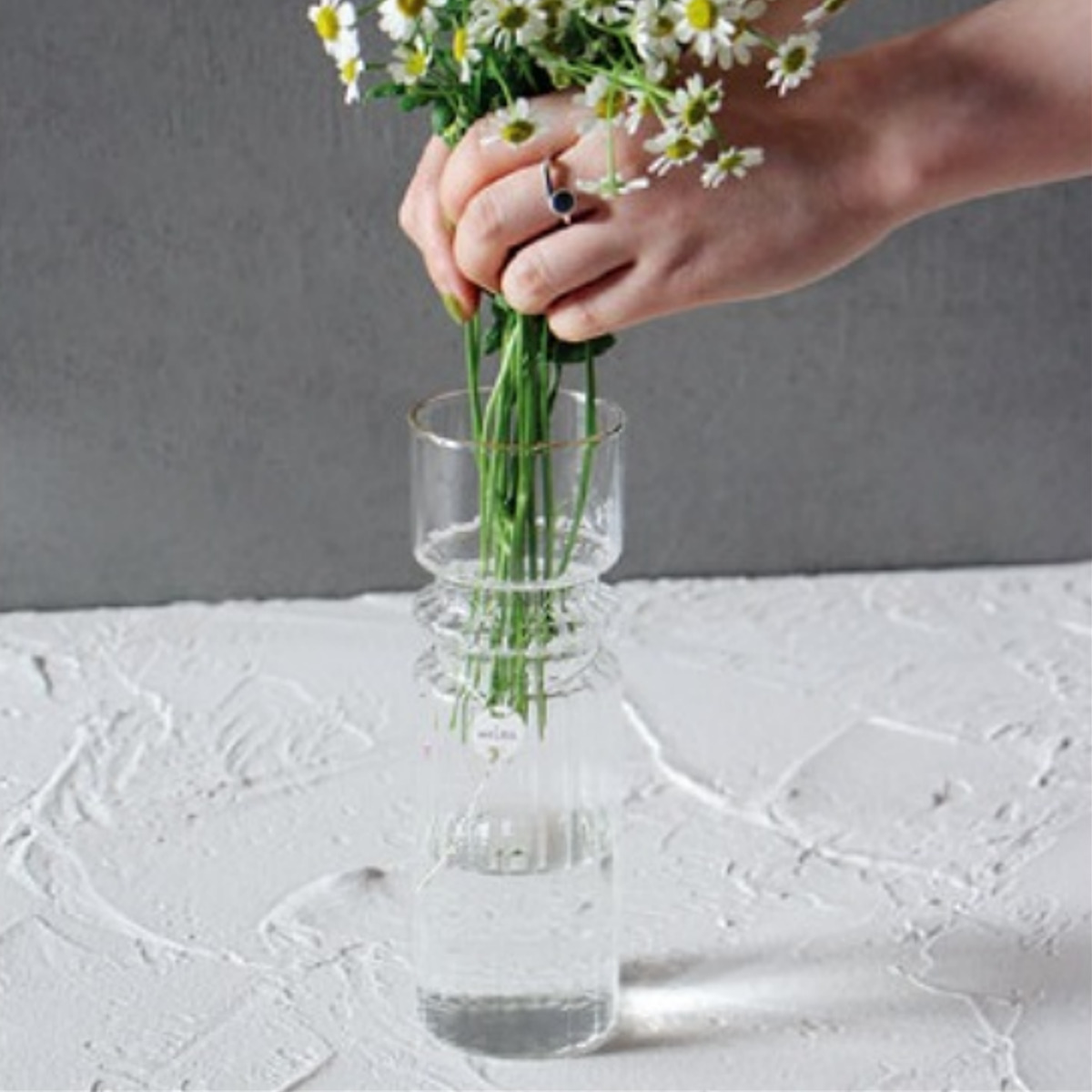 すっきりとした透明感が魅力のガラスフラワーベースです。シンプルながらも中央にくびれのあるデザインが特徴で、お花を自然にまとめ、美しく見せてくれます。ナチュラルな花材はもちろん、ドライフラワーや枝ものとの相性も抜群です。