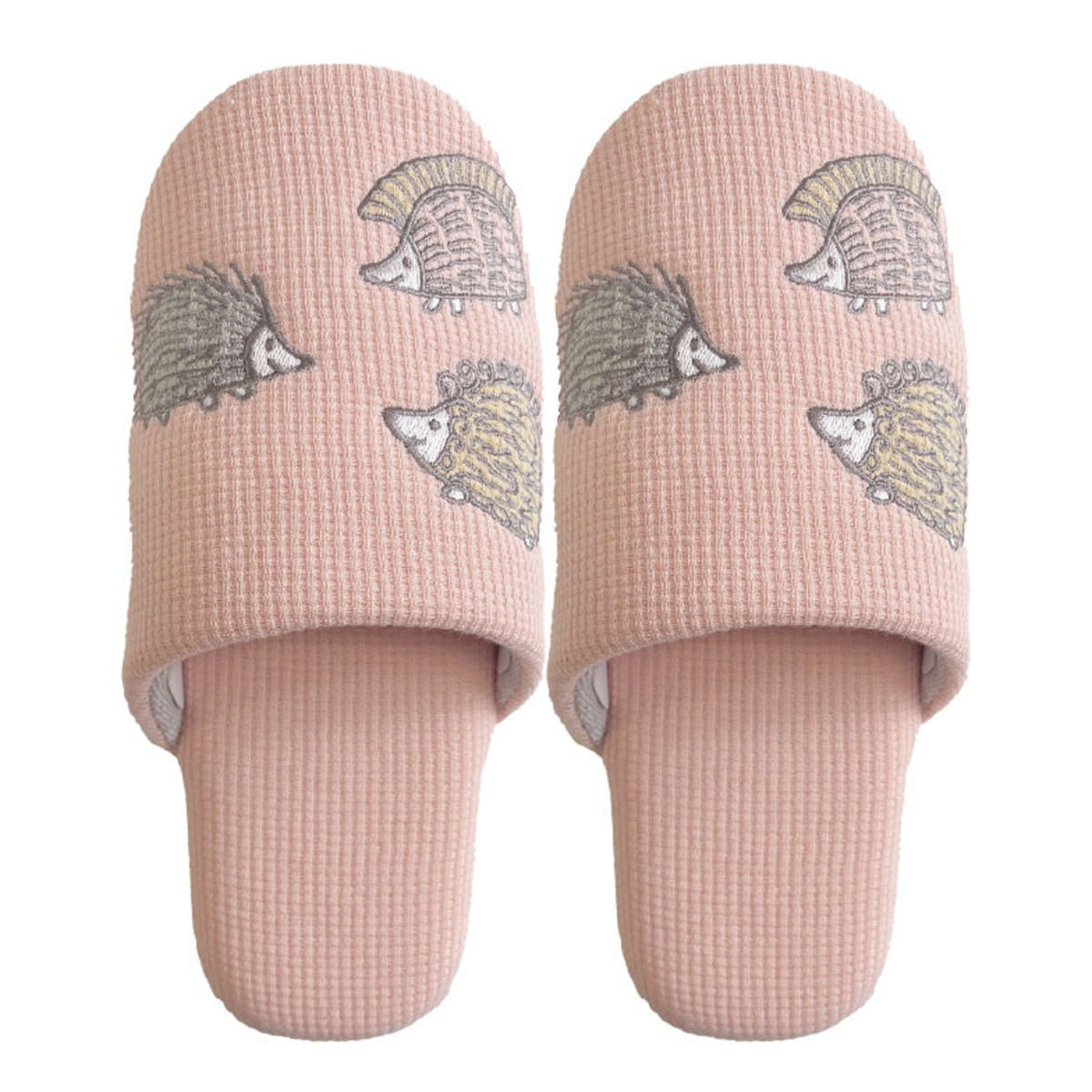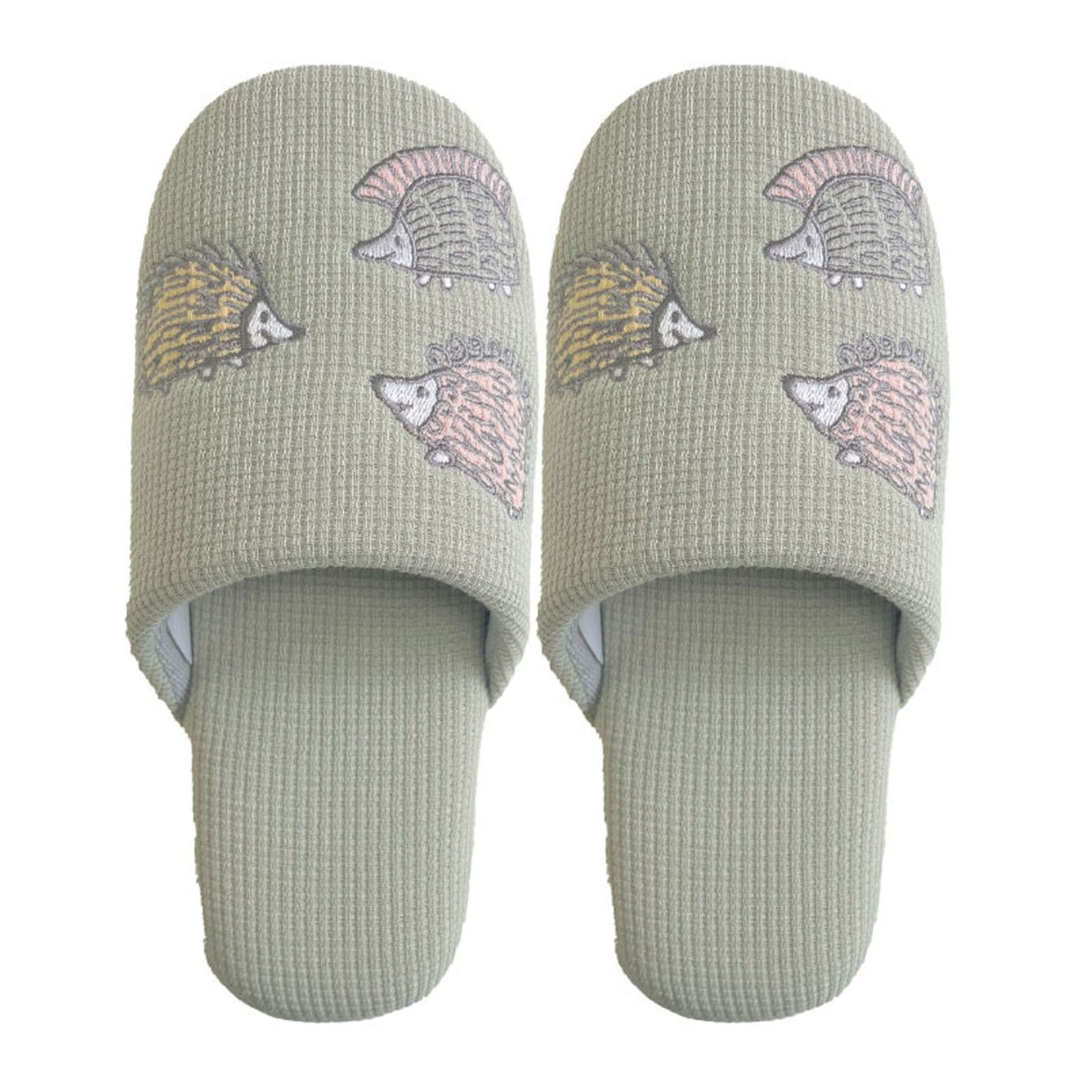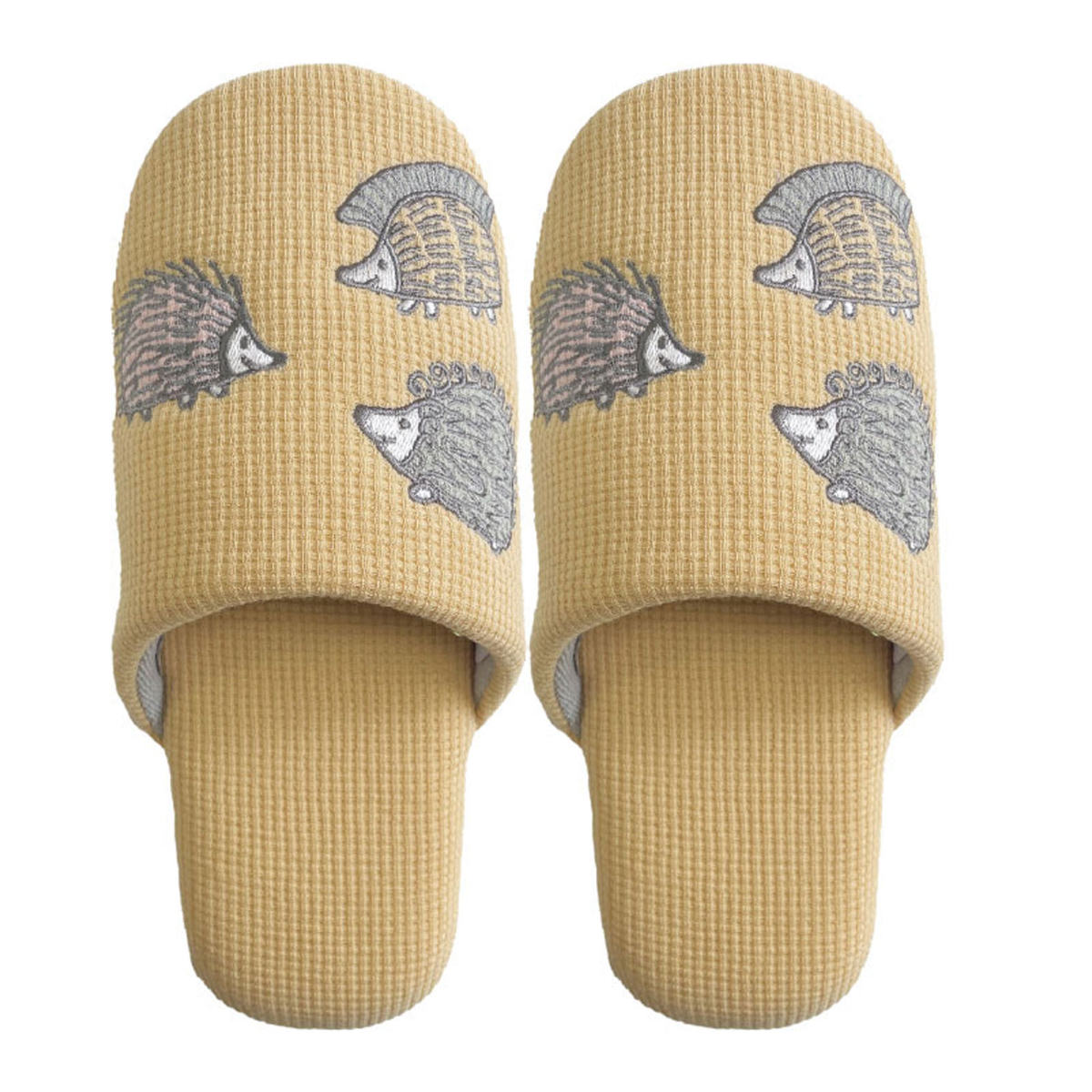 柔らかなアースカラーが映える、はりねずみの刺繍が入ったのスリッパMサイズです。強すぎない色味なので、空間に馴染みながらインテリアのアクセントになります。