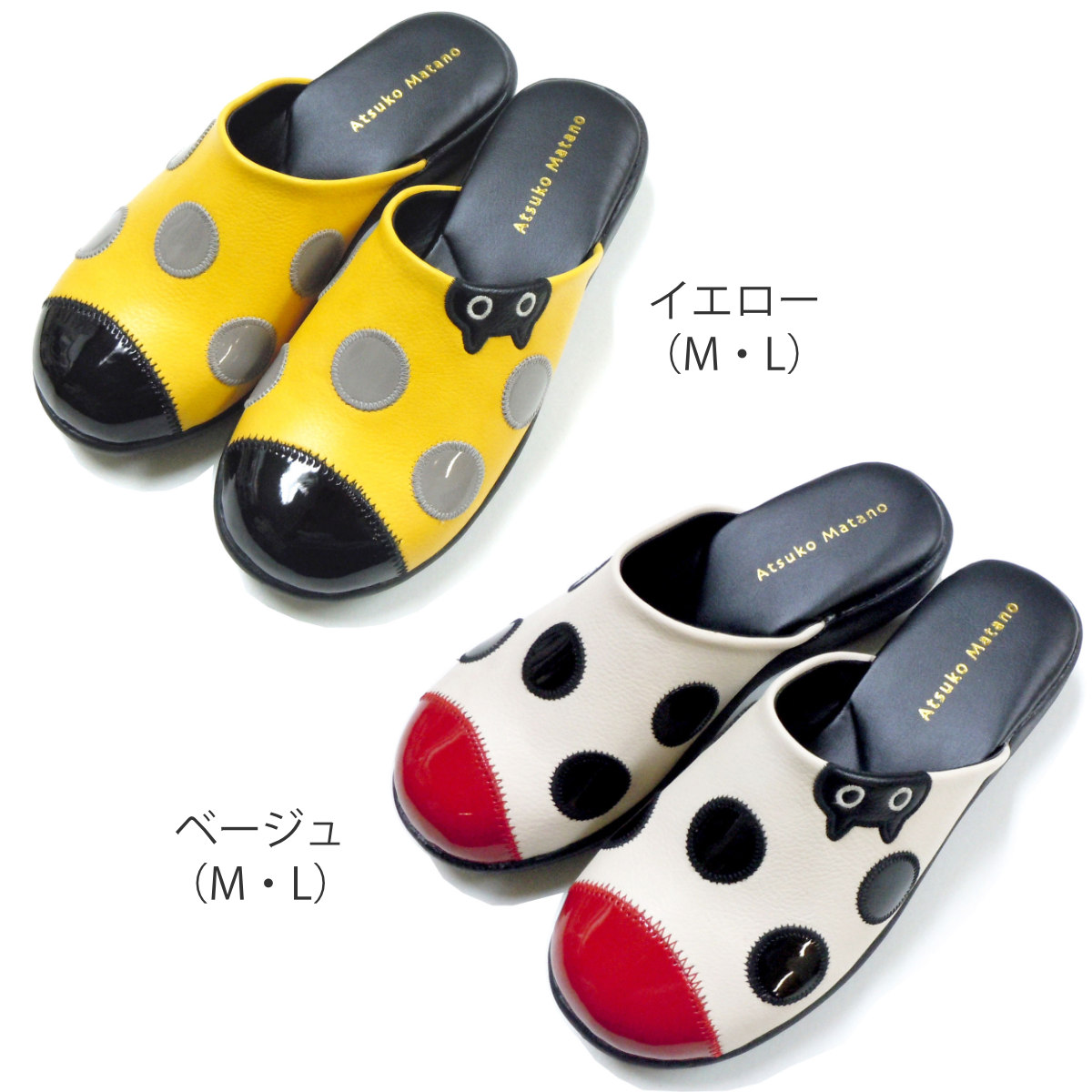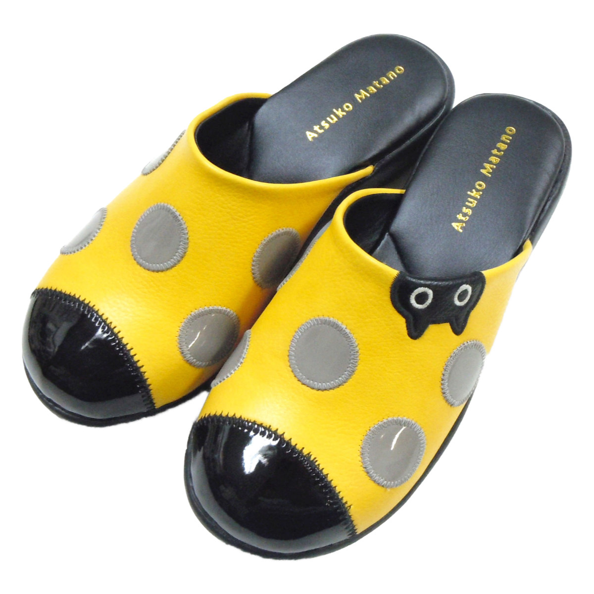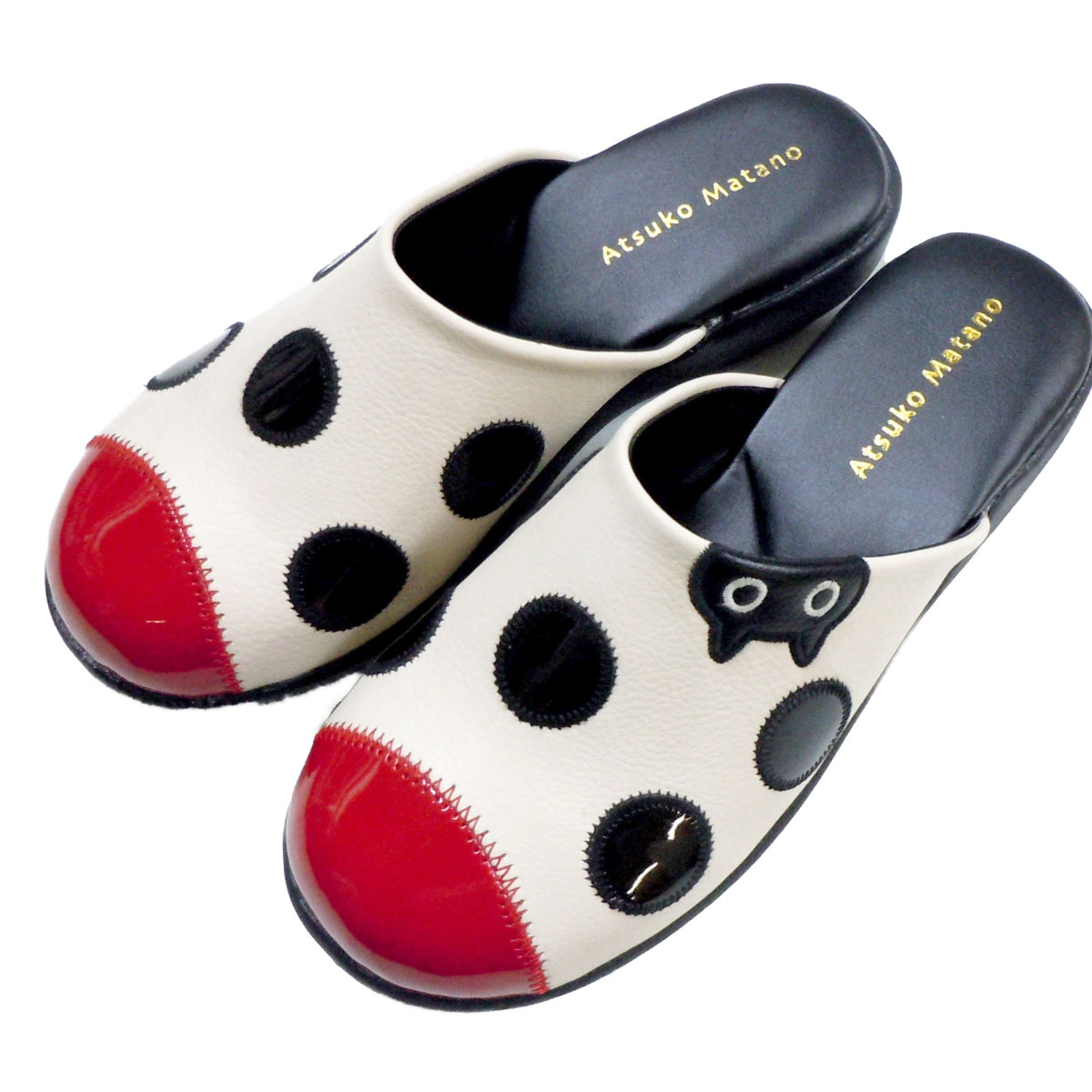 トラッドな色味に、てんとう虫の様な水玉のデザインが他にはない外履きサンダルです。こそっと覗く黒猫がかわいく、履いていると楽しくなりそうです。コーディネートのアクセントにもなります。