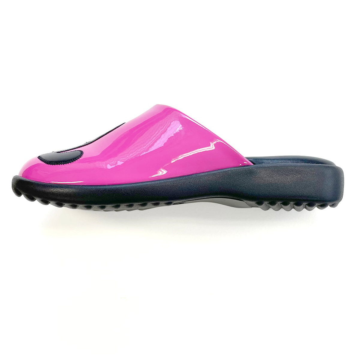 お出掛け時にさっと履けて使いやすい外履きサンダル。光沢のある明るいカラーのエナメル素材で気分も上がる1足です。バルコニーやベランダでも活躍します。