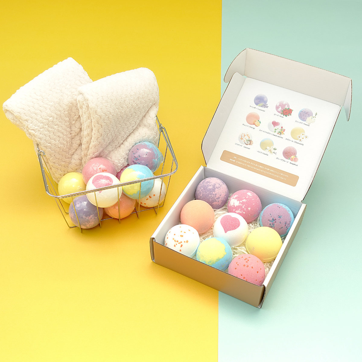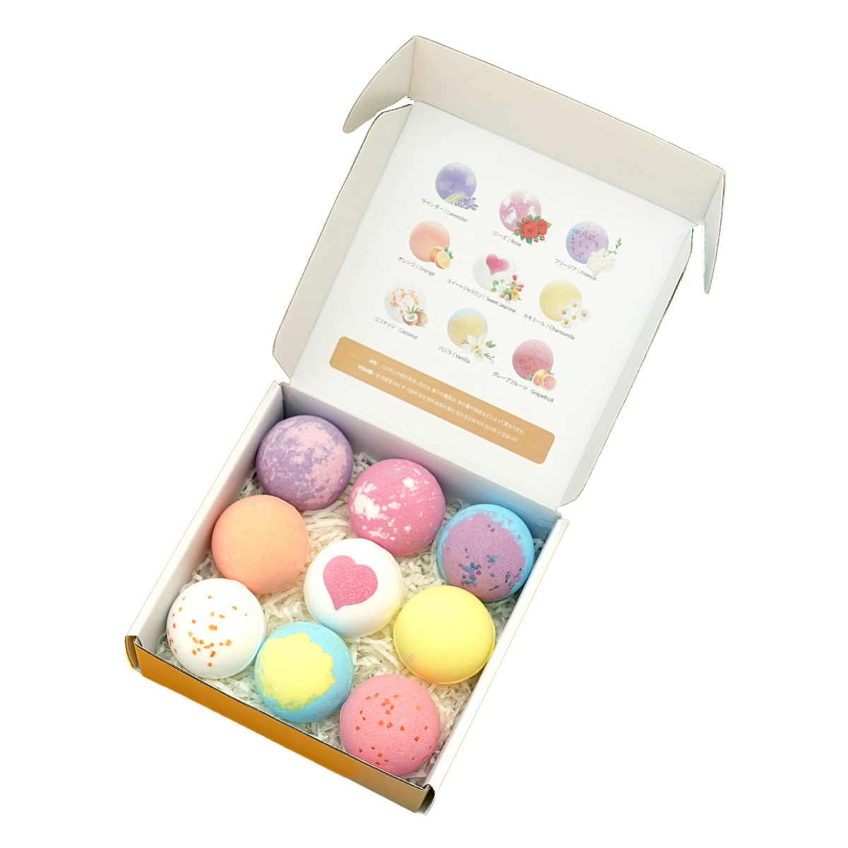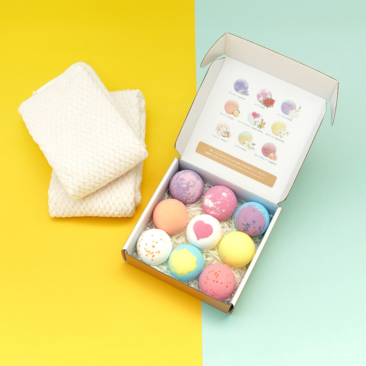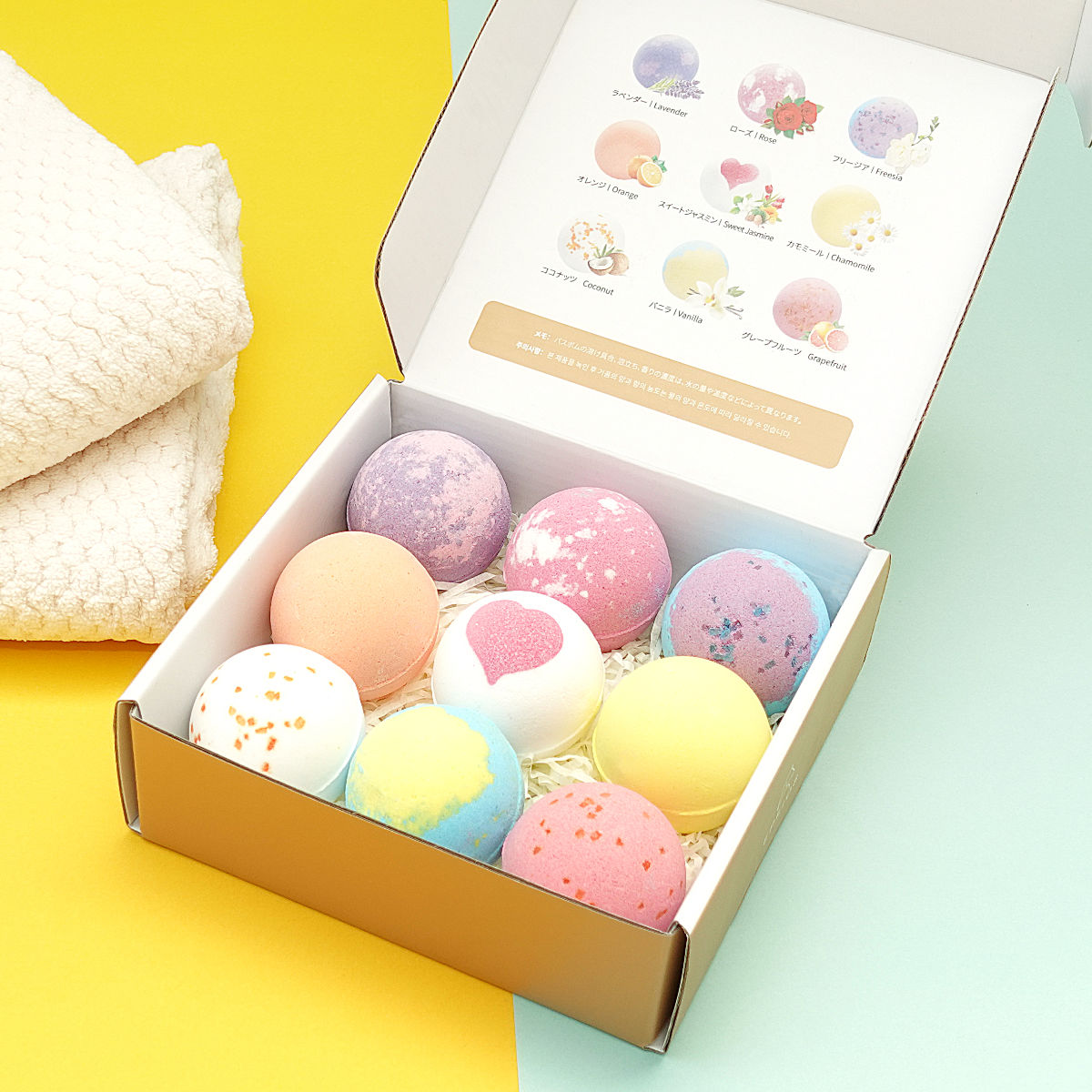 お花やフルーツなど自然の恵みがぎゅっとつまった、9種類のバスボムセットです。鮮やかな色がシュワシュワと弾ける様子は、まるで魔法のよう。心地よい香りとともに、視覚でも楽しめる贅沢なバスボムが、毎日のバスタイムをちょっと特別なものに変えてくれます。