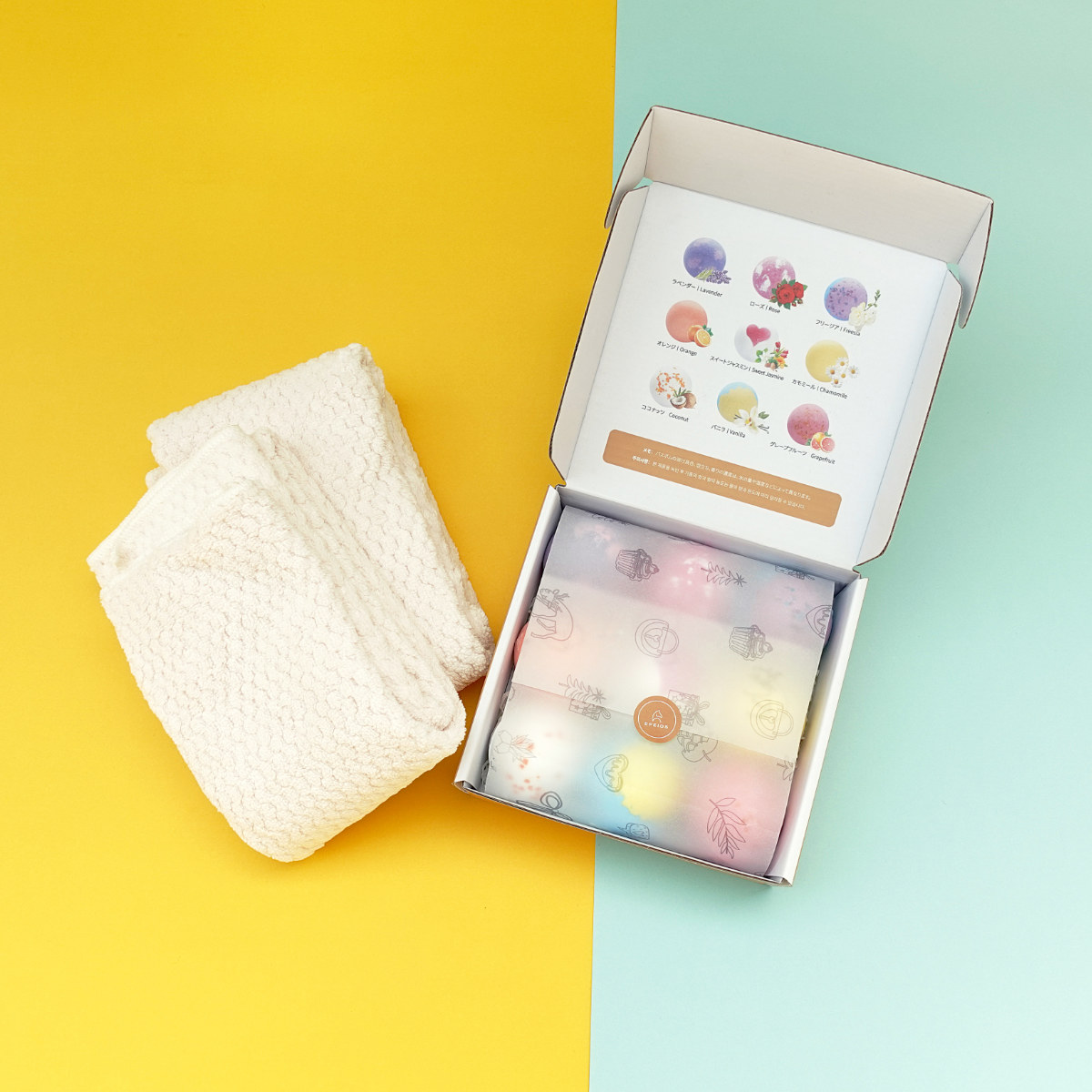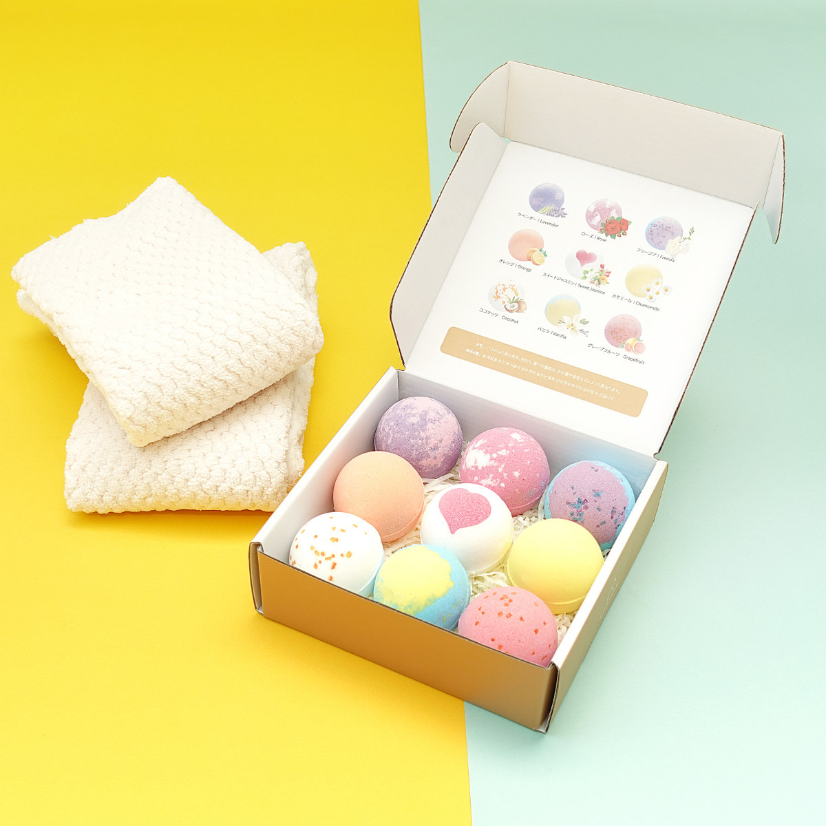 | 内容量 | バスボム(75g)×9個入り ラベンダー、オレンジ、ユーカリ/グロブルス、フリージア、カモミール、クチナシ、スイート、ローズ、ジャスミン 付属品:ビニールカッター |