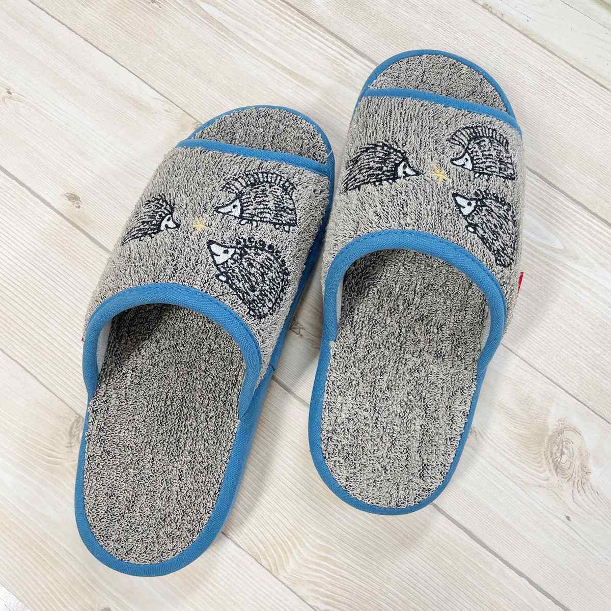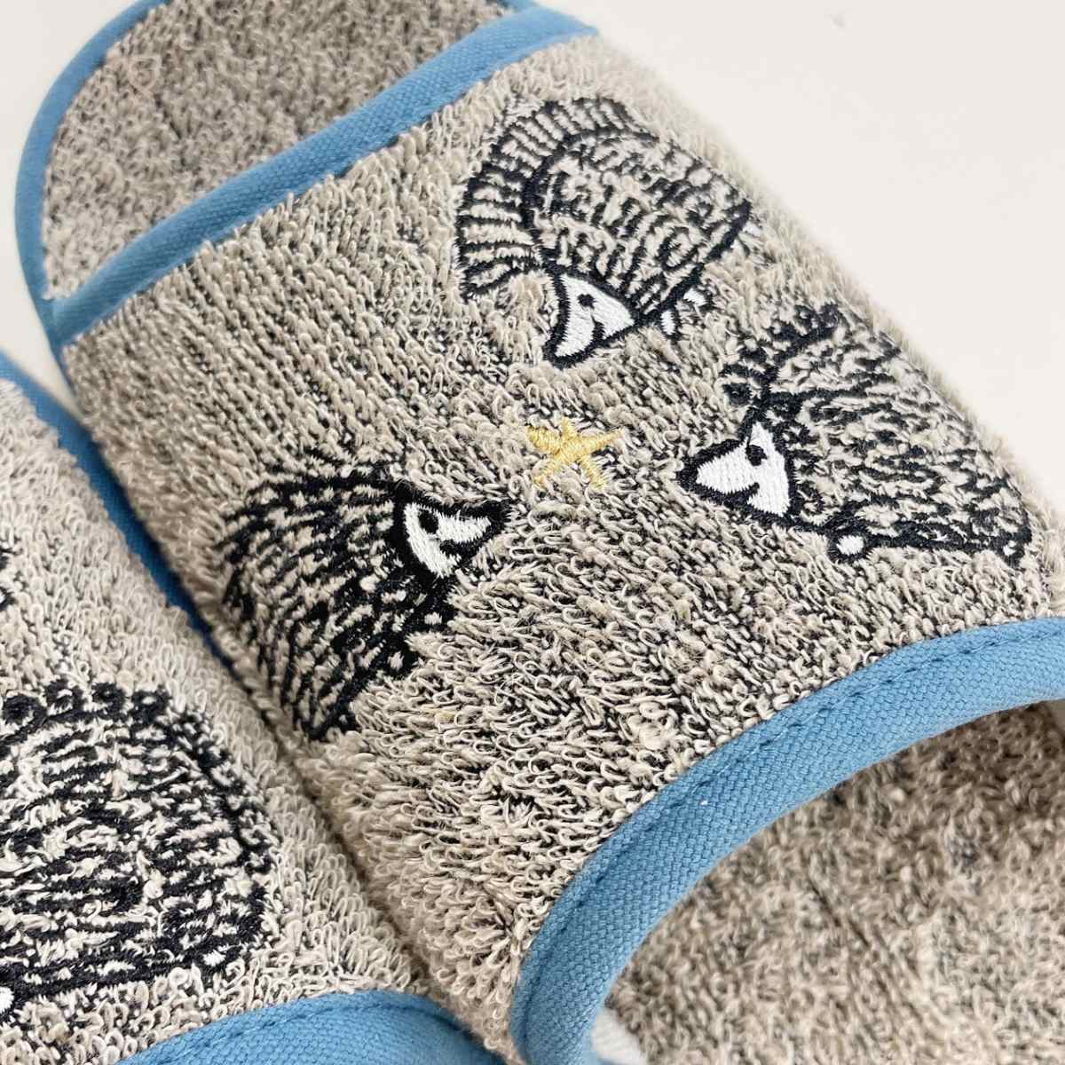 砂浜で何かを見つけた、はりねずみたちが描かれています。置いてかわいく、使って楽しいスリッパです。