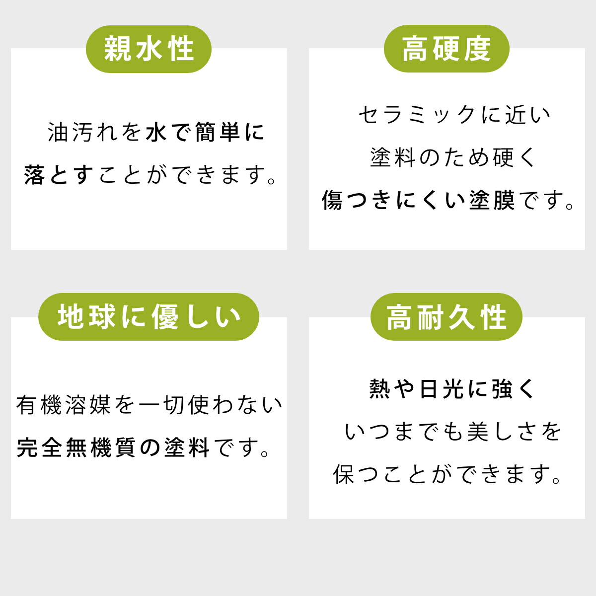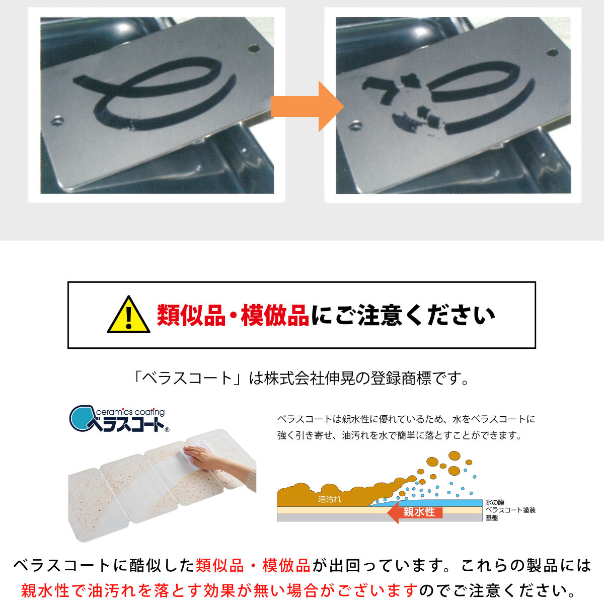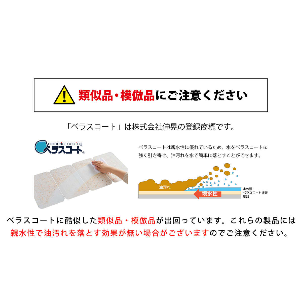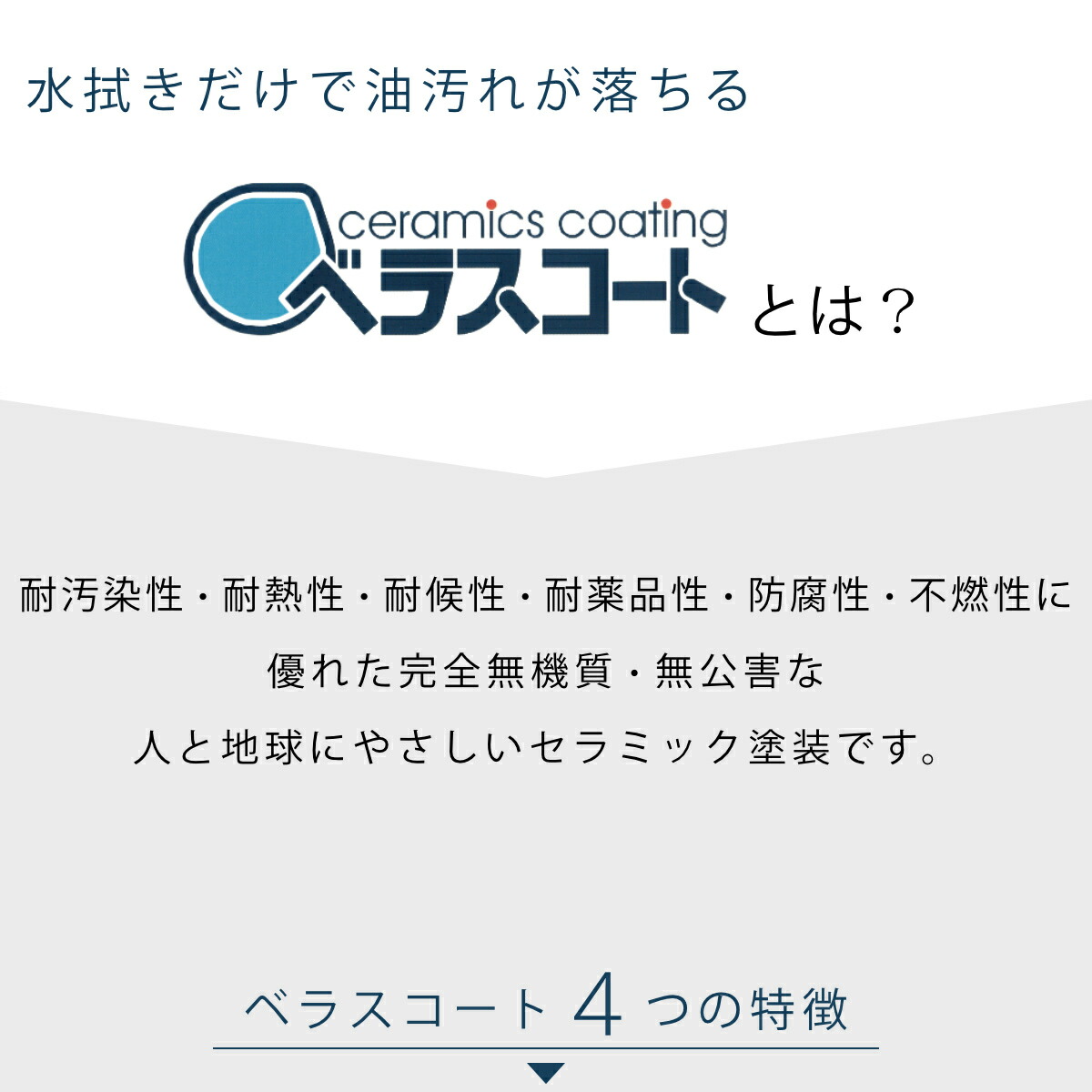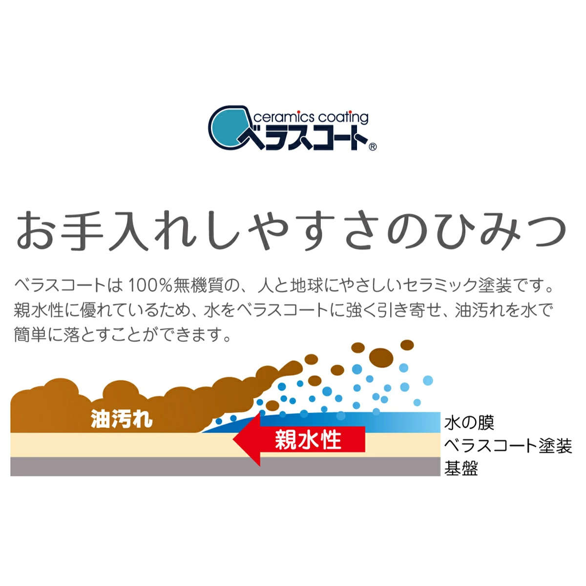 ベラスコートは、耐汚染性・耐熱性・耐候性・耐薬品性・防腐性・不燃性に優れた、次世代の高機能塗料として期待されています。塗膜硬度は8H以上と非常に硬く、傷がつきにくいのが特長。摩耗にも強く、人と環境にやさしいセラミック塗装です。