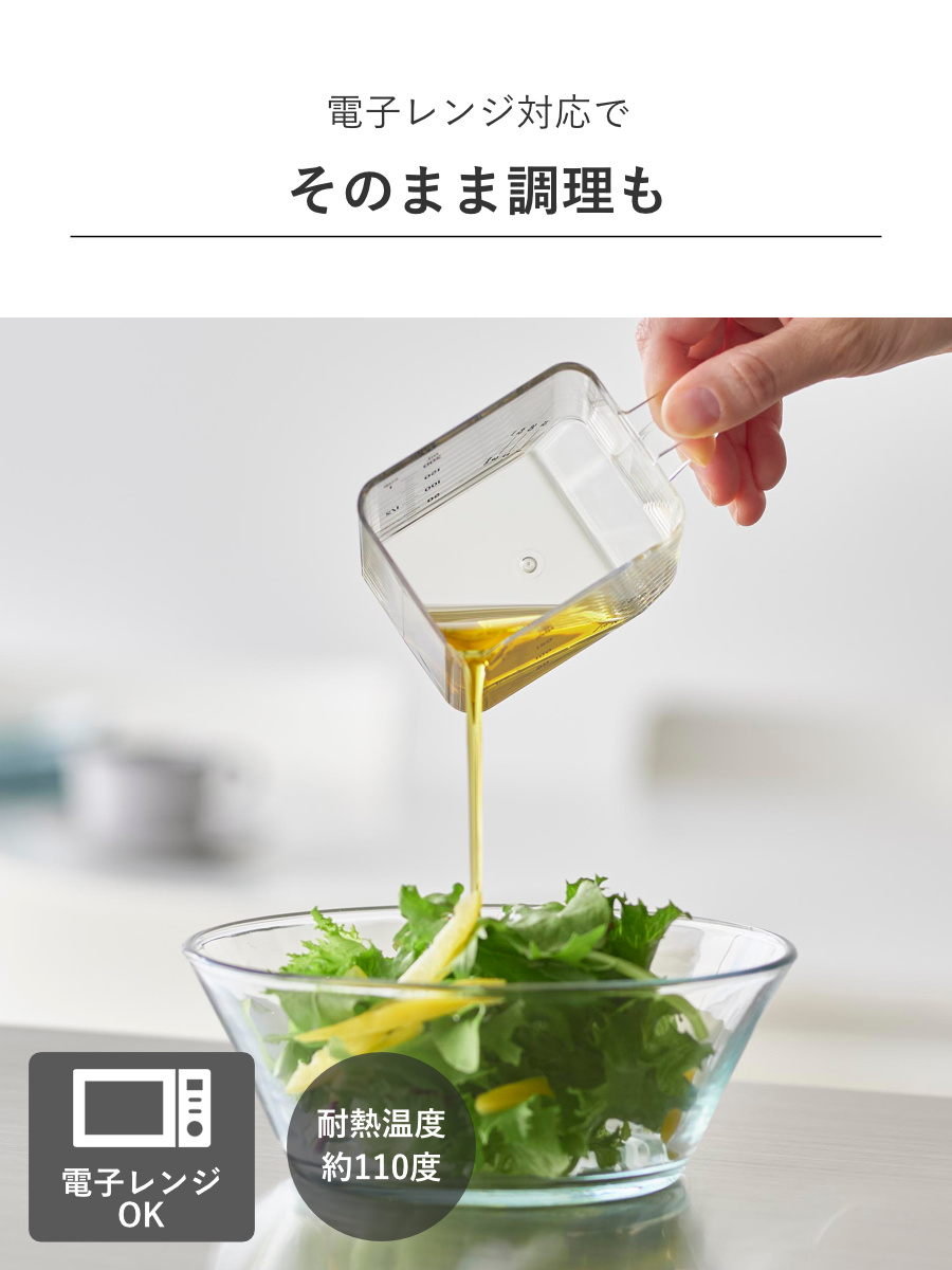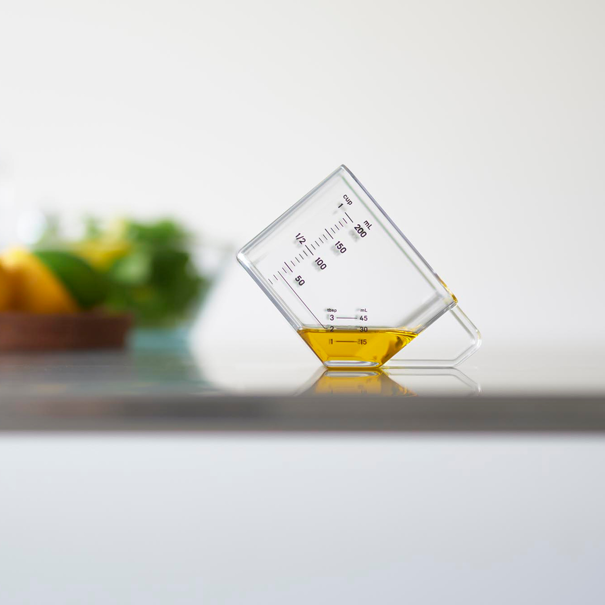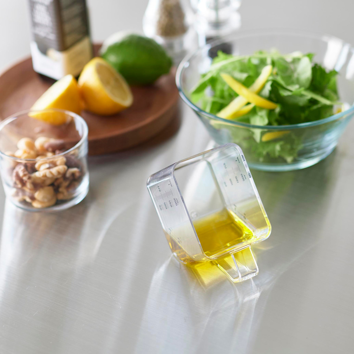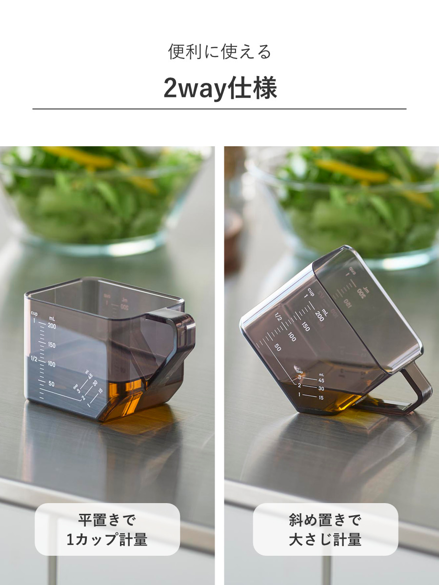 平置きで1カップ、斜め置きで大さじ計量ができる便利な2way計量カップです。片手で持ちやすく注ぎやすい形状なので、自家製ドレッシング作りなどにもおすすめです。