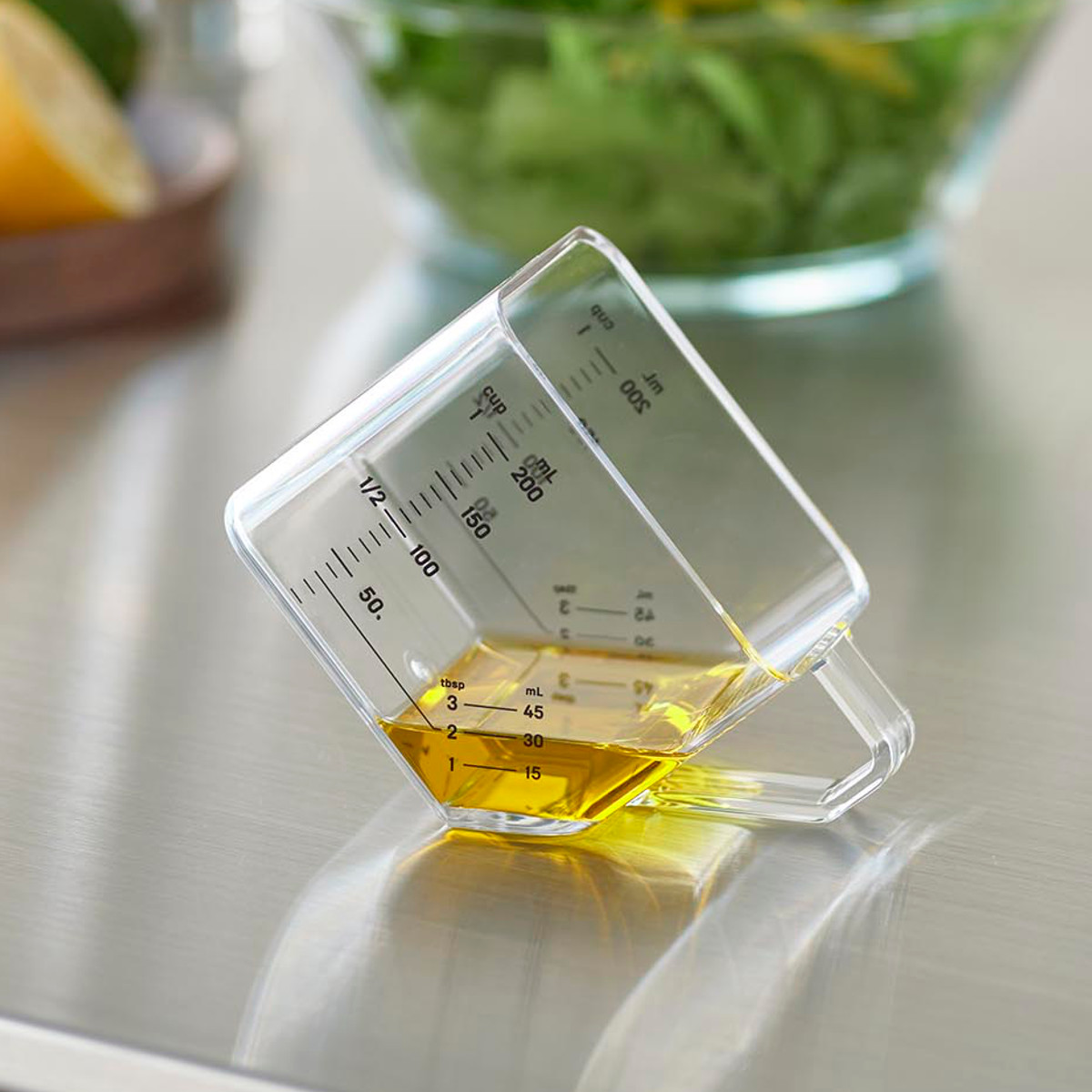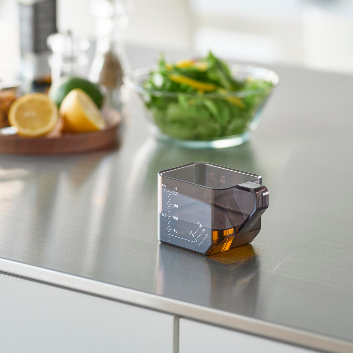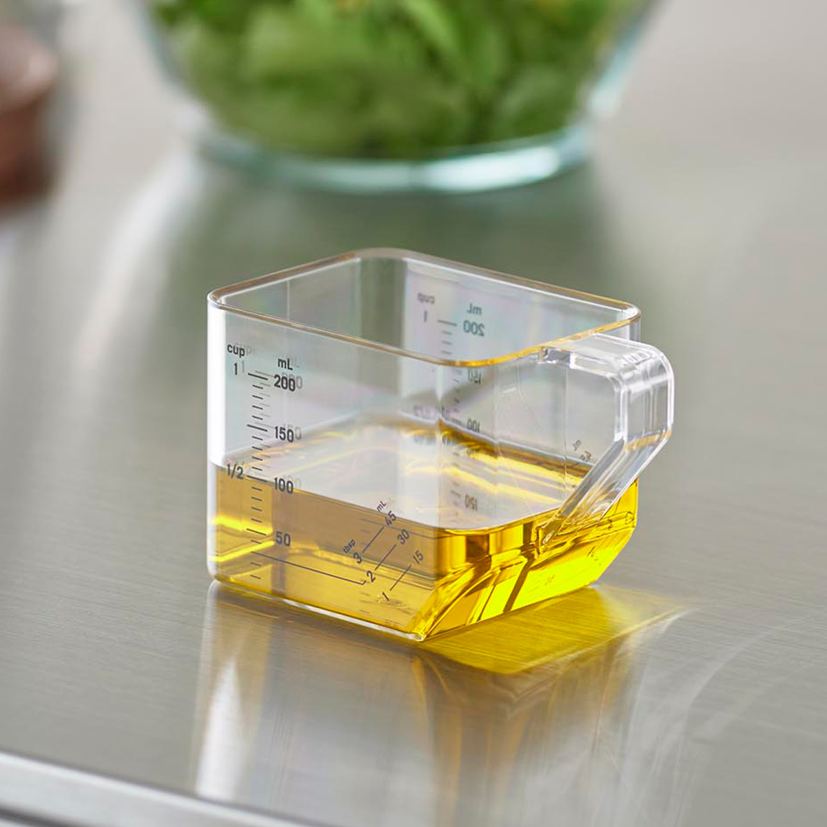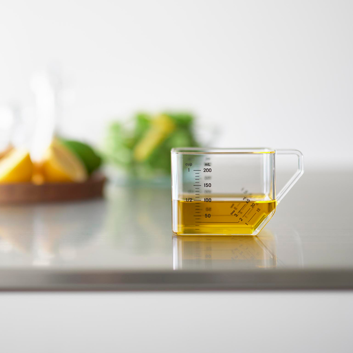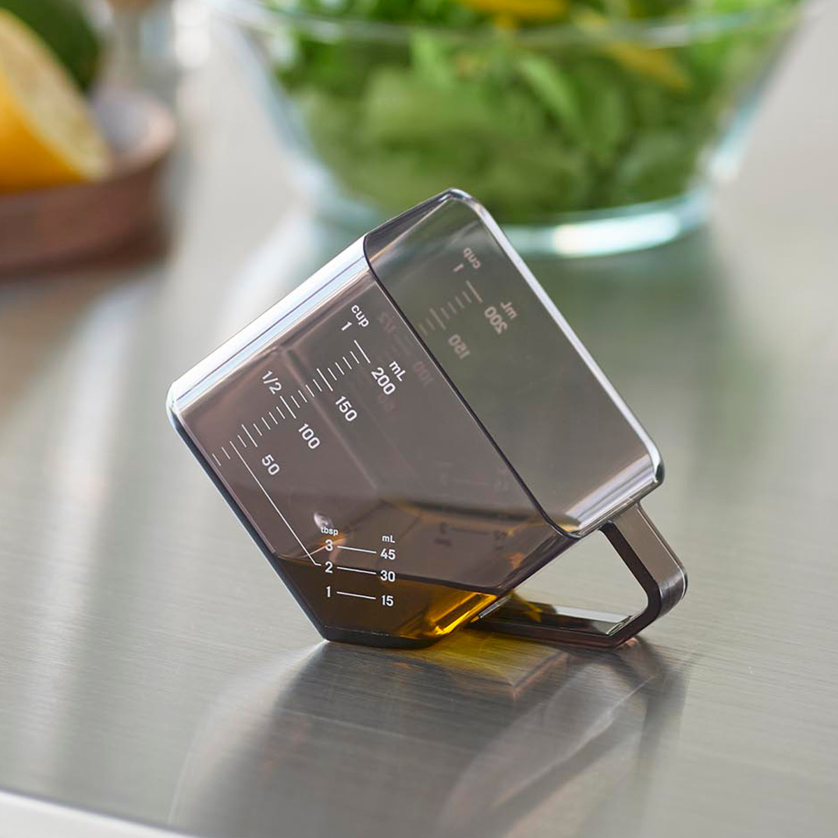平置きで1カップ、斜め置きで大さじ計量ができる便利な2way計量カップです。片手で持ちやすく注ぎやすい形状なので、自家製ドレッシング作りなどにもおすすめです。