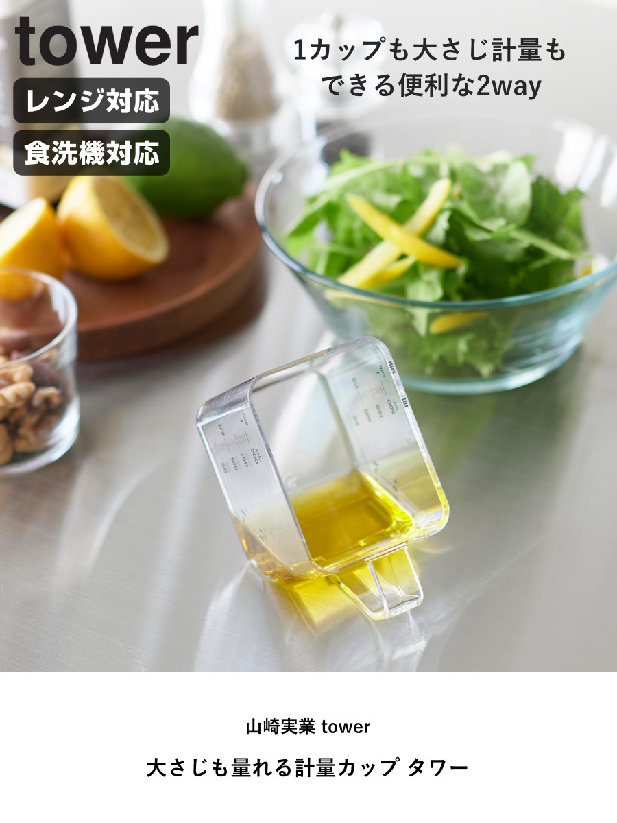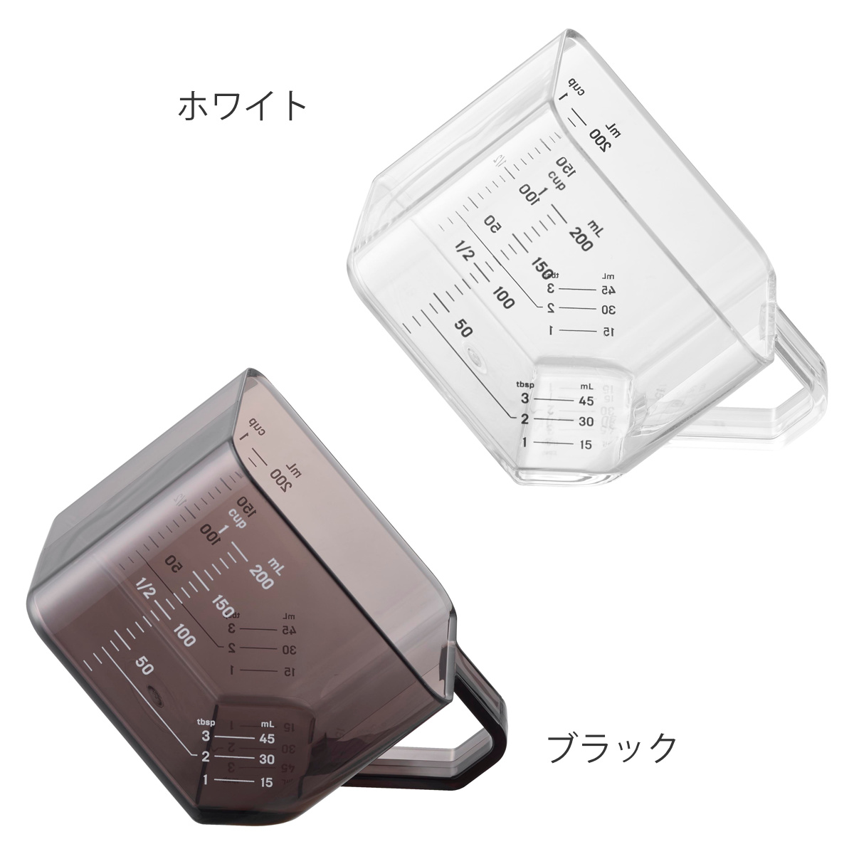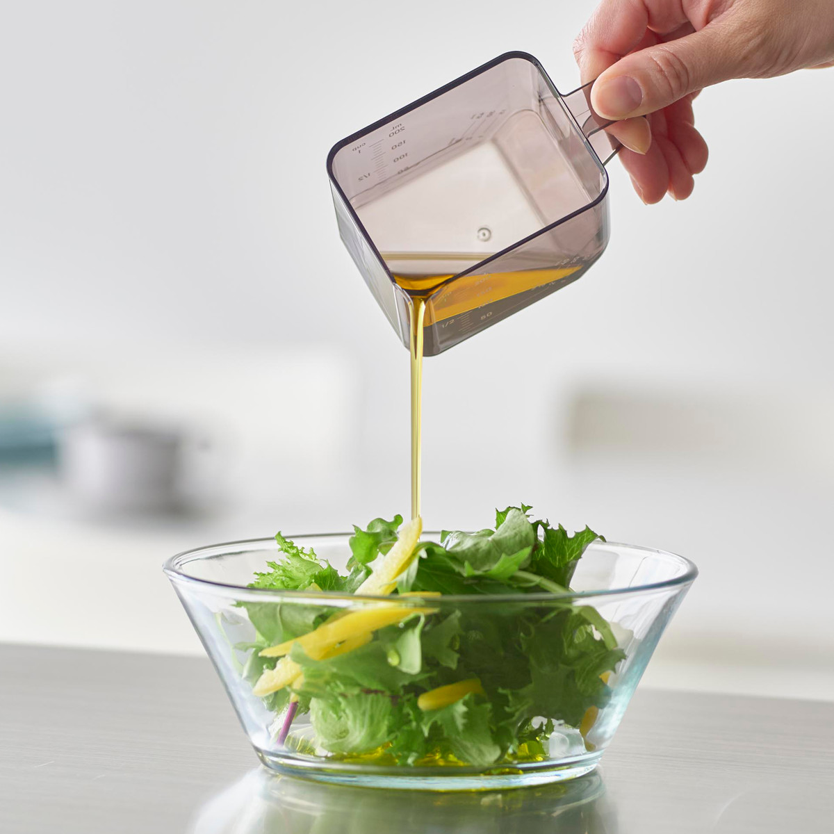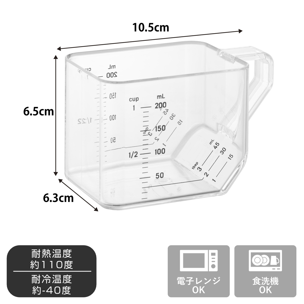 平置きで1カップ、斜め置きで大さじ計量ができる便利な2way計量カップです。片手で持ちやすく注ぎやすい形状なので、自家製ドレッシング作りなどにもおすすめです。