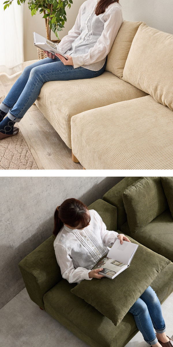 奥行が深めのソファは身体を預けてラクな姿勢で座ることができます。また、あぐらをかいたり、お昼寝をしても余裕がありリラックスできます。クッションを外すとより広いスペースになります。