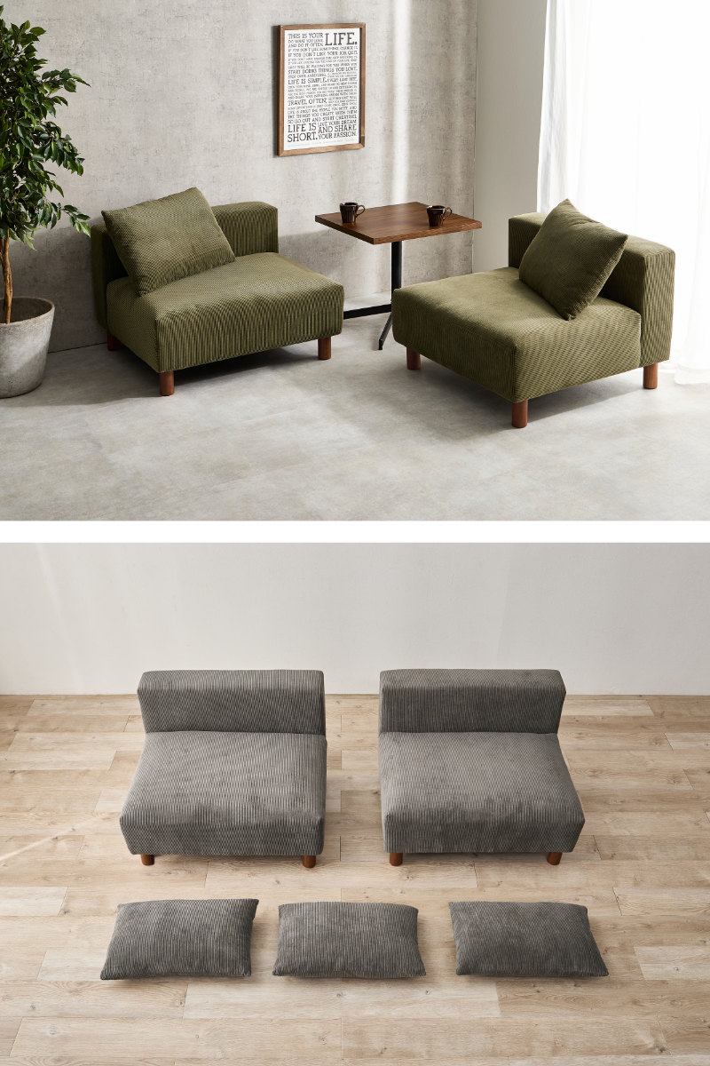 それぞれが別々になっているのでテーブルを挟んだレイアウトすることが可能です。また、持ち運びもしやすく、模様替えが手軽にできます。