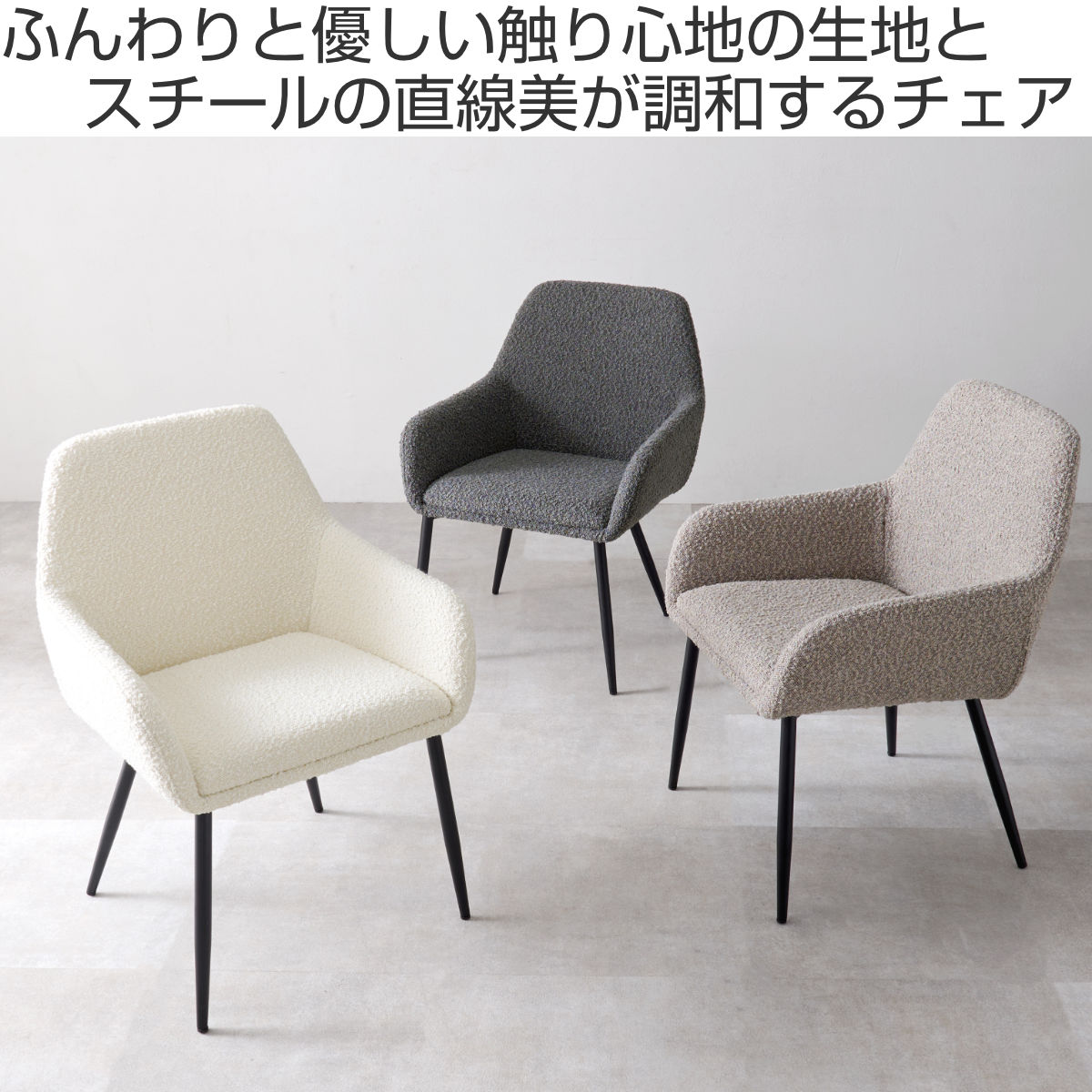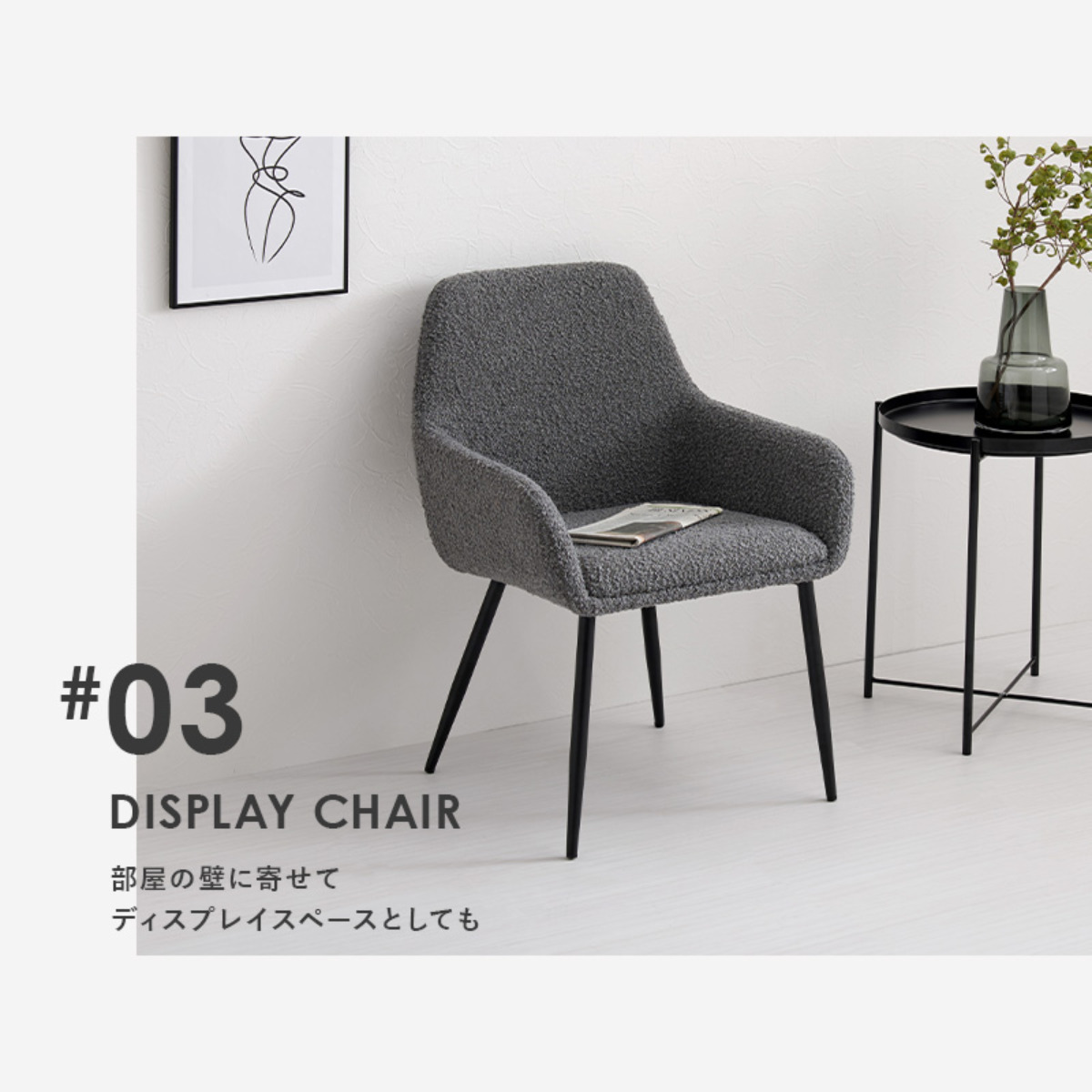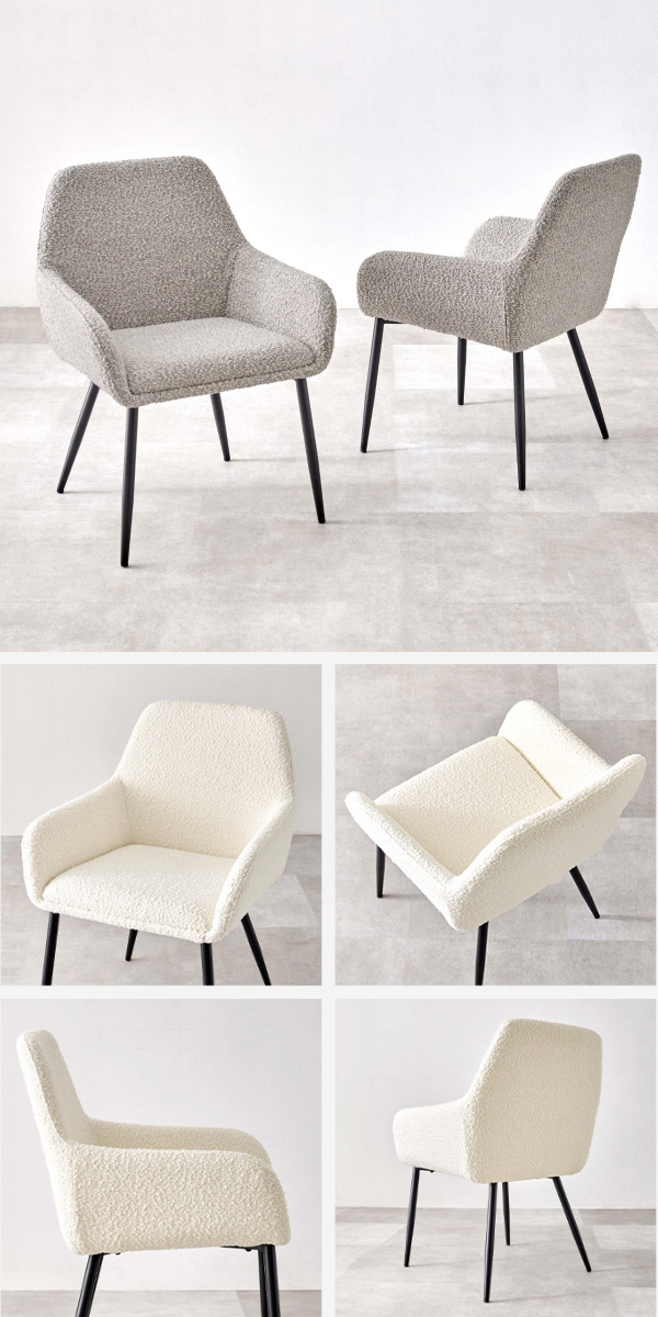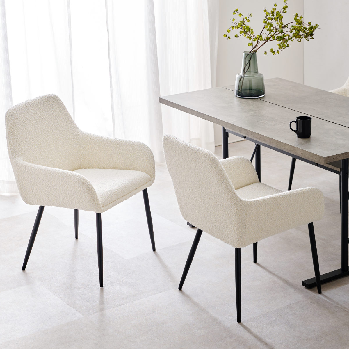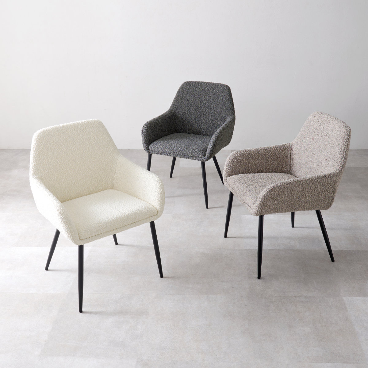 独特な質感のブークレ生地とブラックスチール脚の異素材を組み合わせたダイニングチェアです。モダンな雰囲気の中にも温かみのある空間を演出してくれます。