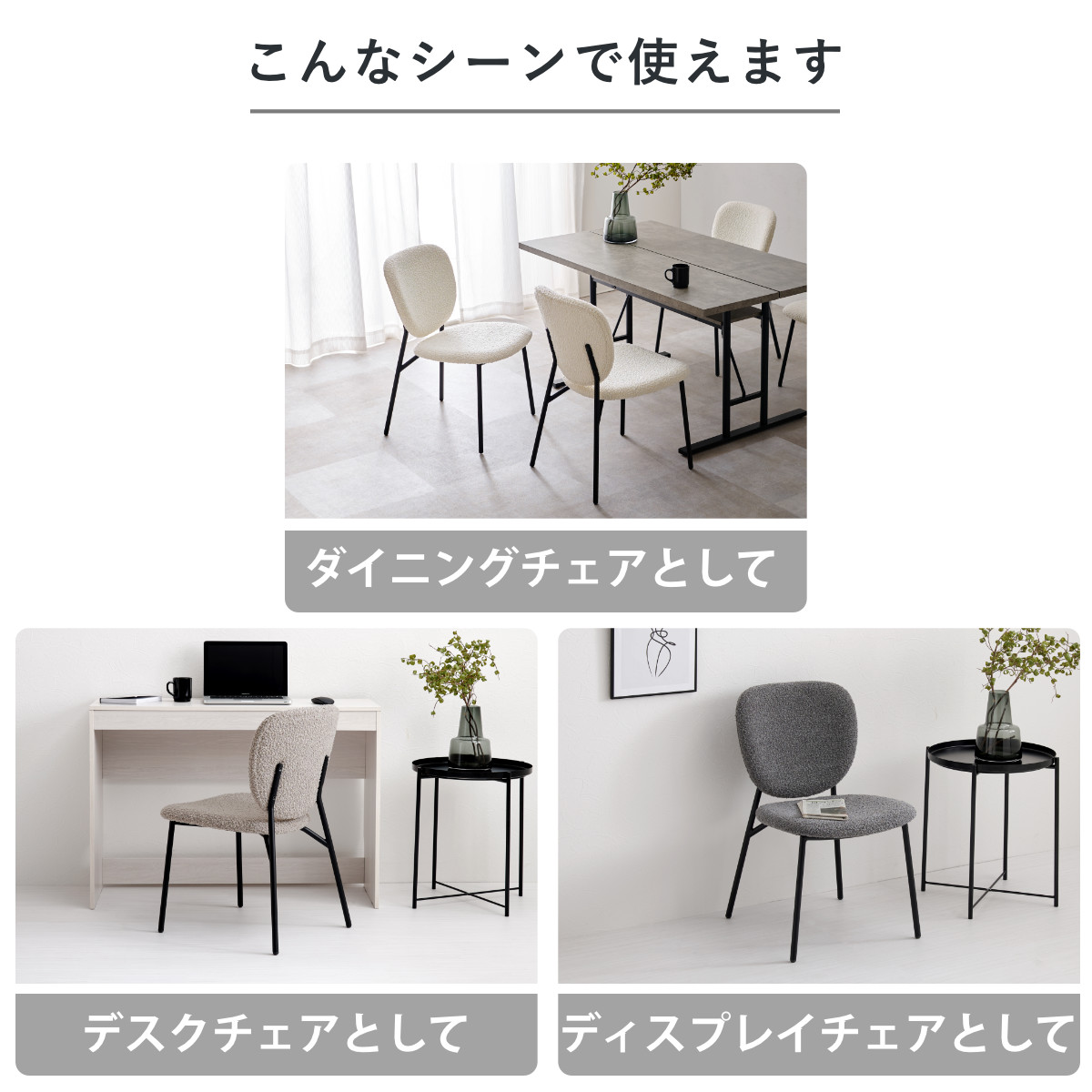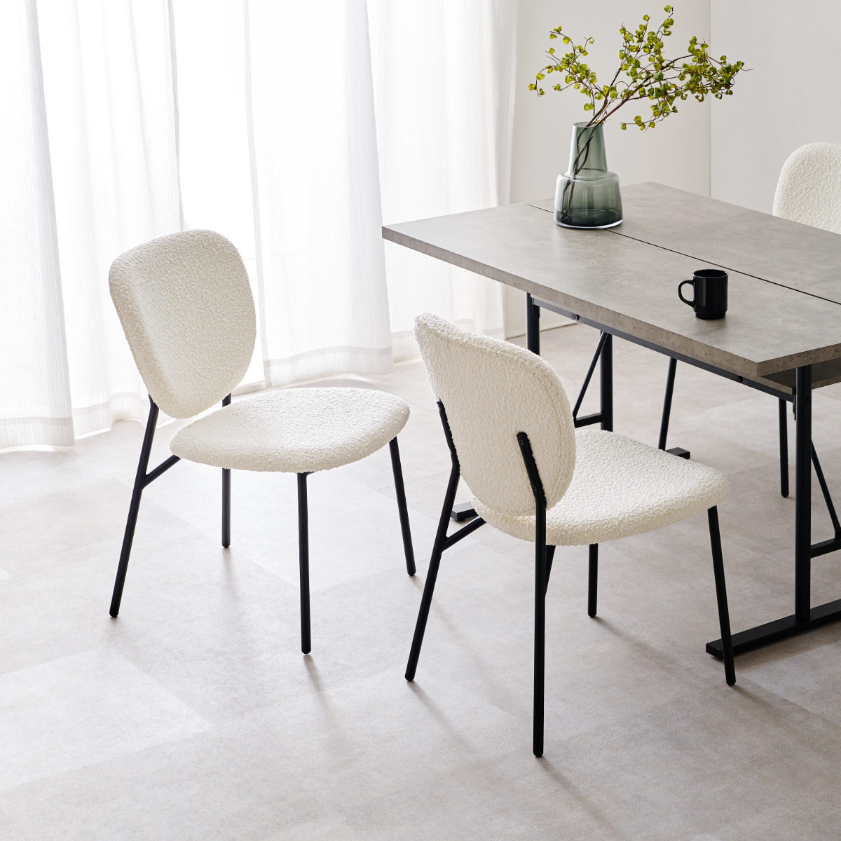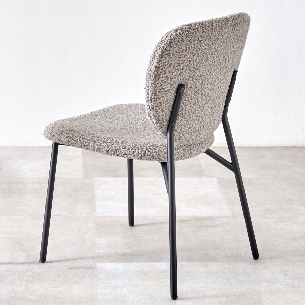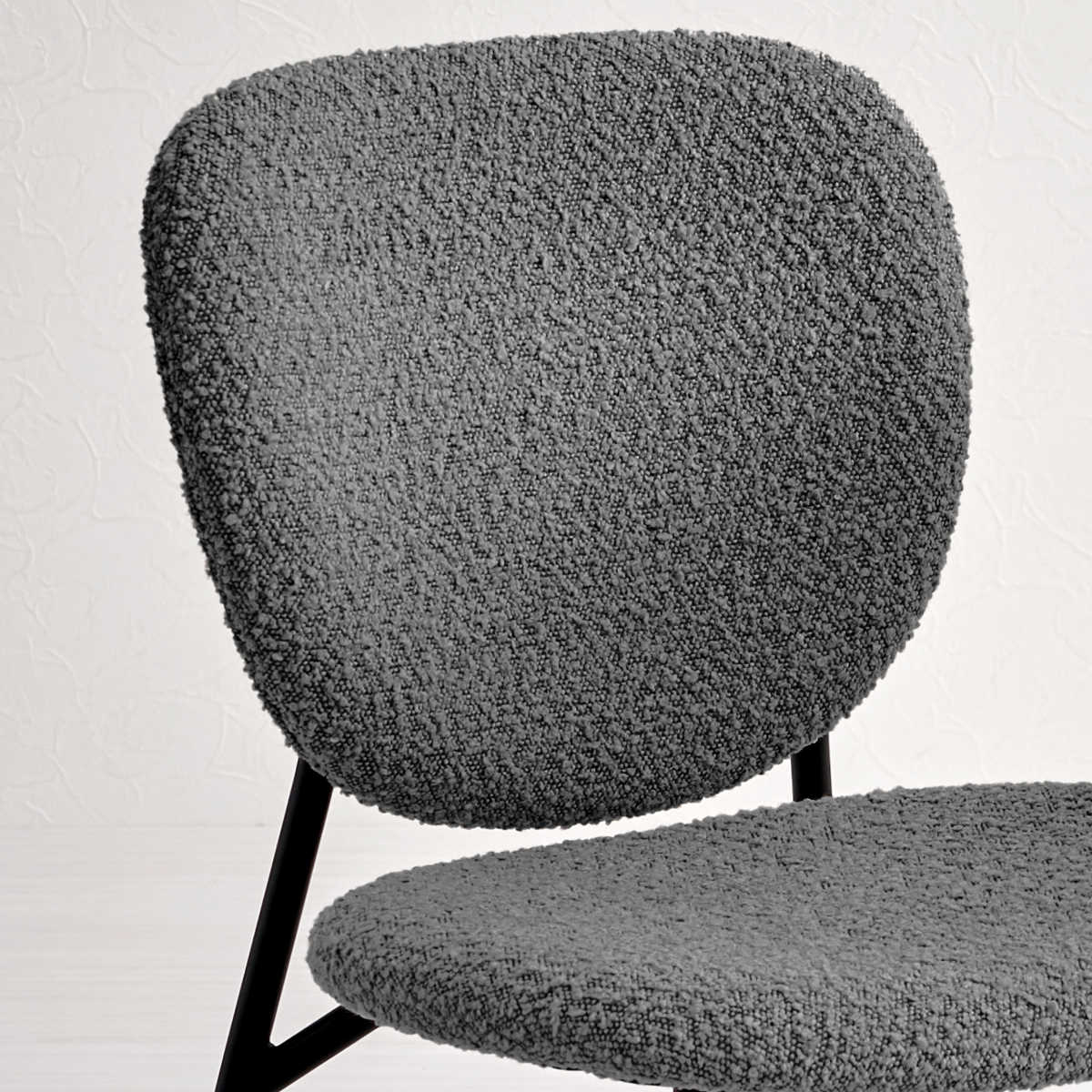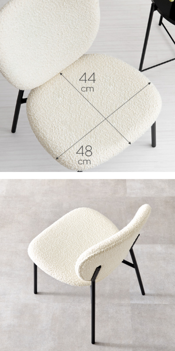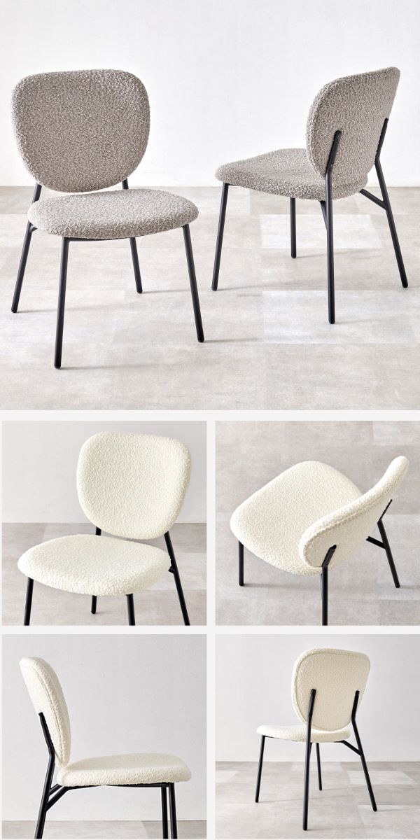 独特な質感のブークレ生地とブラックスチール脚の異素材を組み合わせたダイニングチェアです。モダンな雰囲気の中にも温かみのある空間を演出してくれます。