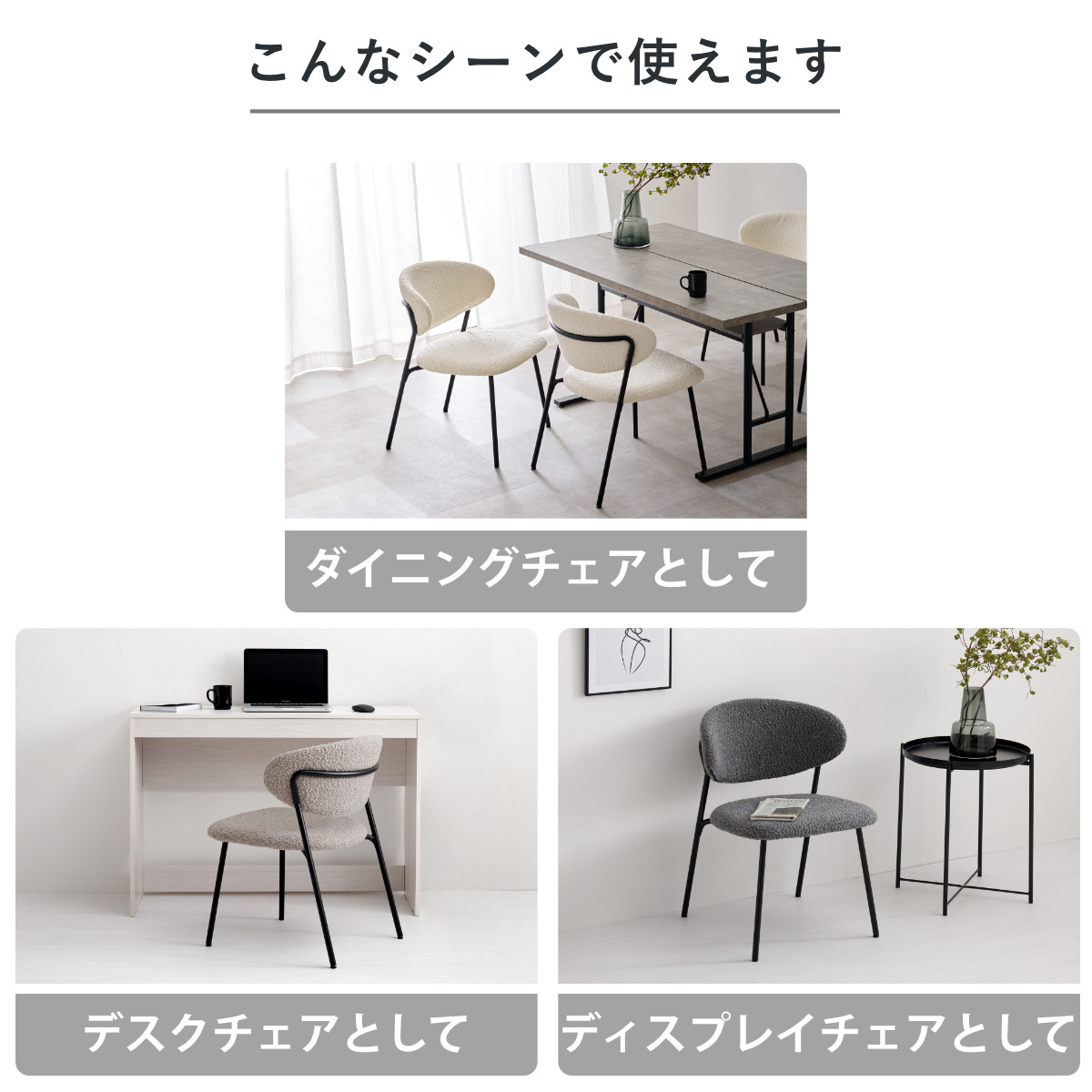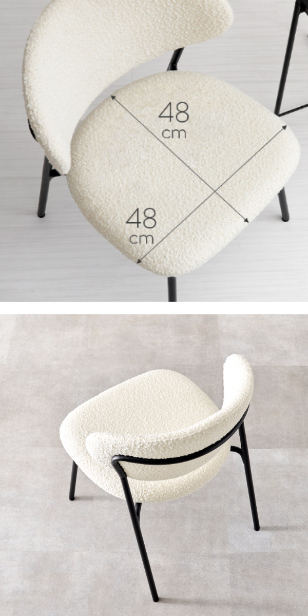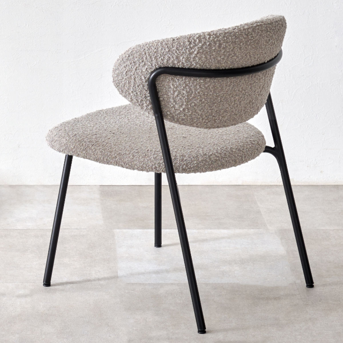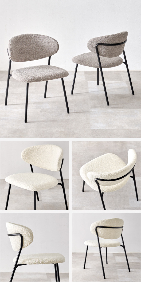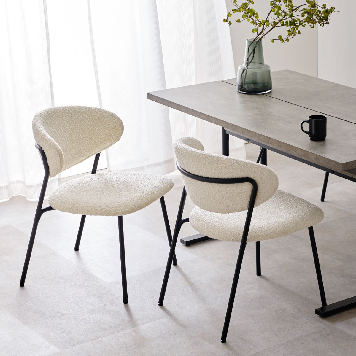 独特な質感のブークレ生地とブラックスチール脚の異素材を組み合わせたダイニングチェアです。モダンな雰囲気の中にも温かみのある空間を演出してくれます。