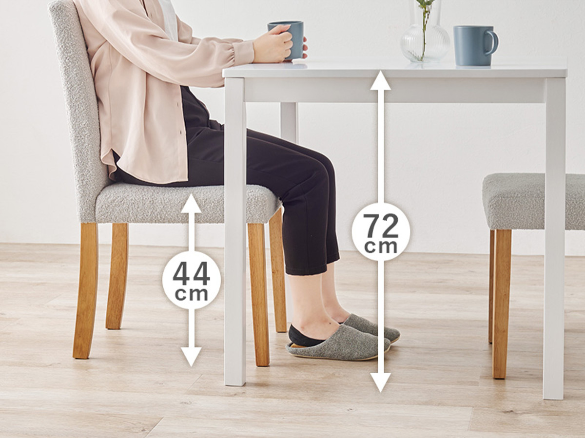 チェアとテーブルはバランスの良い高さにこだわって設計されています。脚がスッキリと収まり、毎日の食事や作業の時間を快適に過ごせます。