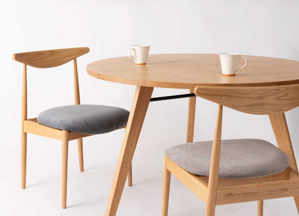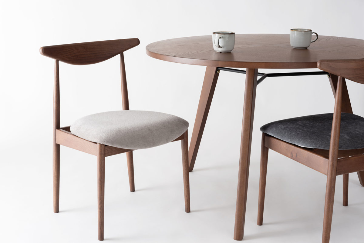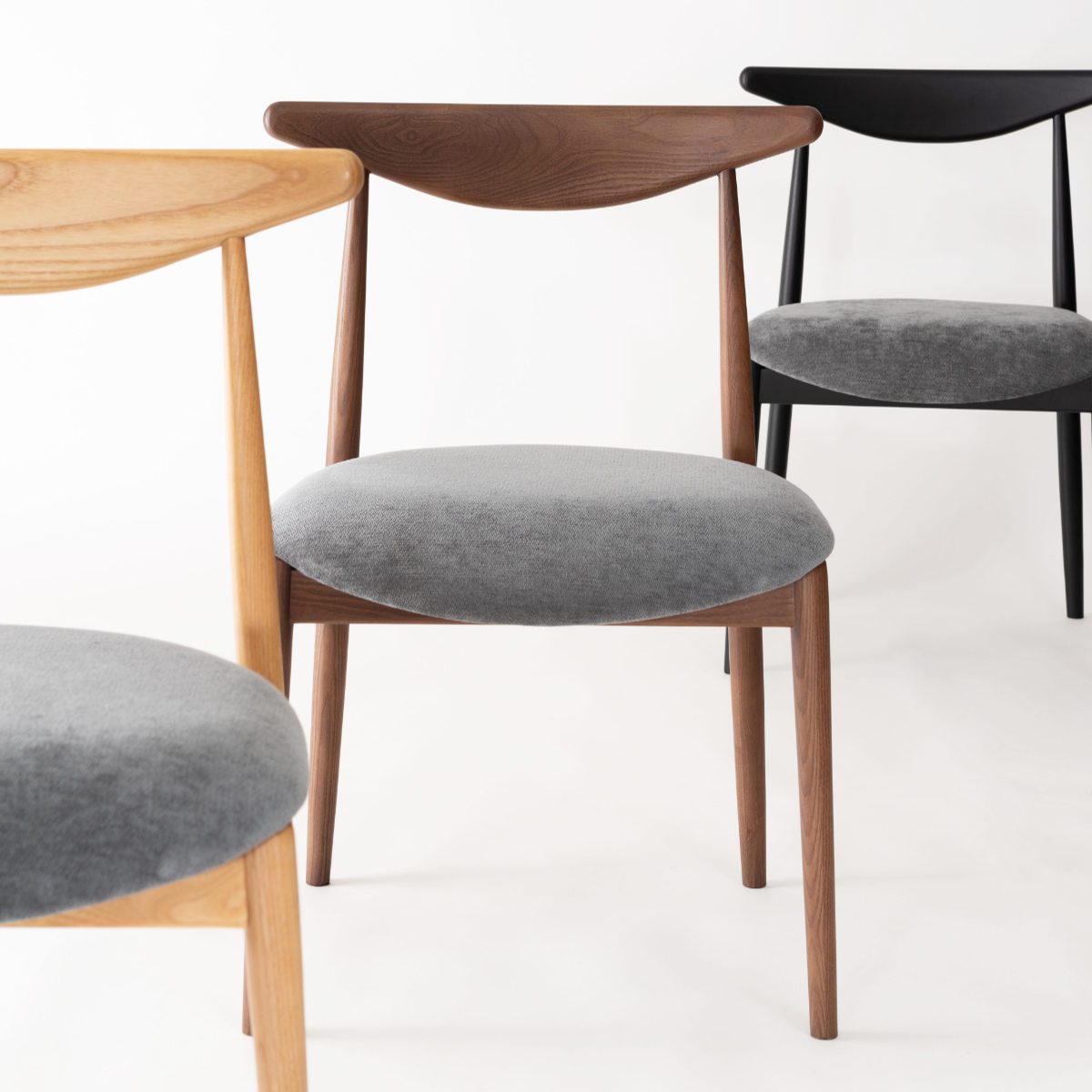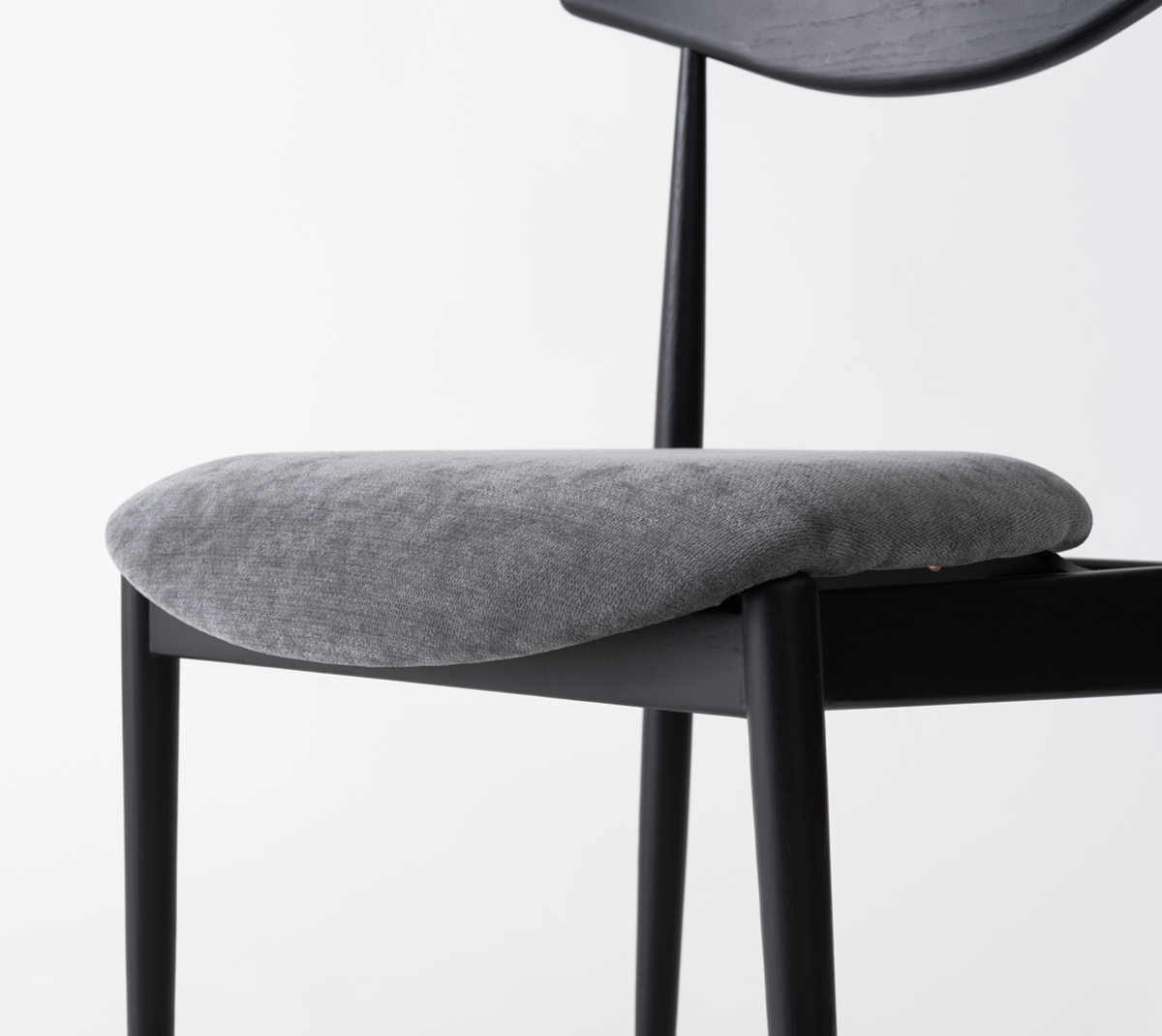 前垂れの座面が立体感を与える、アート作品のようなダイニングチェア