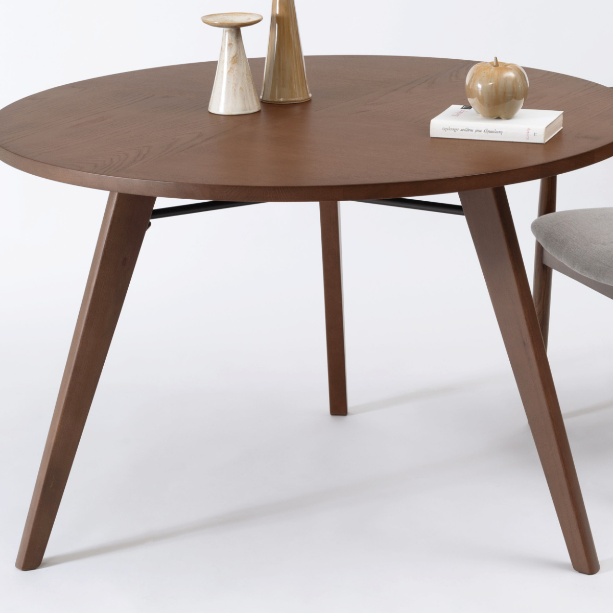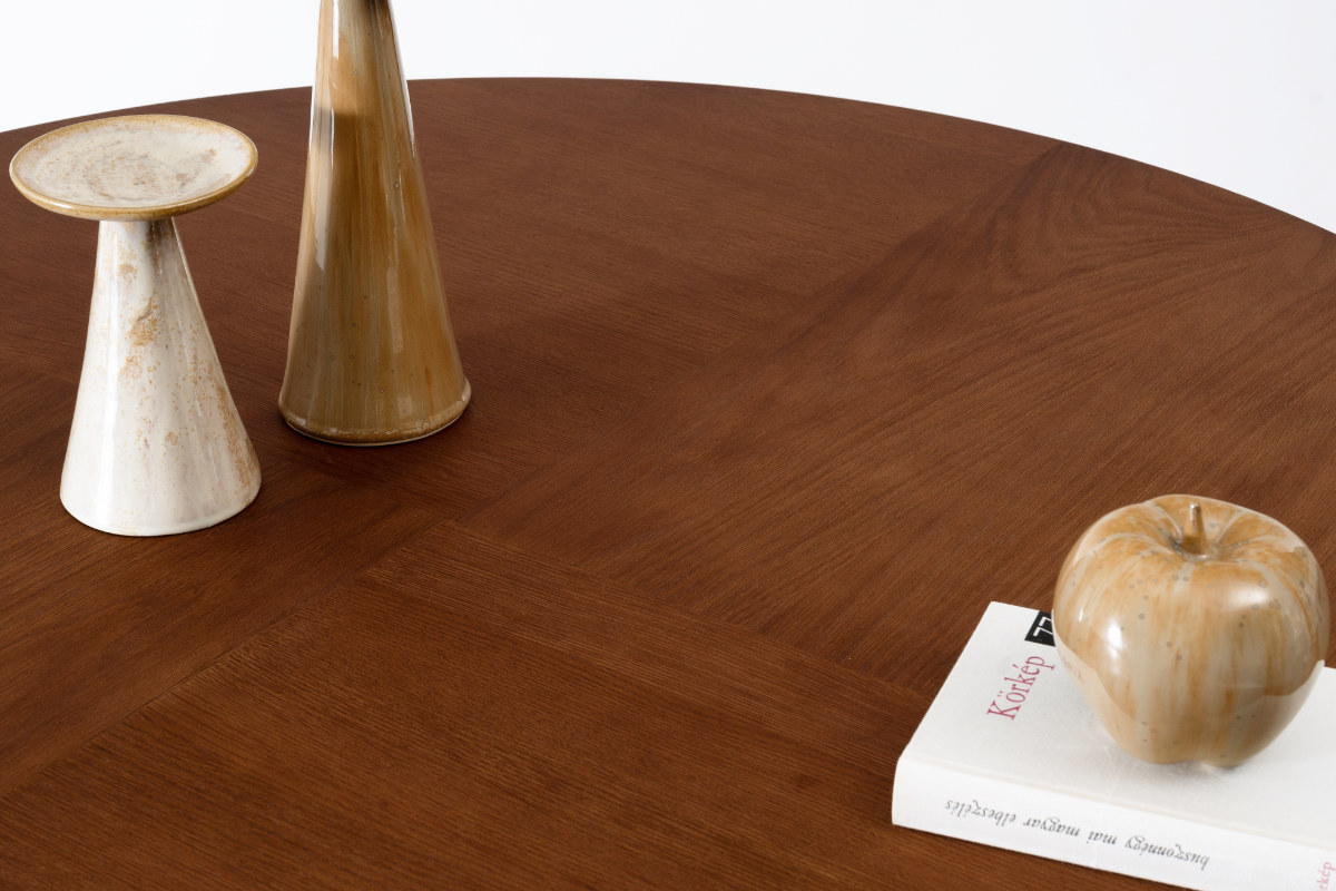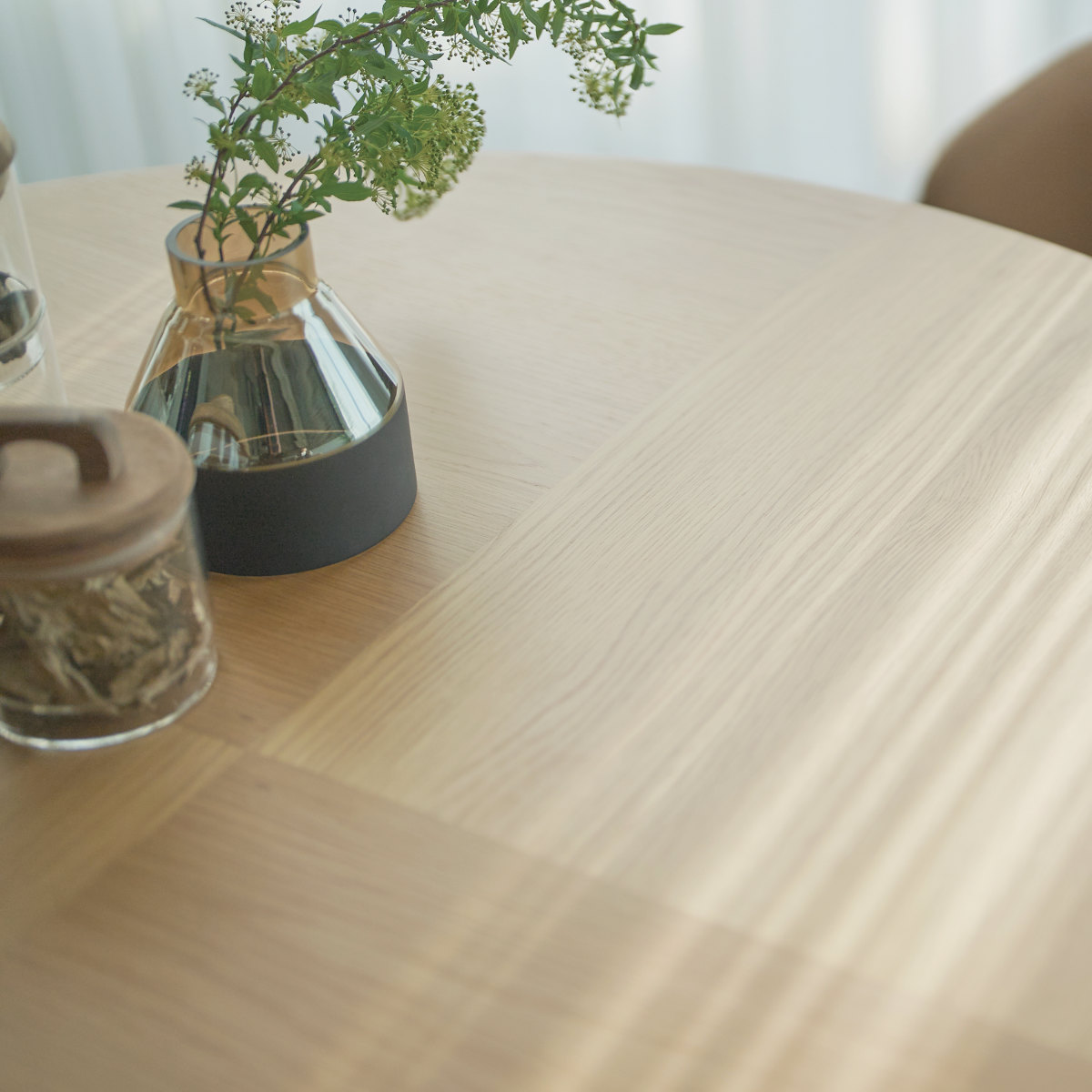 オークの天然木を使用したラウンド型のダイニングテーブルです。会話が生まれやすいラウンド型のテーブルは直径110cmで、3人で食卓を囲むのにちょうどいい大きさです。