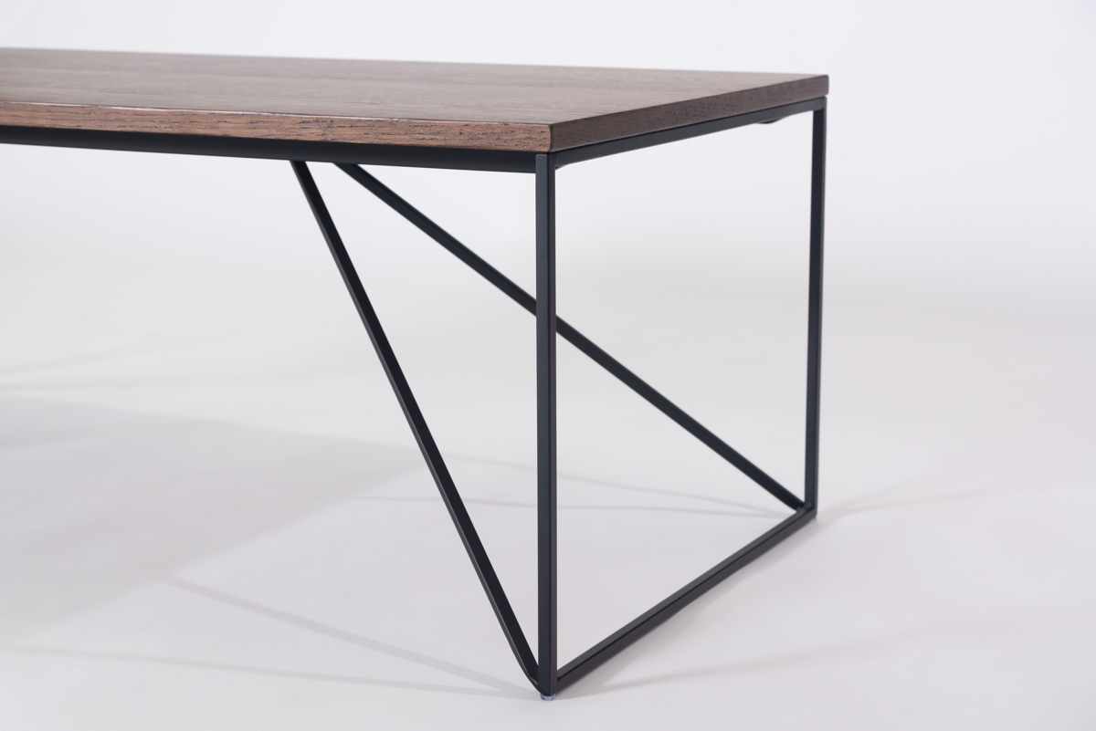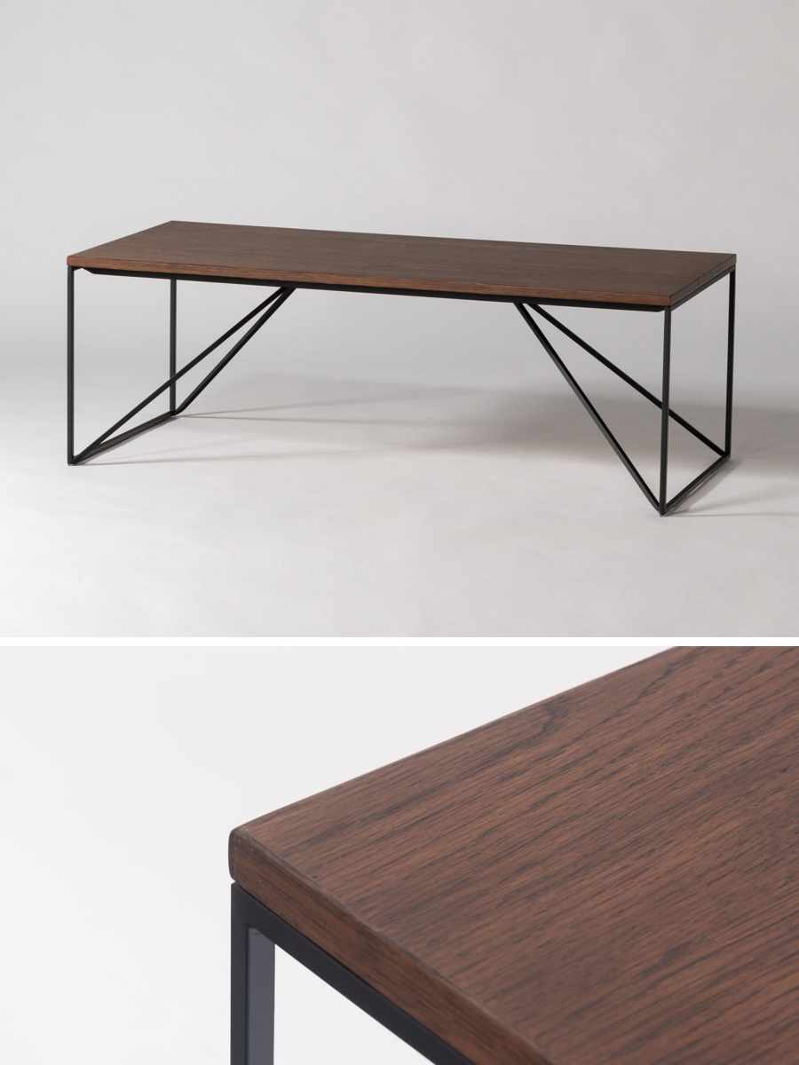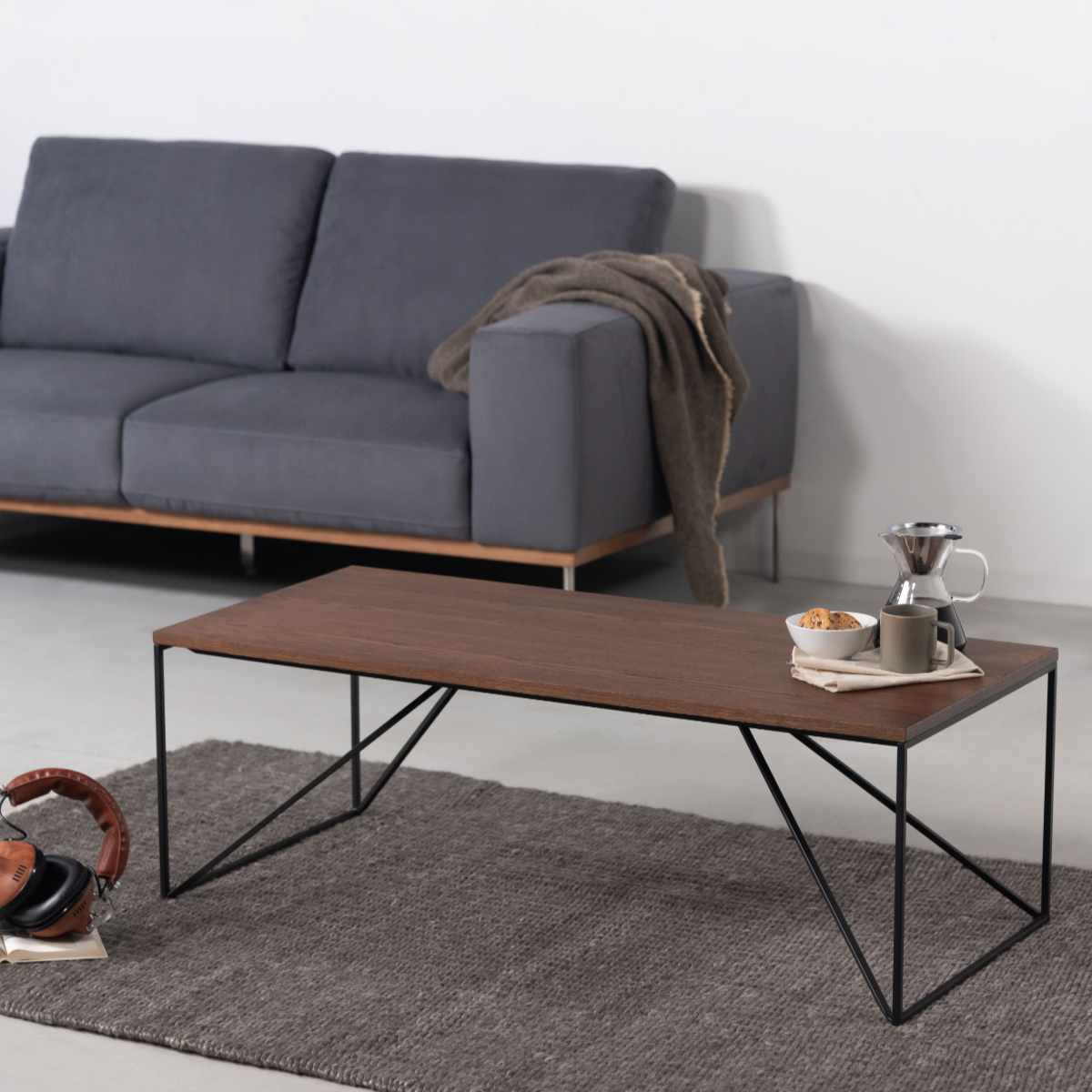 直線のみで構成された、シャープなデザインのリビングテーブルです。ブラックの無機質なアイアン脚に、天然木の温もりをプラス。角度によって違った表情を見せてくれます。組み立てが不要な完成品なので、届いてすぐにお使いいただけます。