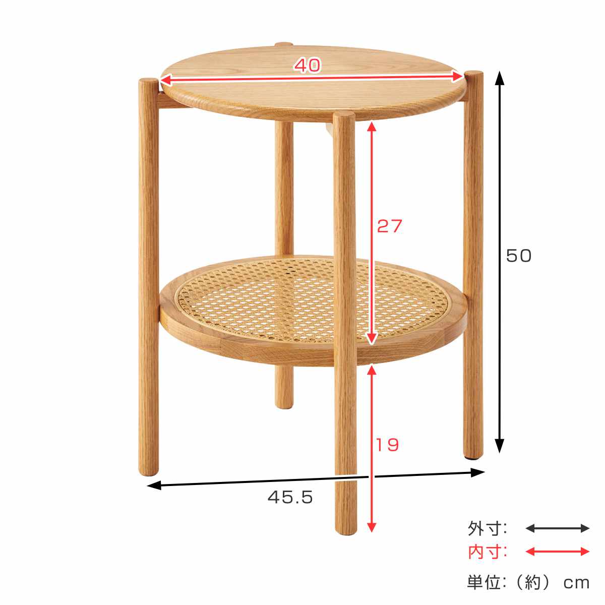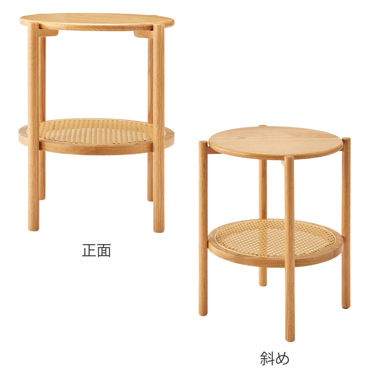 美しいオーク材の天板に、アクセントとなる人工ラタンの棚板をプラスしたサイドテーブルです。天板はエッジの角を落とし、細身の丸脚と組み合わせることで、優しくモダンな印象に。