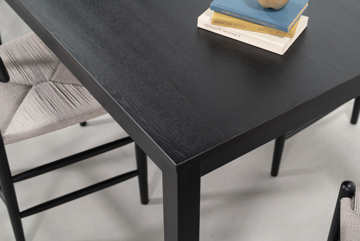 エッジの効いた直線的なデザインのダイニングテーブルです。オークの木目が際立つ突板貼りの天板と、重厚感のあるオークの脚部が魅力です。どのカラーもモダンで上品な雰囲気で、置くだけで空間を引き締めます。